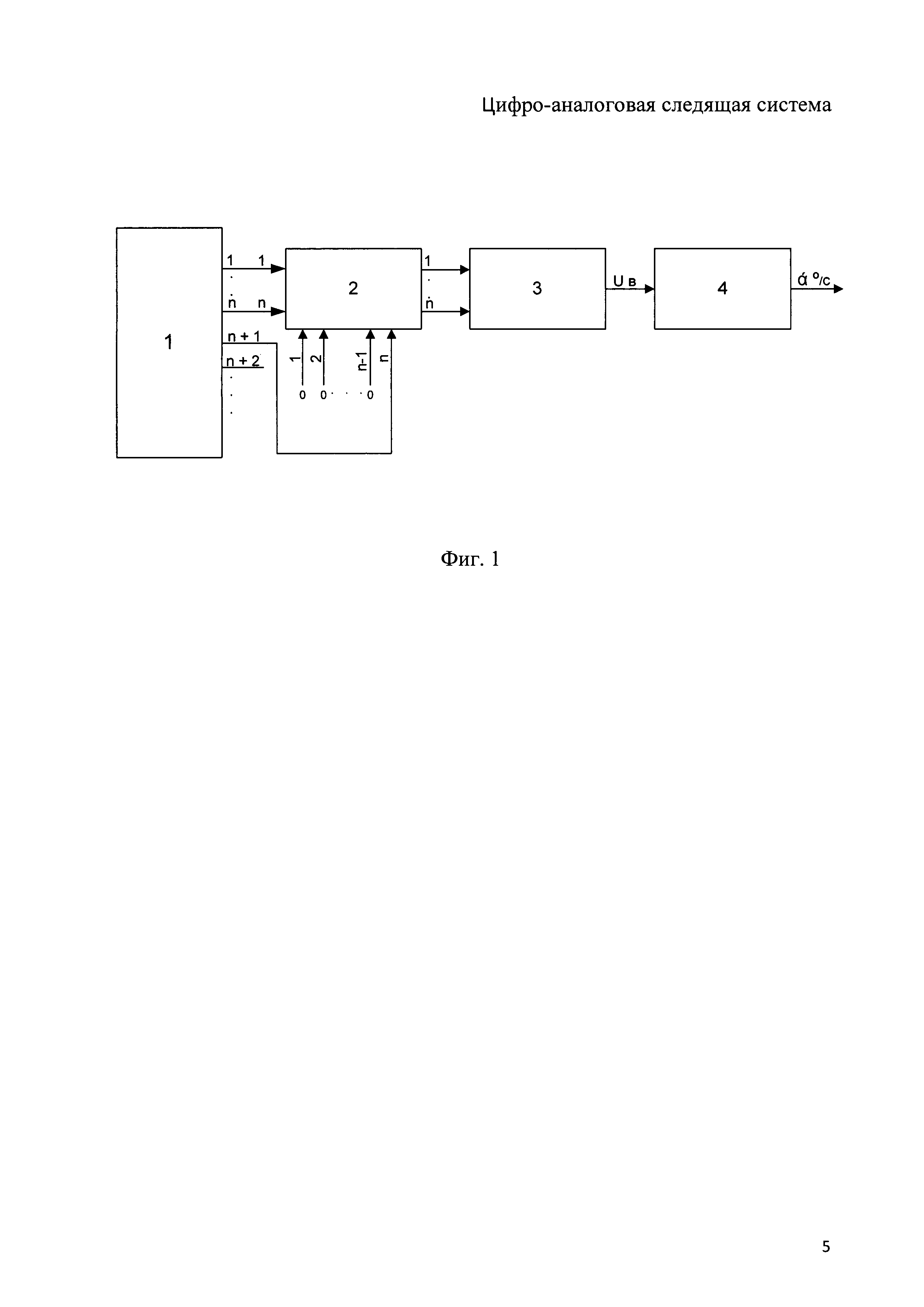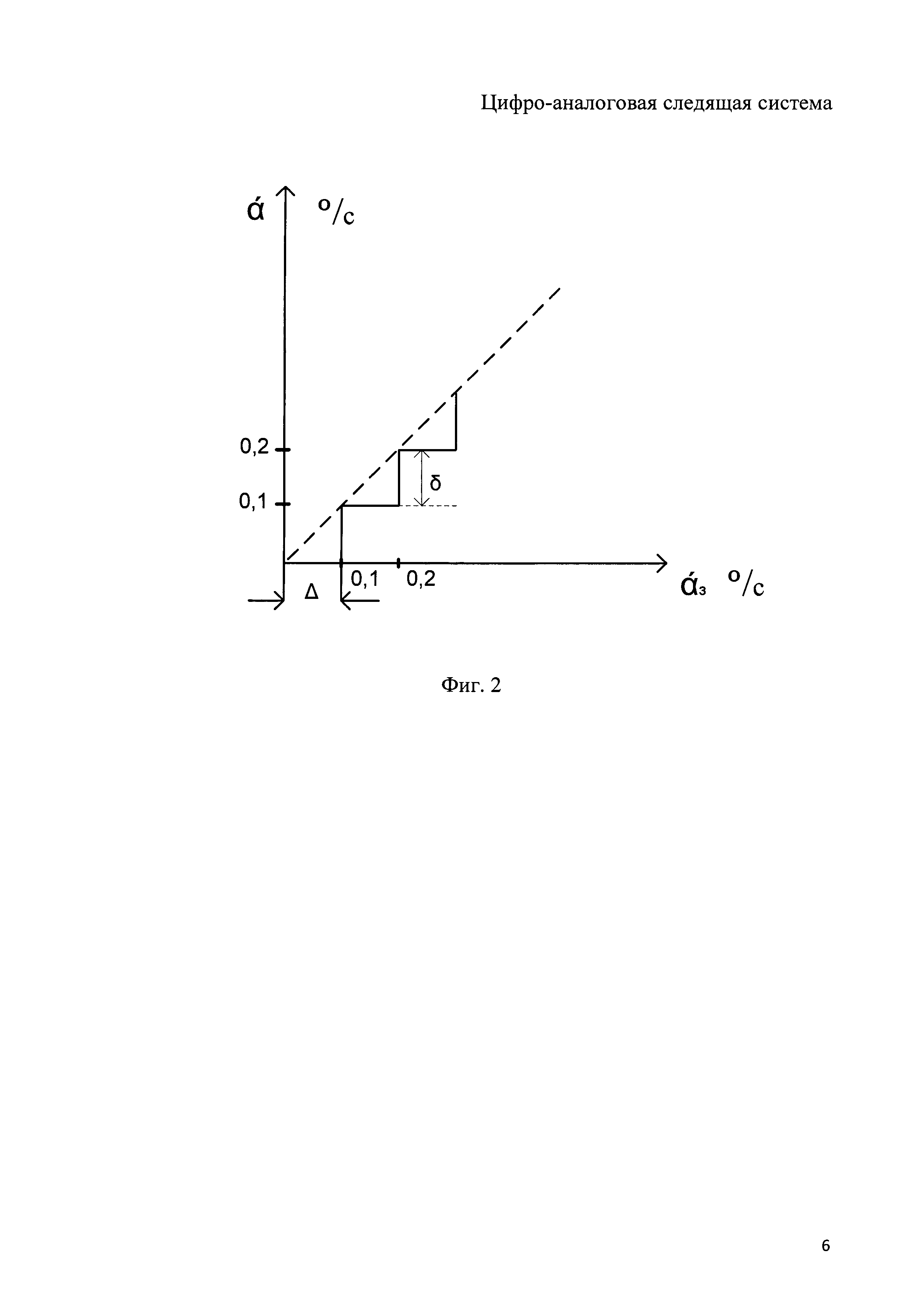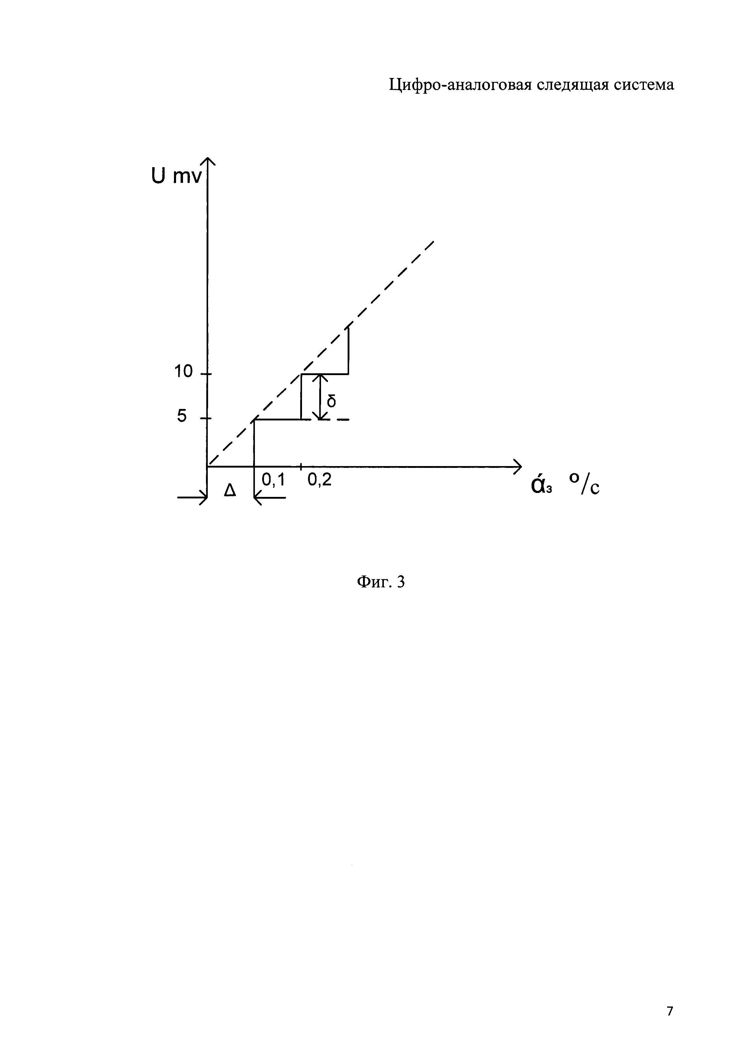 Изобретение относится к области автоматики и может быть использовано при построении следящих систем, управляемых от цифровых вычислительных устройств. Известна аналого-цифровая следящая система (авторское свидетельство №557351, СССР, 09.07.1977 г.), взятая за прототип, которая содержит: цифровое вычислительное устройство (ЦВУ), которое является задающим устройством, цифро-аналоговый преобразователь (ЦАП) и привод. Недостатком прототипа является повышенные ошибки воспроизведения скорости на ее нижнем пороге. Технический результат предлагаемого изобретения заключается в уменьшении ошибки воспроизведения скорости приводом и зоны нечувствительности следящей системы, и, как следствие, в повышении точности системы. Указанный технический результат достигается за счет того, что в цифро-аналоговую следящую систему, содержащую задающее цифровое вычислительное устройство, цифро-аналоговый преобразователь и скоростной привод между задающим цифровым вычислительным устройством и цифро-аналоговым преобразователем введен n-разрядный сумматор, при этом задающее цифровое вычислительное устройство формирует заданное значение скорости в виде параллельного двоичного кода, n старшие разряды которого поступают на первый вход n-разрядного сумматора, а «n+1» разряд поступает на второй вход младшего разряда n-разрядного сумматора, а по остальным разрядам на второй вход n-разрядного сумматора поступают постоянные нули. Изобретение поясняется следующими чертежами: На фиг. 1 представлена блок-схема цифроаналоговой следящей системы, где: 1 - задающее цифровое вычислительное устройство (ЦВУ), 2 - n-разрядный сумматор, 3 - цифро-аналоговый преобразователь, 4 - скоростной привод. На фиг. 2, 3 представлены графики отработки скорости на нижнем пороге прототипа. На фиг. 4, 5 представлены графики отработки скорости на нижнем пороге предлагаемой цифро-аналоговой следящей системы. Изобретение осуществляется следующим образом. Задающее ЦВУ соединено со скоростным приводом, который воспроизводит скорость, через цифро-аналоговый преобразователь (ЦАП), как показано на фиг. 1. Скоростной привод содержит электродвигатель, редуктор, датчик скорости и усилительно-преобразующие устройства (на фиг. 1 не показано). Задающее ЦВУ формирует заданное значение скорости Эффективность предложенного устройства поясняется на фиг. 2, 3, 4, 5, где приведена статическая характеристика отработанной скорости По оси абсцисс откладываются заданные значения скорости с квантом, соответствующим кванту «n+1» разряда задающего ЦВУ. Для конкретного примера: для 12-ти разрядного ЦАП с напряжением Umax равным 10 В и привода с максимальной отработанной скоростью Таким образом, предложенное устройство позволяет в два раза улучшить отработку скорости на нижнем пороге без использования дорогих высокоразрядных ЦАП за счет использования в цифровом коде, формируемом задающим ЦВУ, дополнительного разряда «n+1».