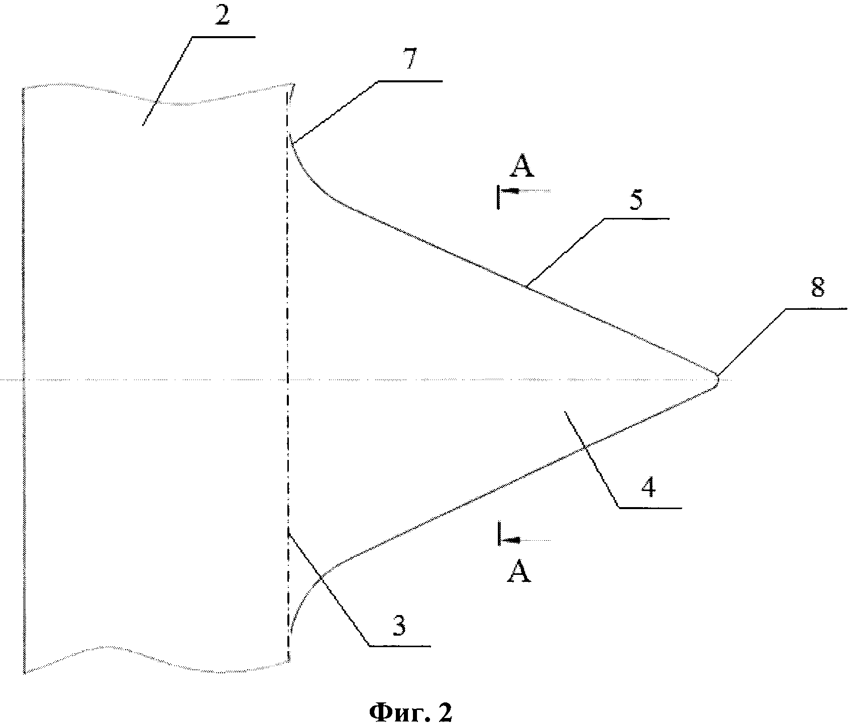 Изобретение относится к области двигателестроения, в частности к реактивным соплам с устройствами подавления шума, и предназначено для использования в авиационных двигателях. В области авиационного двигателестроения существует проблема, связанная с необходимостью создания сопел с низким уровнем шума, генерируемого струей. Наиболее близким к заявляемой конструкции является шевронное сопло, содержащее выхлопную трубу, на выходном торце которой расположены шевроны треугольной формы (Патент US 6532729, В63Н 11/00, 18.03.2003). Известное устройство имеет недостаток, обусловленный тем, что отсутствие ограничений на угол внедрения шеврона в газовый поток может приводить к усилению высокочастотного шума и уменьшению гашения шума. Прямолинейные и заостренные (сведенные на нет) кромки шевронов не позволяют получить дополнительного вихреобразования для увеличения акустического эффекта, снижения шума. Указанные выше недостатки устраняются в заявляемом изобретении. Технический результат заявленного изобретения заключается в снижении шума и уменьшении аэродинамических потерь при работе. Заявленный технический результат достигается тем, что шевронное сопло газотурбинного двигателя, включающее выхлопную трубу, а также сопла наружного и внутреннего контуров, которые имеют на выходе шевроны треугольной формы, при этом шевроны имеют профилированные кромки, причем шевроны сопла наружного контура наклонены под углом 6-8° к линии тока на выходе сопла наружного контура, представляющей собой среднюю линию между касательной к внутренним обводам сопла наружного контура и касательной к внешним обводам сопла внутреннего контура, а шевроны сопла внутреннего контура наклонены под углом 4-6° к линии тока на выходе сопла внутреннего контура, представляющей собой среднюю линию между касательной к внутренним обводам сопла внутреннего контура и касательной к внешним обводам центрального тела. При этом кромки шевронов могут быть выполнены выпуклой формы. Кромки шевронов могут быть выполнены вогнутой формы. Кромки шевронов могут быть выполнены прямой формы. Представленная конструкция шевронного сопла с оптимизированным углом наклона шевронов позволяет уменьшить шум на 0,5-1,2 EPNdB (фактически воспринимаемый шум в децибелах), избежав появления паразитного высокочастотного шума, а профилирование кромок шеврона и использование определенным образом выполненных краев кромок позволяет снизить потери полного давления на 0,03-0,05%. Данный технический результат был подтвержден при испытании моделей заявленного устройства в ФГУП «ЦИАМ им. П.И. Баранова», а также при испытаниях опытных образцов в составе газотурбинного двигателя на испытательных стендах ОАО "Авиадвигатель". Выбор углов 6-8° наклона шевронов к линии тока на выходе сопла наружного контура и углов 4-6° наклона шевронов к линии тока на выходе сопла внутреннего контура (углов внедрения шевронов в поток) обусловлен тем, что при указанных углах достигается наиболее эффективное подавление шума при минимальной потере полного давления. Выполнение каждого из шевронов с профилированными кромками, имеющими определенным образом выполненные края, обеспечивает получение дополнительного вихреобразования и, как следствие, дополнительное снижение шума. При перетекании газа через кромку шеврона проис
