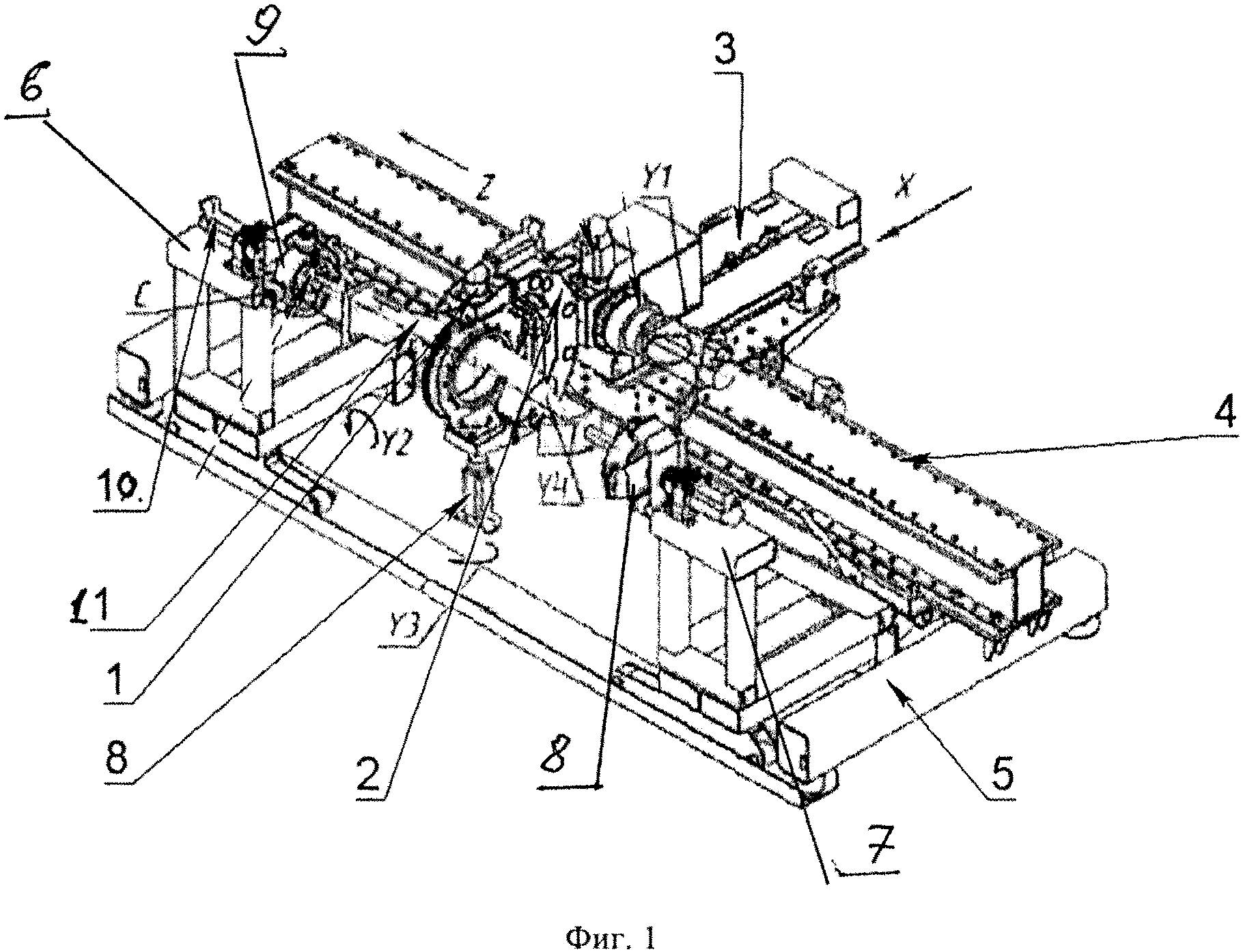 Изобретение относится к области станкостроения, в частности к намоточным станкам с ЧПУ, и может быть использовано для изготовления сопел, топливных труб высокого давления, в том числе для криогенных магистралей, из полимерных композиционных материалов. Известен станок намоточный, содержащий приводную и опорную бабки, расположенные на станине, каретку, имеющую возможность перемещения по направляющим, проложенным вдоль оси станка. На каретке установлен лентопротяжный тракт, включающий в себя бобину с лентой. На валу бобины установлен тормоз, создающий предварительное натяжение ленты, постоянство предварительного натяжения которой обеспечивается устройством, отслеживающим изменения диаметра рулона ленты. Рабочее натяжение ленты при намотке ее на оправку обеспечивается натяжным устройством. В состав лентопротяжного тракта также входит устройство слежения и корректировки положения кромки ленты, выполненное в виде замкнутой цепи, натянутой на две звездочки, одна из которых является приводной. На каждом звене цепи в обоймах на осях в подшипниках расположены свободно вращающиеся шинованные ролики, а под одной из ветвей цепи, контактирующей с наматываемой лентой, установлена пластина, взаимодействующая с элементами цепи и исключающая прогиб цепи от натяжения ленты При работе станка лента с бобины при заправке проводится через весь лентопротяжный тракт и закрепляется на оправке. При вращении оправки и перемещении каретки с лентопротяжным трактом с заданным шагом вдоль оси станка полосы ленты ложатся с таким же шагом на оправку, формируя изделие. Устройство слежения и корректировки положения кромки ленты, по сигналу об ее отклонении от заданного положения, производит сдвиг ленты в сторону, противоположную уклону оправки, выравнивая положение ленты на оправке, то есть происходит дискретная корректировка положения ленты на оправке при отслеживании положения ее кромки (см. патент РФ №2488541, кл. В65Н 18/08, 2013 г.) - наиболее близкий аналог. В результате анализа известного намоточного станка необходимо отметить, что он имеет невысокую точность регулирования величины натяжения материала (жгута), так как натяжное устройство не отслеживает реального натяжения ленты материала в течение всего цикла намотки. Техническим результатом заявленного изобретения является повышение качества намотки изделий за счет повышения точности регулирования натяжения жгута с учетом изменения скорости протяжки жгута в широком диапазоне (в том числе компенсации рывков и провисов материала), расширения регулируемого диапазона натяжения, компенсации изменения момента инерции шпулярника в процессе намотки при изменении его массы и диаметра. Указанный технический результат обеспечивается тем, что в станке намоточном, содержащем станину, на которой смонтированы намоточная головка, передняя и задняя бабки, предназначенные для установки, закрепления и приведения во вращение оправки, предназначенной для намотки на нее жгута со шпулярника при формировании изделия, а также механизм регулирования натяжения жгута, новым является то, что механизм регулирования натяжения жгута выполнен в виде вилки, установленной центральной частью на оси с возможностью поворота, на концах вилки установлены валы, через которые пропущен жгут, механизм регулирован