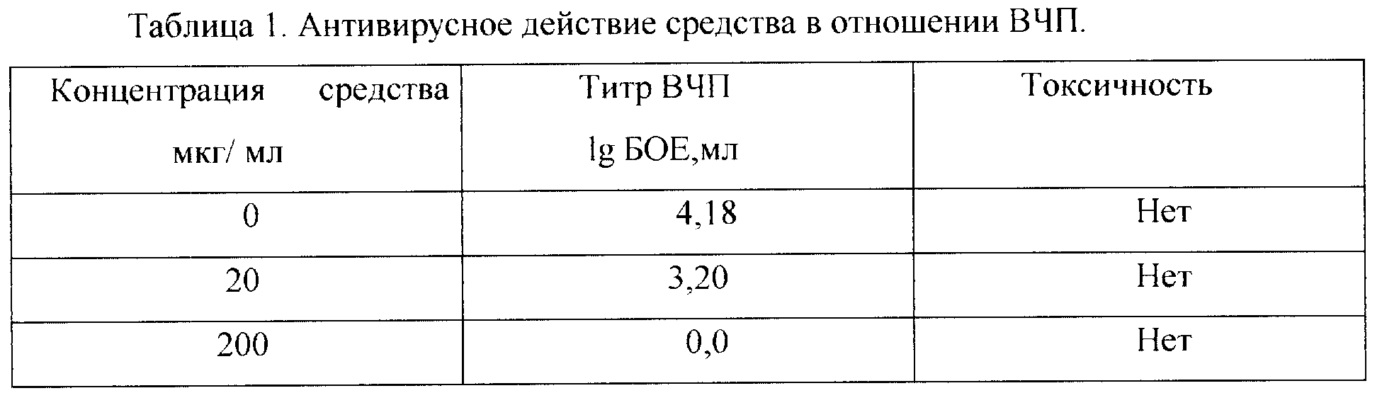 трехкратно. Усредненные результаты представлены в табл. 1. Таким образом, средство обладает высоким, дозозависимым ингибирующим действием в отношении ВЧП. 100%-ный