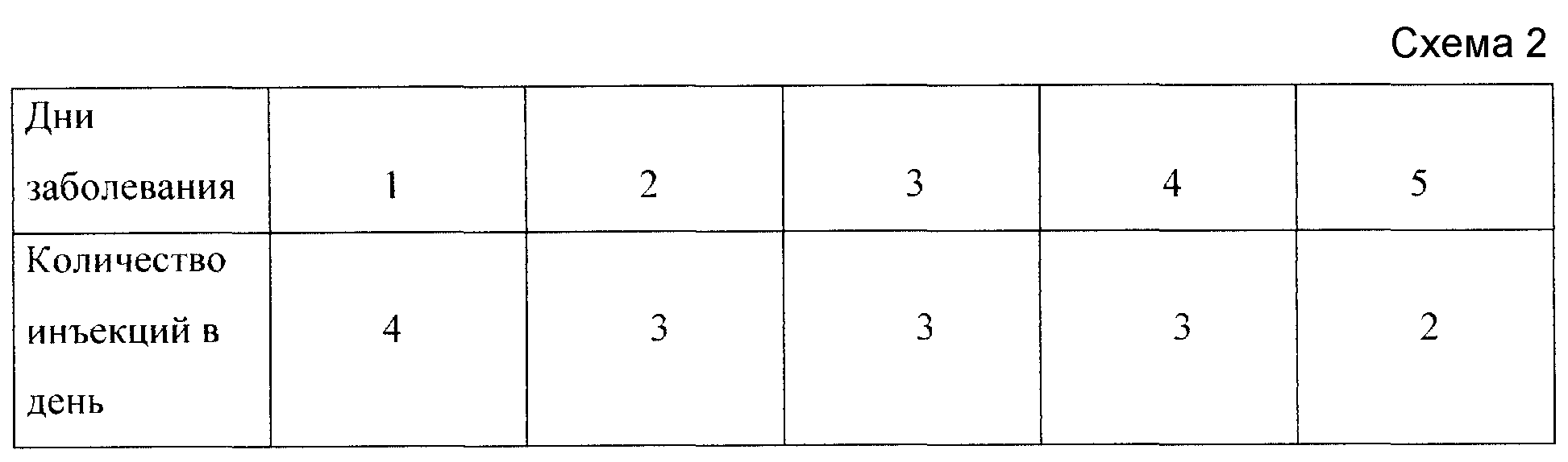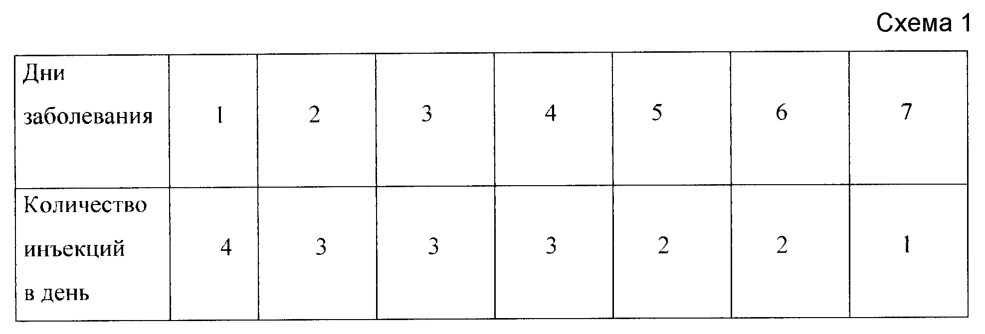 инъекциями - 4 - 6 ч); 2-й день - 3 инъекции (интервал 4-6 ч); 3-й день - 3 инъекции (интервал 4-6 ч); 4-й день - 6-й день - 2 инъекции (интервал 8 ч). При
