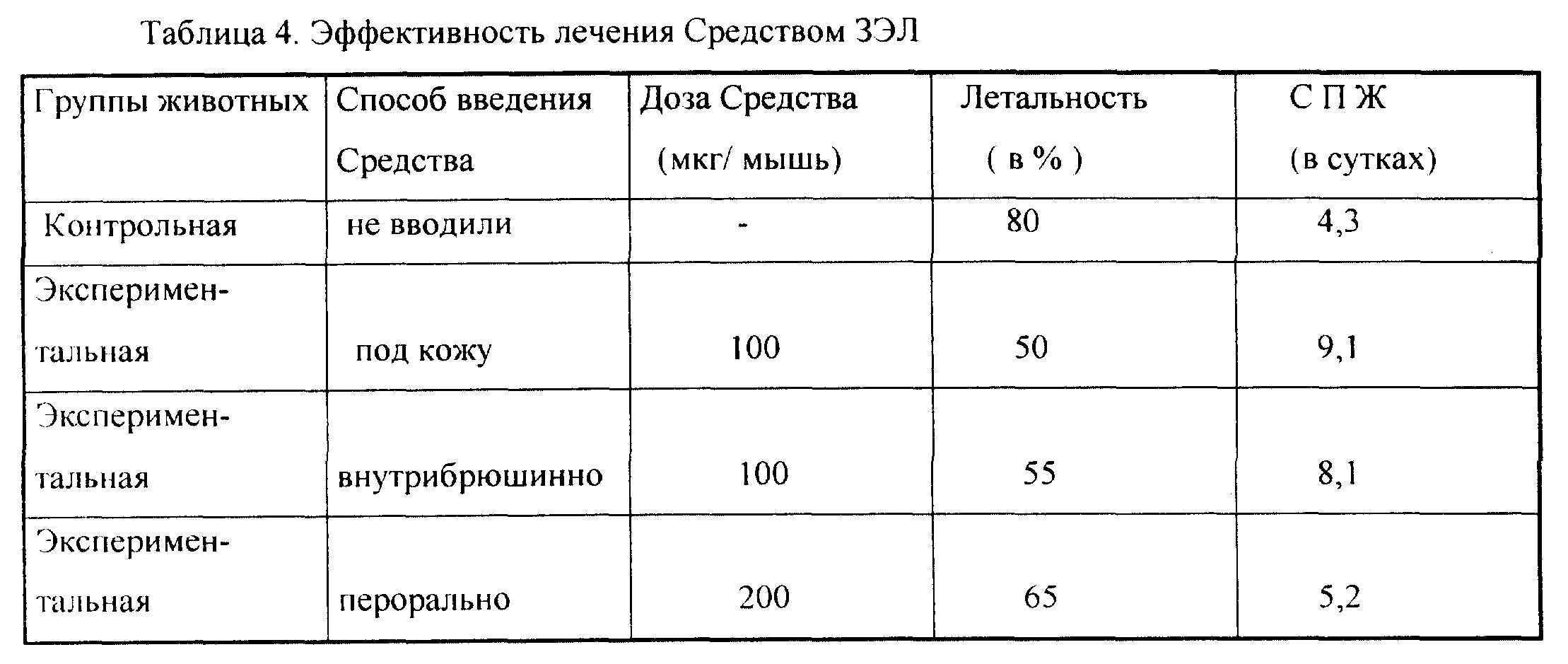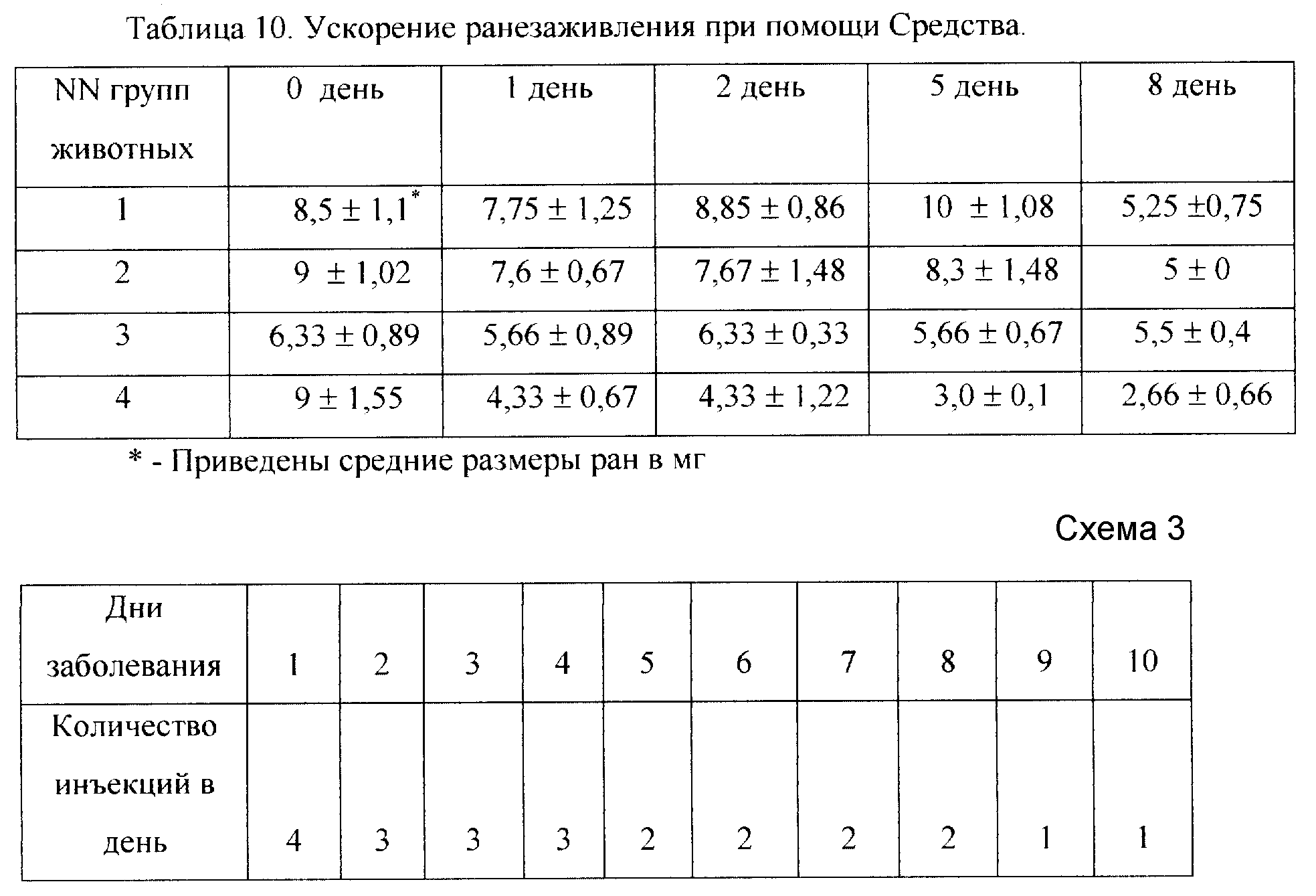ч); с 11 по 13 день - по 2 инъекции в сутки (через каждые 12 ч); 14 и 15 дни - по 1 инъекции в сутки. Все животные контрольной группы пали на 18-21-й дни после