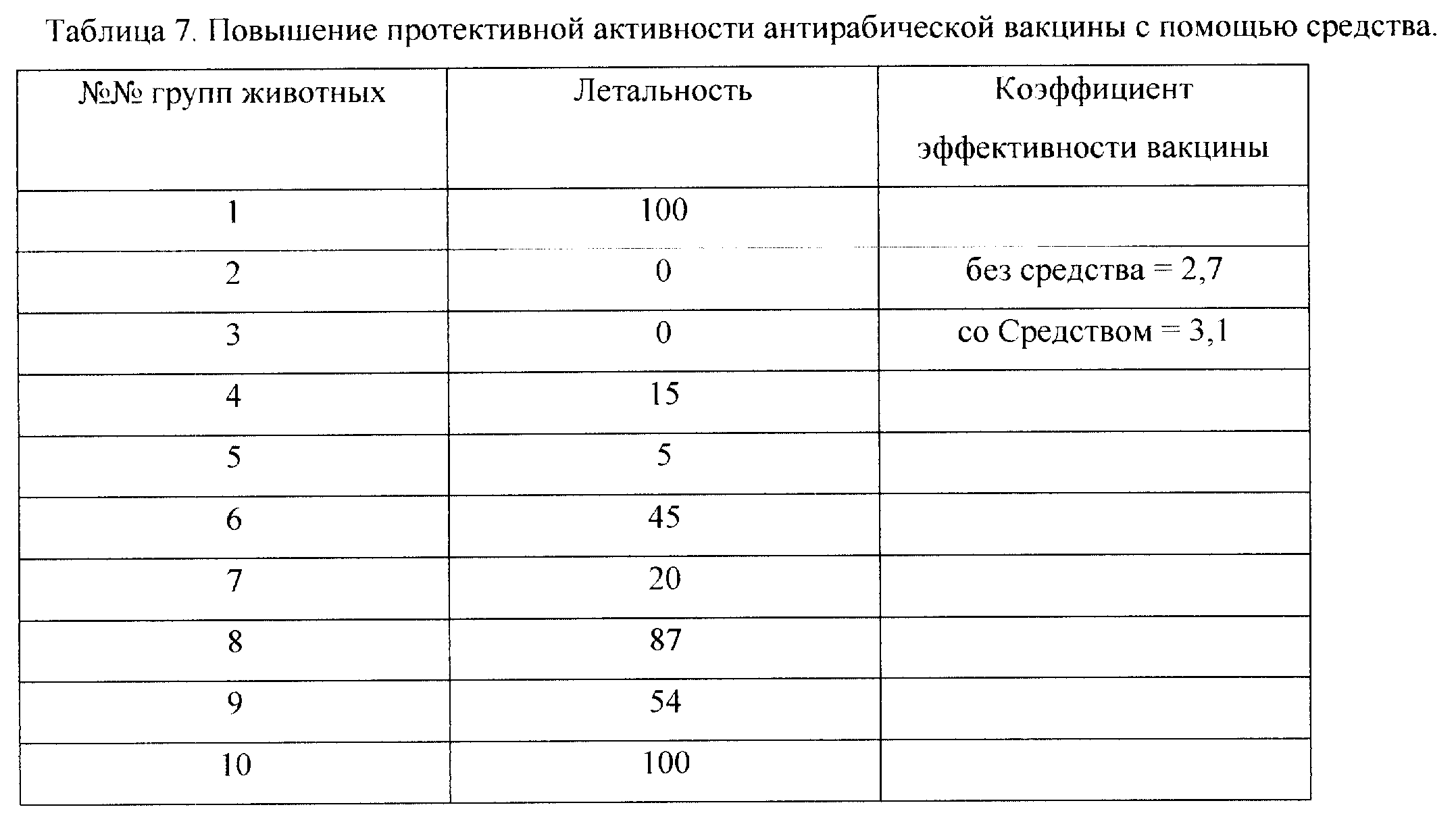 Данные, представленные в табл.7, показывают, что средство значительно повышает протективный эффект антирабической