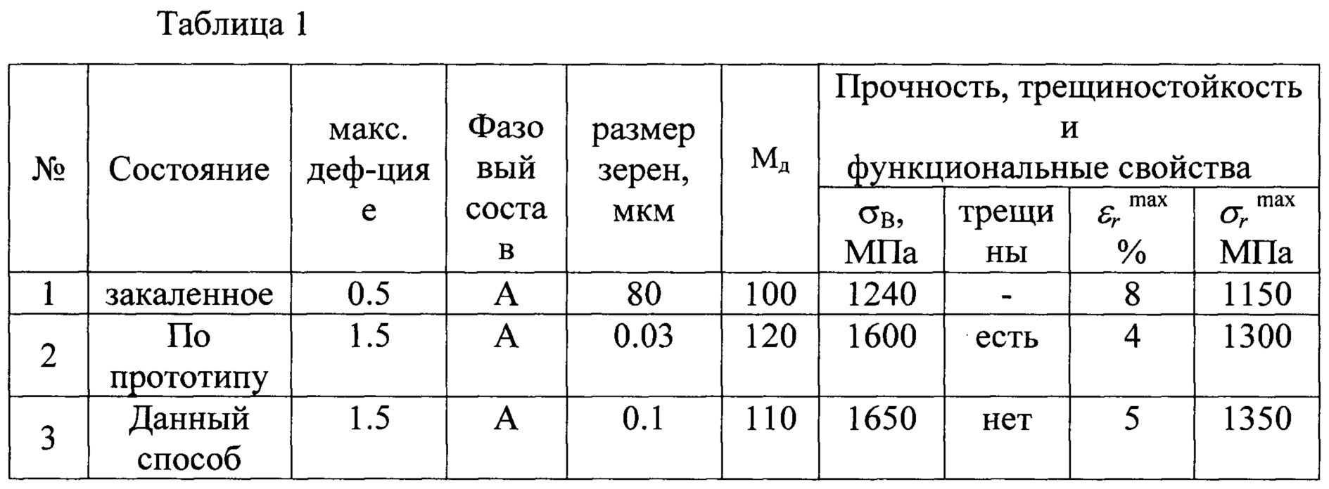 Изобретение относится к электропластической формообразующей обработке титан-никелевых сплавов для повышения их деформационной способности и эффекта памяти формы и может быть использовано в металлургии и машиностроении. Способ деформационной обработки длинномерных полуфабрикатов тонкого сечения из сплавов TiNiс эффектом памяти формы включает многопроходную прокатку предварительно закаленного полуфабриката в аустенитном состоянии при температуре деформации Т>Мдля сплавов TiNiпри х>0,3 и в мартенситном состоянии при температуре М<Т<Мдля сплавов TiNiпри х=0-0,3 и до достижения суммарной истинной степени деформации e>0,3, где Т- температура деформации, Ми М- температуры начала и конца прямого превращения, М- температура существования стабильного аустенита. При этом производят одновременное воздействие импульсным электрическим током плотностью 5-1000 А/мм, частотой 100-1000 Гц и длительностью 10-1000 мкс. Получают полуфабрикаты тонкого сечения из сплавов TiNiс эффектом памяти формы и с однородной ультрамелкозернистой структурой с размером зерен 50<d<500 нм, обладающие высокой деформационной способностью е>1 и высокой трещиностойкостью. Способ позволяет управлять параметрами структуры и обеспечивать комплекс высоких технологических и функциональных свойств. 2 з.п. ф-лы, 1 табл., 1 пр.