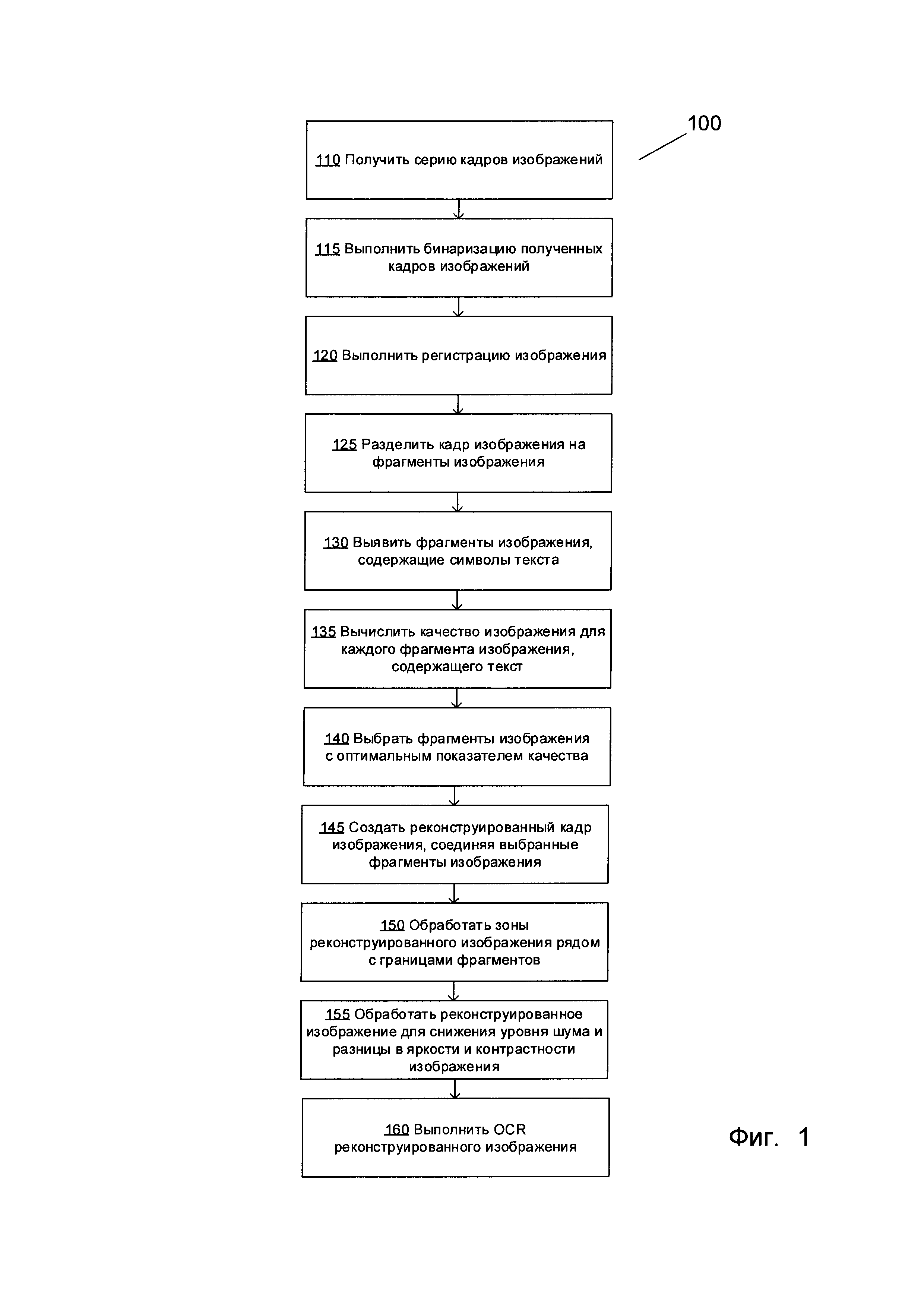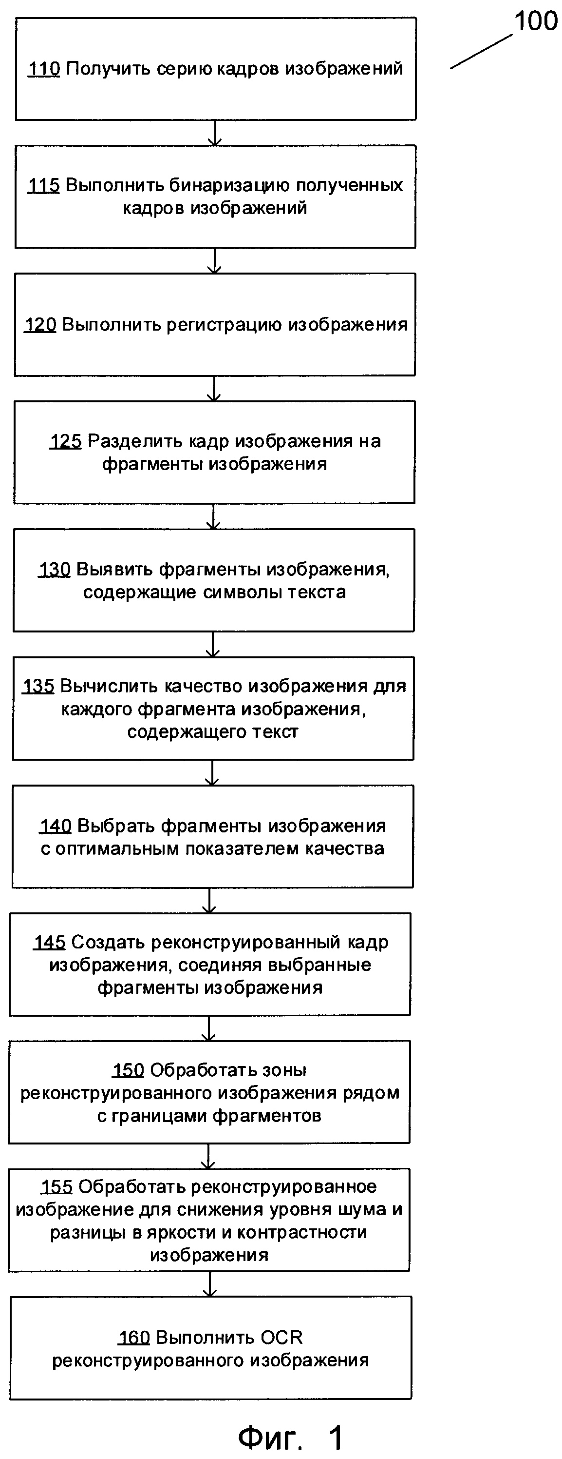 1. Способ реконструкции документа, содержащий: получение с помощью вычислительной системы множества кадров изображений, где каждый кадр изображения из множества кадров изображений содержит по меньшей мере часть изображения исходного документа; выявление множества присущих изображениям визуальных особенностей на множестве кадров изображения; выполнение пространственного выравнивания множества кадров изображений исходя из совпадений выявленных визуальных особенностей; разделение каждого из множества кадров изображений на множество фрагментов изображения; выявление одного или более фрагментов изображения с изображением текста во множестве фрагментов изображения; связывание каждого выявленного содержащего текст фрагмента изображения с кадром изображения, на котором этот фрагмент изображения имеет оптимальное значение заранее определенной метрики качества из значений метрики качества для этого фрагмента изображения на множестве кадров изображений; и создание реконструированного кадра изображения путем совмещения фрагментов изображения указанных связанных кадров изображений. 2. Способ по п. 1, в котором визуальными особенностями и/или визуальными артефактами являются по меньшей мере одно из следующего: различия в яркости, резкости, блики, смазы, разница в масштабе, различие углов съемки, различия положения документа в кадрах изображения, различия положения одного или более визуальных артефактов в кадрах изображения. 3. Способ по п. 1, дополнительно включающий: выполнение оптического распознавания символов (OCR) реконструированного кадра изображения. 4. Способ по п. 1, дополнительно включающий: постобработку реконструированного кадра изображения в области изображения, расположенной рядом с границей между фрагментами. 5. Способ по п. 3, отличающийся тем, что постобработка реконструированного кадра изображения также включает: выявление связных компонент, расположенных рядом с границей между фрагментами; связывание каждого пикселя связной компоненты с исходным изображением, на котором этот пиксель имеет максимальную резкость; выбор опорного изображения, которое связано с максимальным количеством пикселей связной компоненты; и копирование из выявленного опорного изображения фрагмента изображения, покрываемого связной компонентой, в реконструированное изображение. 6. Способ по п. 1, дополнительно включающий: постобработку реконструированного кадра изображения для снижения уровня шума. 7. Способ по п. 1, дополнительно включающий: постобработку реконструированного кадра изображения для уменьшения разницы по меньшей мере в одном из яркости изображения или контрастности изображения. 8. Способ по п. 1, дополнительно включающий: получение множества кадров изображений с помощью камеры, управляемой вычислительной системой. 9. Способ по п. 1, отличающийся тем, что множество кадров изображений включает по меньшей мере один кадр видеоизображения или фотоизображения. 10. Способ по п. 1, отличающийся тем, что разделение каждого из множества кадров изображений на множество фрагментов изображения также включает: определение одного или более размеров фрагмента изображения из множества фрагментов изображения, где фрагмент изображения содержит по меньшей мере одно из по меньшей мере заранее определенного количества 