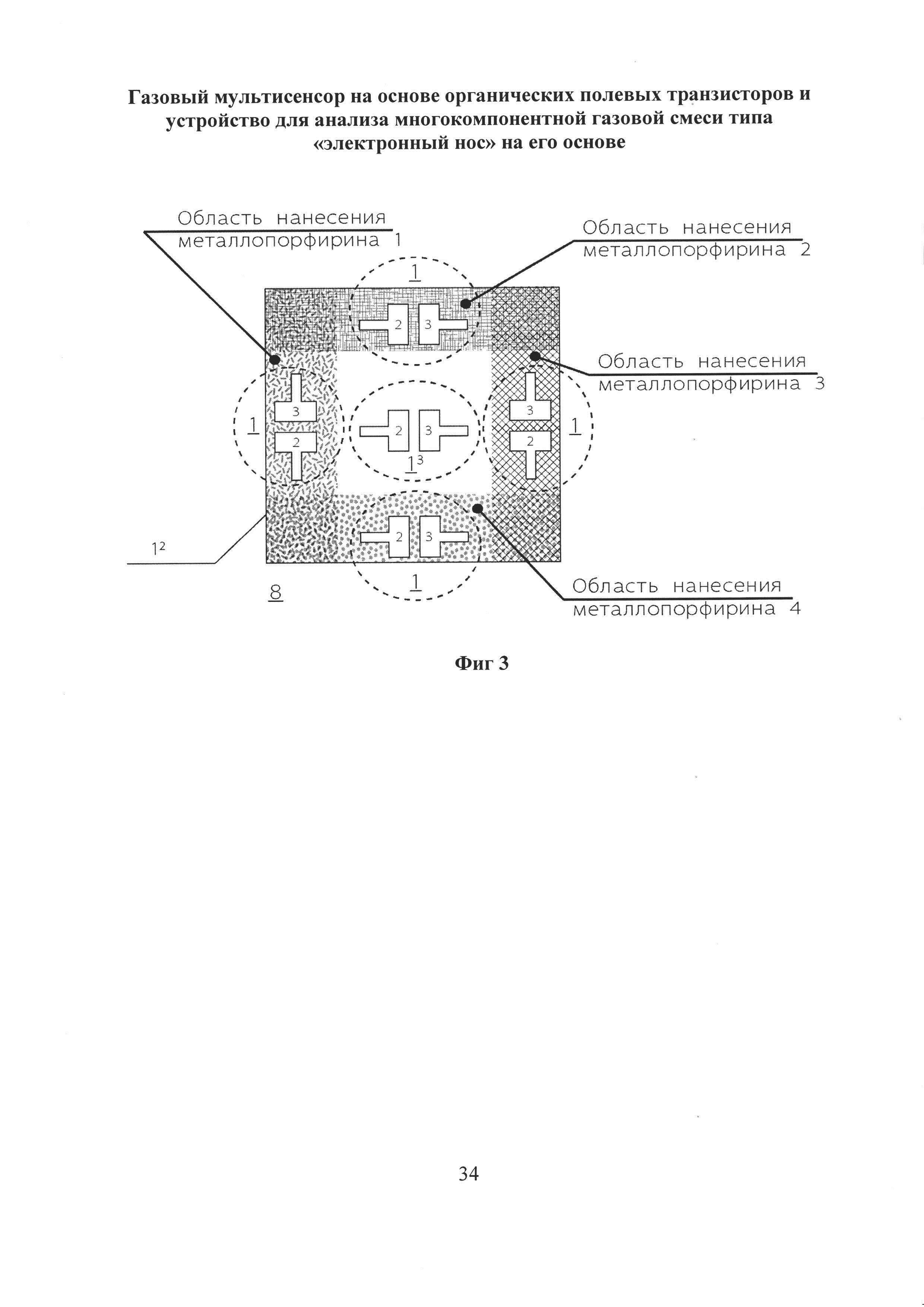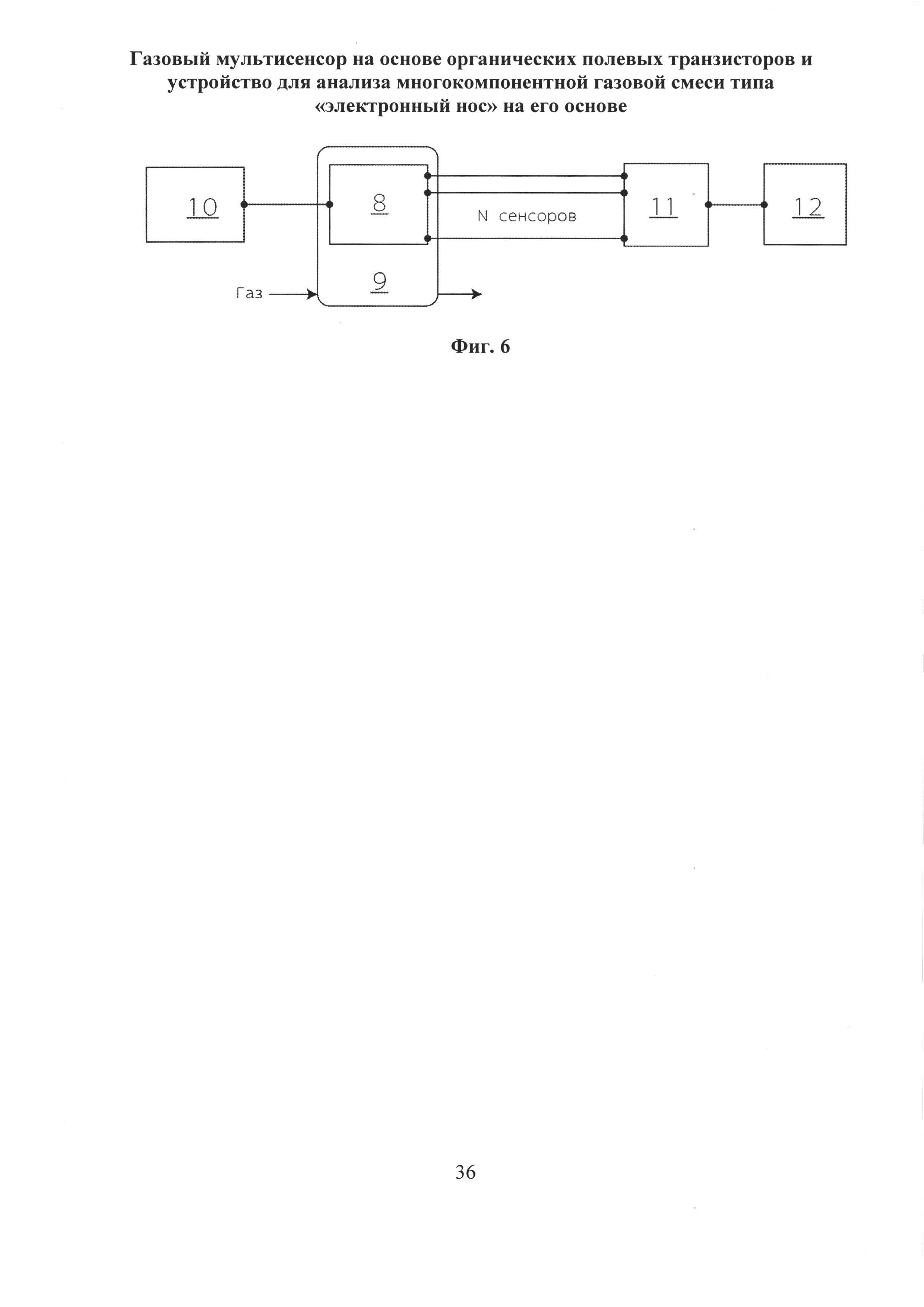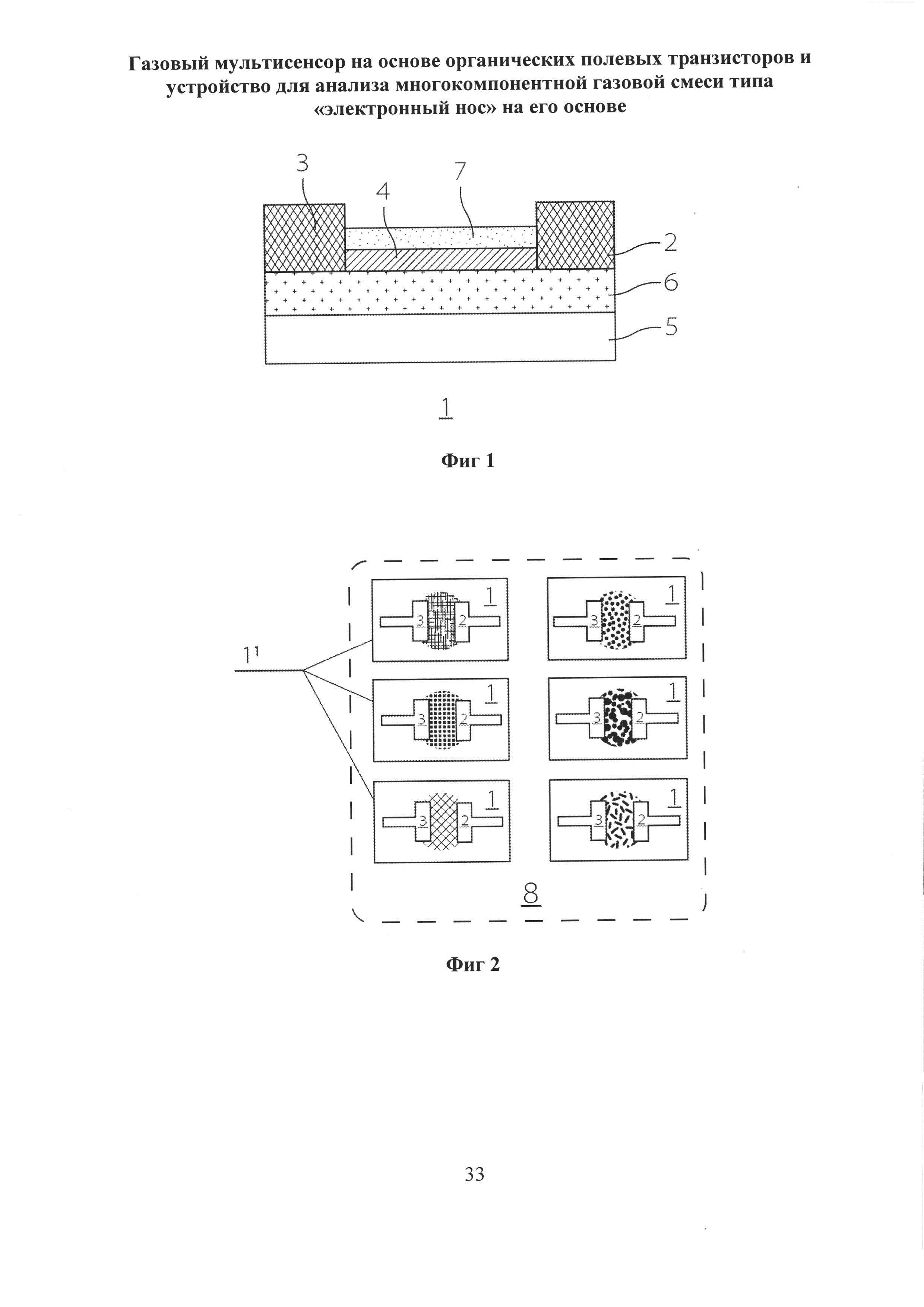 ОБЛАСТЬ ТЕХНИКИ Изобретение относится к области измерительной техники, в частности, к газоаналитическим датчикам - химическим сенсорам, предназначенным для анализа состава газовых смесей, обнаружения и количественного определения токсичных химических газообразных соединений в окружающей среде. Более конкретно изобретение относится к системам типа «Электронный нос», представляющим из себя искусственную систему обоняния, основанную на массиве химических сенсоров, каждый из которых представляет из себя органический полевой транзистор, обладающий ограниченной специфичностью. Заявляемое устройство для анализа многокомпонентной газовой смеси типа «Электронный нос» на основе органических полевых транзисторов предназначено для широкого набора практических приложений и призвана заменить обонятельную систему человека за счет создания интеллектуальных автоматизированных систем контроля воздуха и детектирования запахов. В частности, «Электронный нос» может быть использован для определения качества отдельных категорий дорогостоящих пищевых продуктов, таких как кофе, чай, оливковое масло или вино на производстве и в сетях розничной торговли [Taurino А.М., Zuppa М., Presicce D.S. [et. al.] Miniaturized Hybrid System for Olive Oil Evaluation // 2005 Ieee Sensors, Vols 1 and 2. - 2005. - P. 1022-1025]. Другим применением таких систем является неинвазивная медицинская диагностика отдельных видов заболеваний, таких как диабет [Ping W., Yi Т., Xie Н.В., Shen F.R. A Novel Method for Diabetes Diagnosis Based on Electronic Nose // Biosensors & Bioelectronics. - 1997. - V. 12, №9-10. - P. 1031-1036] или астма [Bates С.A., Silkoff P.E. Exhaled Nitric Oxide in Asthma: From Bench to Bedside // Journal of Allergy and Clinical Immunology. - 2003. - V. 111, №2. - P. 256-262]. Перспективным применением «Электронного носа» является также контроль качества окружающего воздуха в жилых и рабочих зонах [McNabola A., Broderick В.М., Gill L.W. A Principal Components Analysis of the Factors Effecting Personal Exposure to Air Pollution in Urban Commuters in Dublin, Ireland // Journal of Environmental Science and Health Part a-Toxic / Hazardous Substances & Environmental Engineering. - 2009. - V. 44, №12. - P. 1219-1226], а также контроль появления возгорания [Scorsone Е., Pisanelli А.М., Persaud K.С. Development of an Electronic Nose for Fire Detection // Sensors and Actuators B-Chemical. - 2006. - V. 116, №1-2. - P. 55-61]. УРОВЕНЬ ТЕХНИКИ Применение органических полевых транзисторов в качестве основы для системы «Электронный нос» является наиболее перспективным решением, поскольку позволяет совместить высокую чувствительность, низкое энергопотребление, а также возможность внедрения в структуру отдельных сенсоров, входящих в состав «электронного носа», рецепторных слоев различного химического строения, что позволяет увеличить селективность используемых датчиков. Дополнительным преимуществом является невысокая стоимость мультисенсора, являющегося основой «Электронного носа», что позволяет использовать его в варианте одноразового устройства и актуально в случае биомедицинских применений. Известен сенсор электронного носа или электронного языка, включающий одну подложку с множеством чувствительных зон. Каждая из рецепторных зон содержит смесь нескольких различных рецепторов в различных пропорциях. При взаимодействии образца с хотя бы одной из чувствительных зон меняются ее физические параметры, что позволяет определить наличие детектируемого соединения при помощи оптической, флуоресцентной или конфокальной микроскопии, а также посредством поверхностного плазмонного резонанса или путем измерения импеданса, [заявка ЕА 201491561 А1, дата 