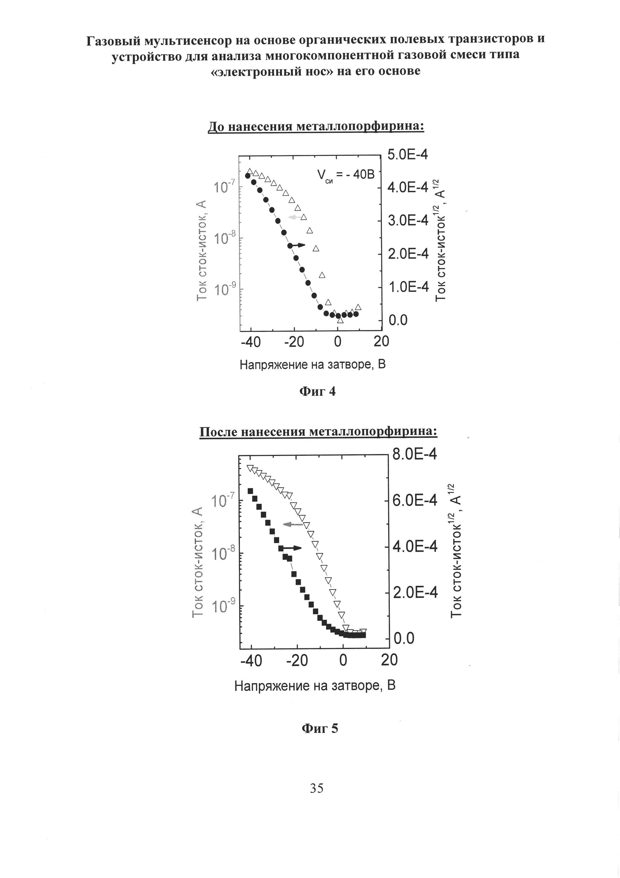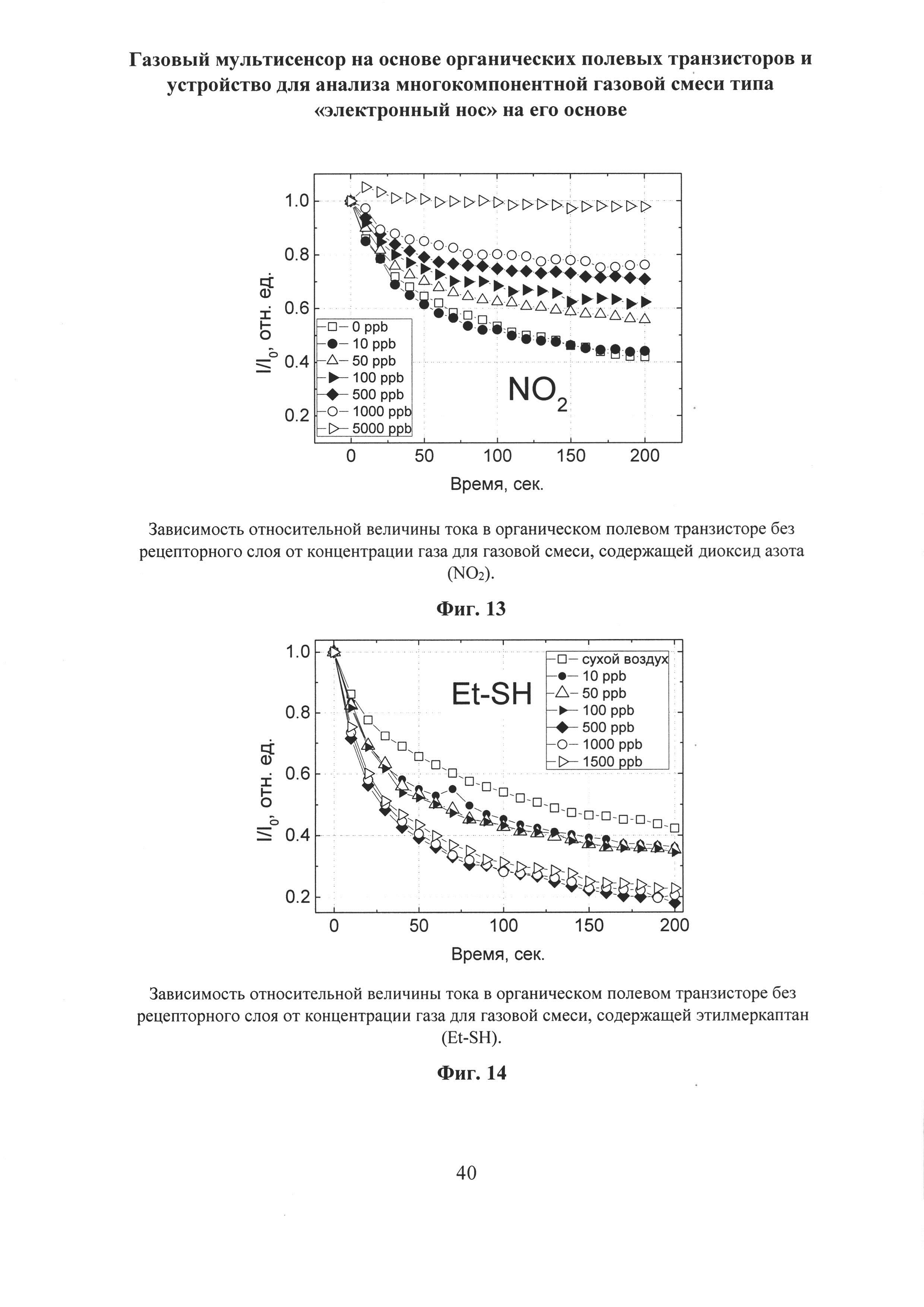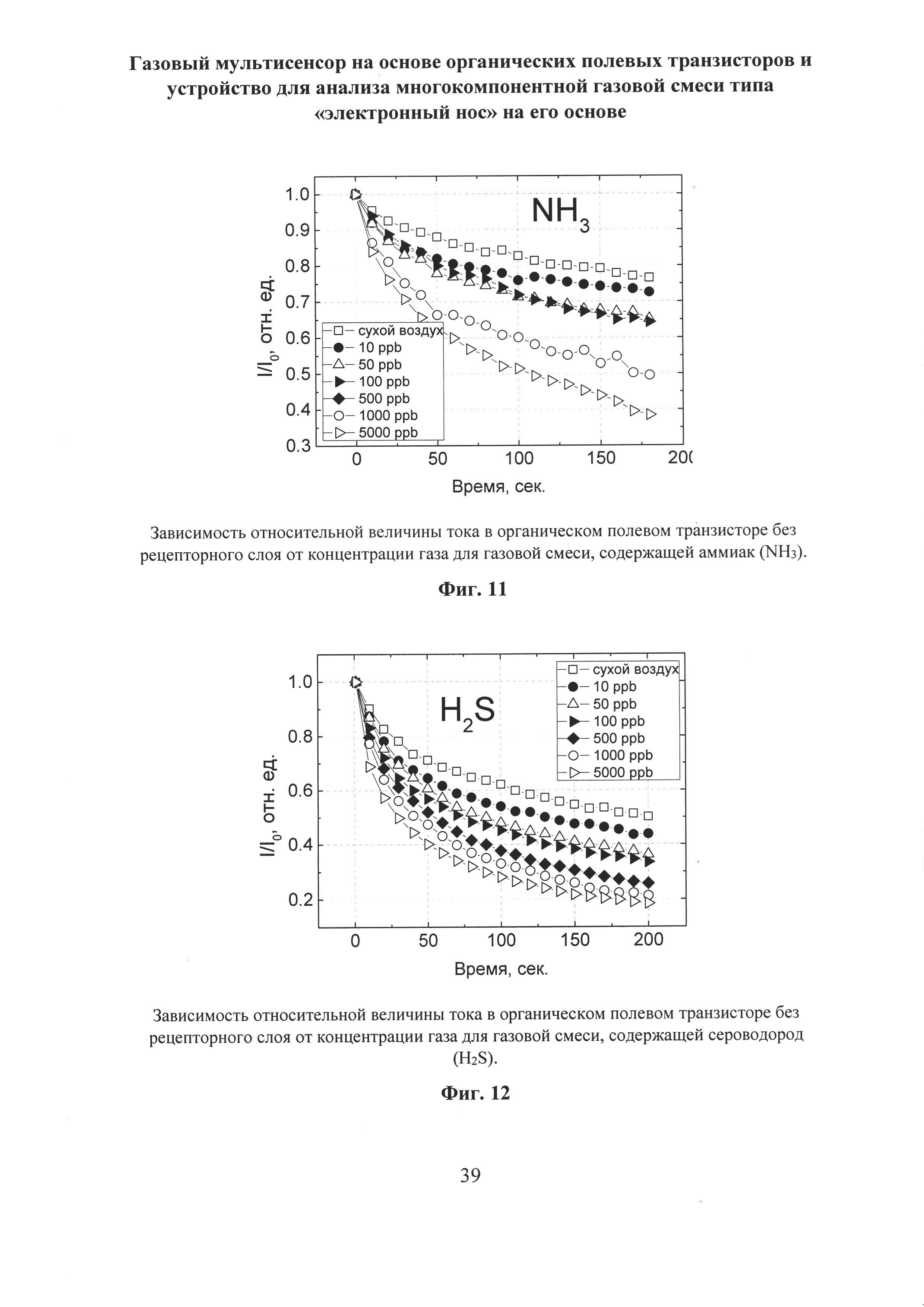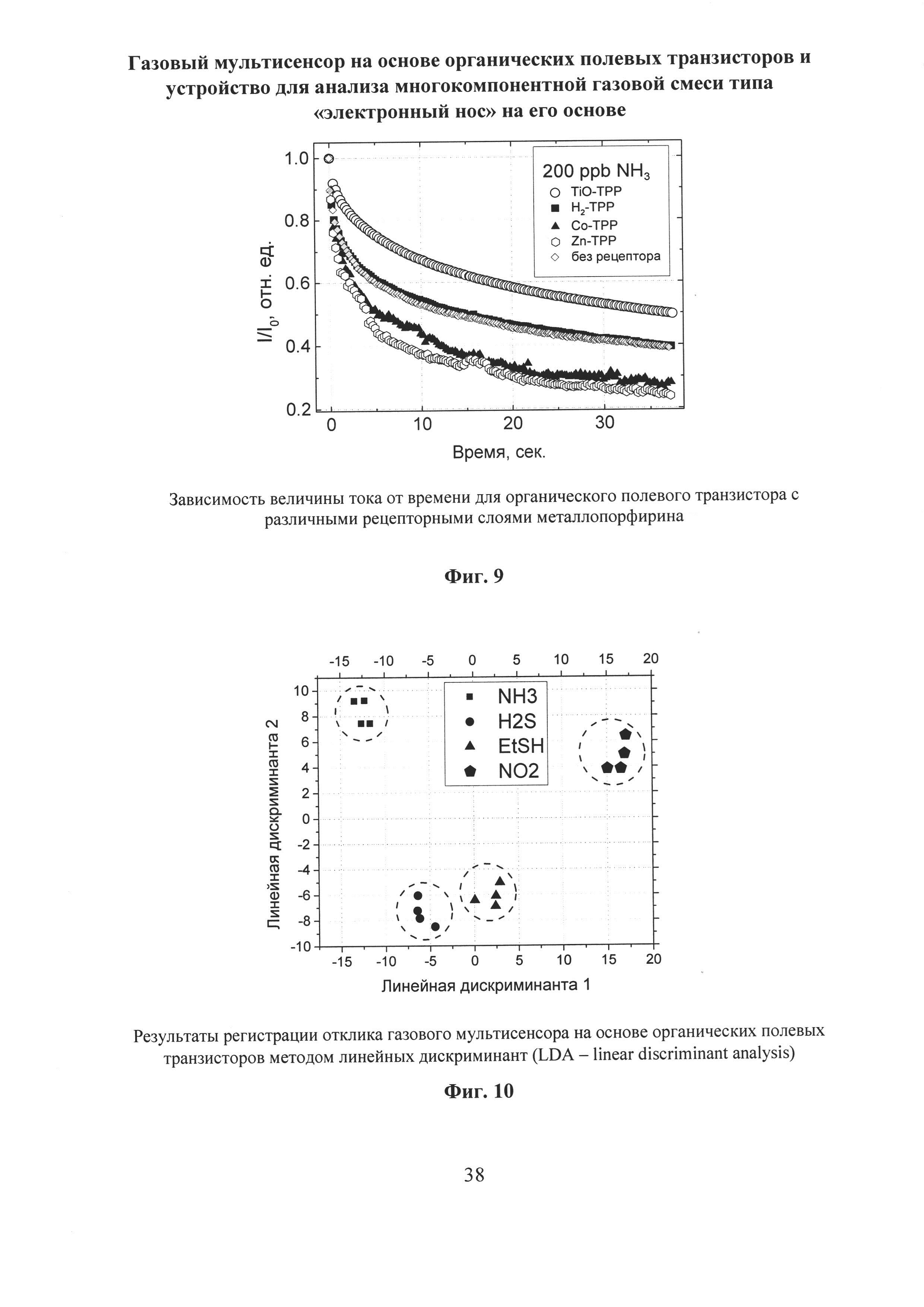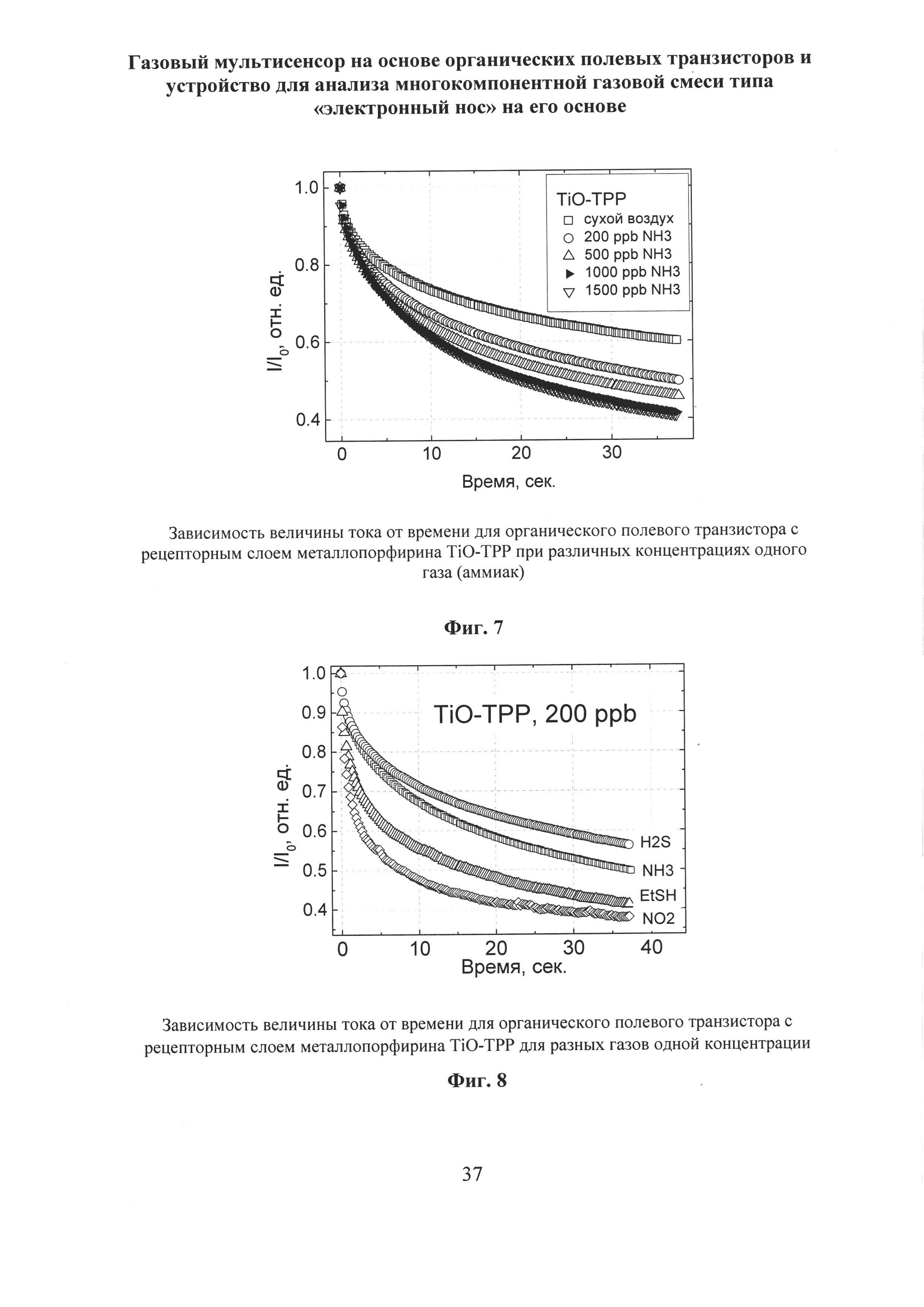 для каждого из N органических полевых транзисторов 1 с рецепторным слоем 7 металлопорфирина, в присутствии низкомолекулярного токсичного газа, зависят от центрального атома молекулы металлопорфирина. Данный факт обусловлен различиями кинетик сорбции одного и того же газа на поверхность слоя металлопорфиринов различного химического строения. Для примера на фиг. 9 показана зависимость величины тока от времени для органического полевого транзистора с различными рецепторными слоями 7 металлопорфиринов при содержании в газовой смеси аммиака в концентрации 200 ppb.