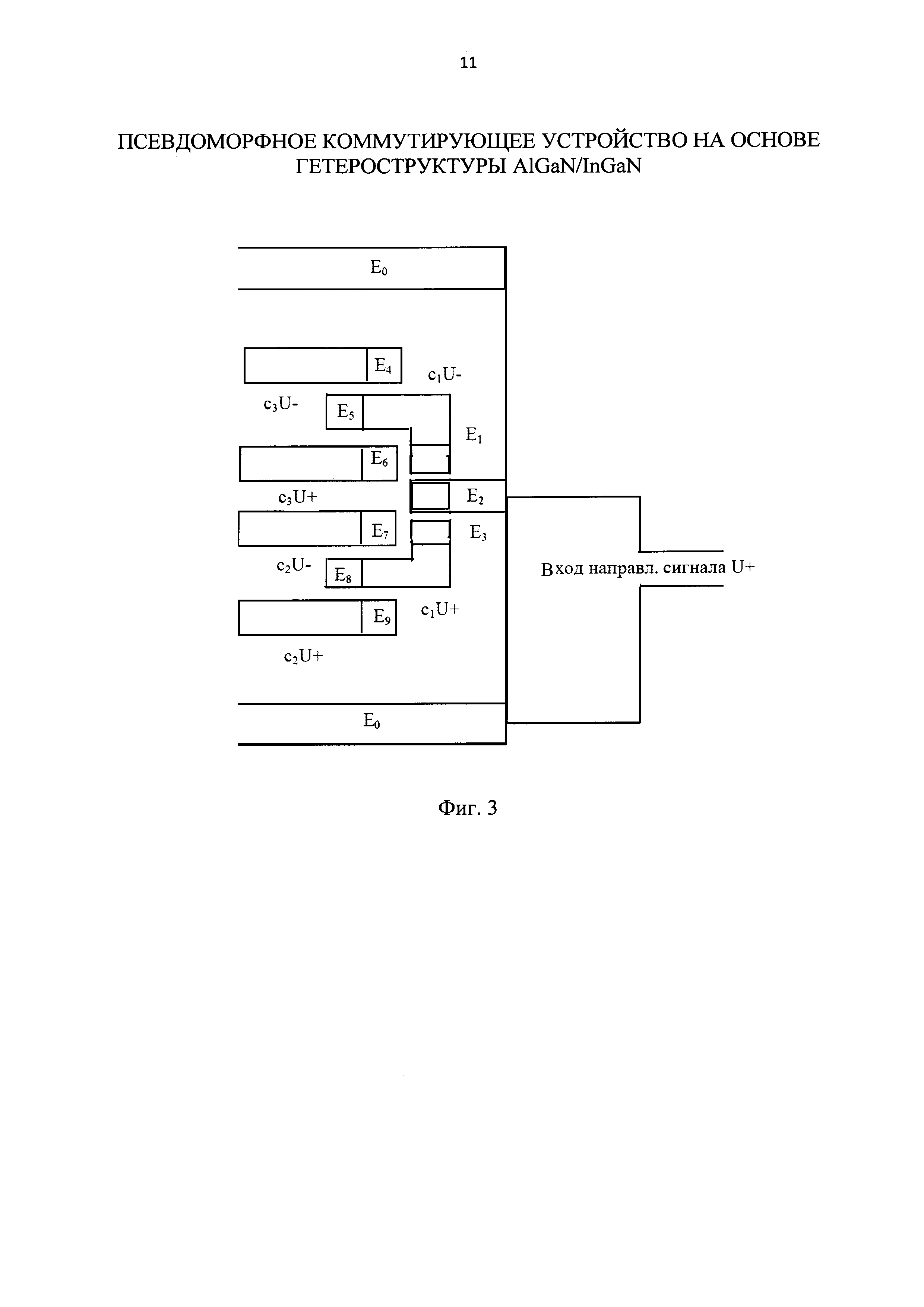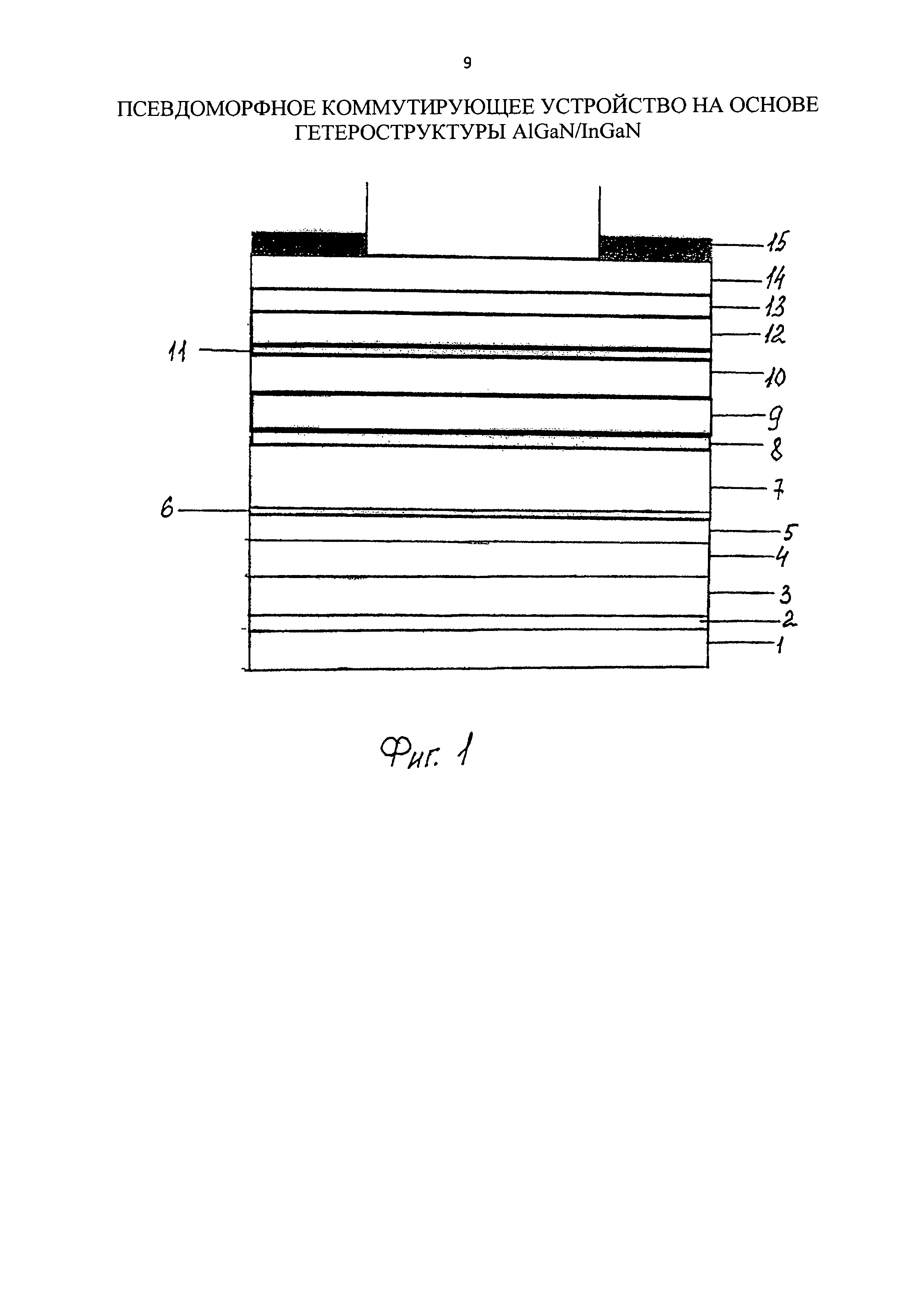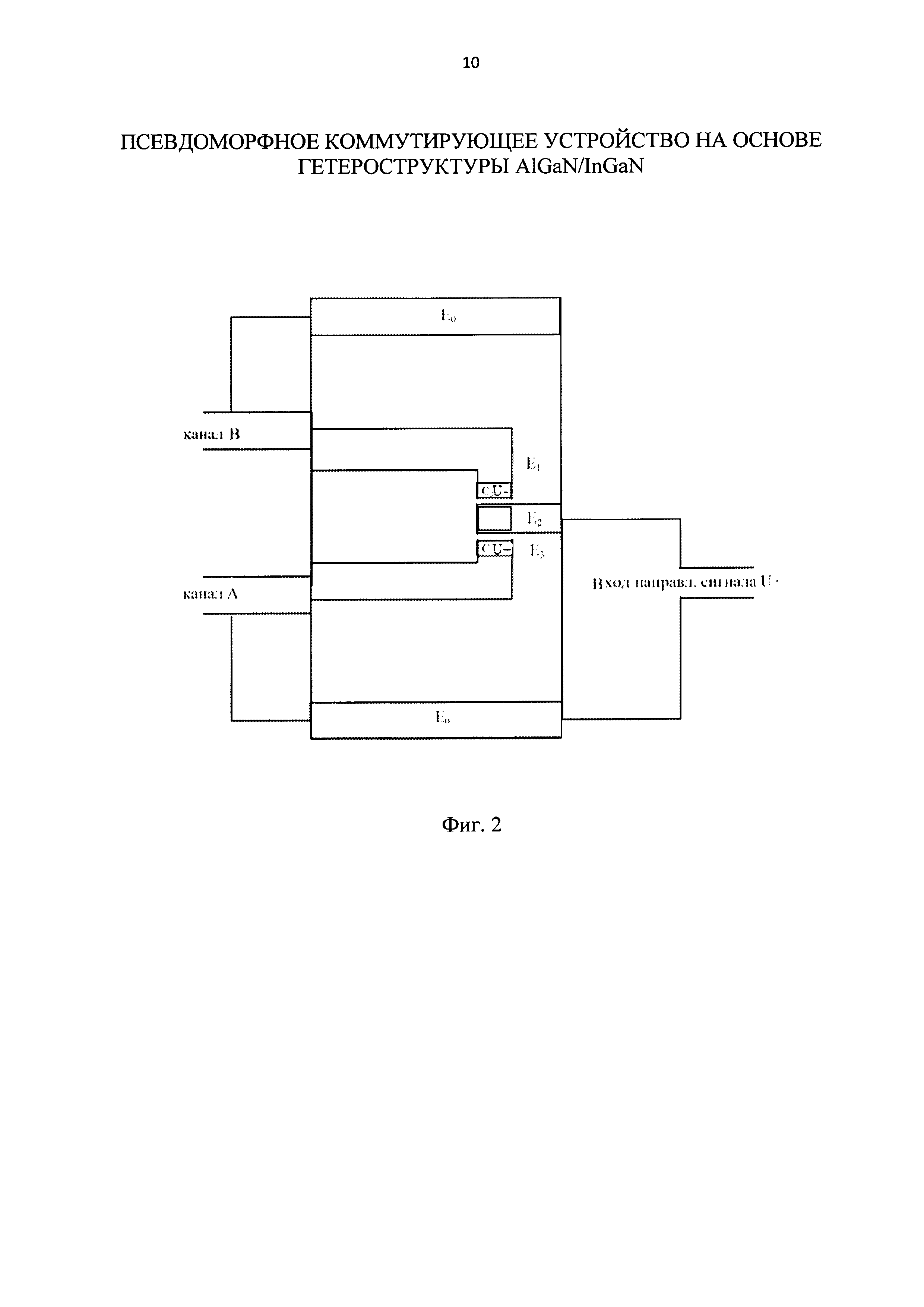 1. Коммутирующее устройство, содержащее электроды, емкостной элемент, отличающееся тем, что коммутирующее устройство является псевдоморфным, изготовленным на базе гетероструктуры AlGaN/InGaN, а емкостной элемент представляет собой конденсатор, кроме того, коммутирующее устройство включает подложку из сапфира, на которой последовательно размещены: буферный слой из AlN, буферный слой из GaN, слой из нелегированного GaN i-типа проводимости, сверхрешетка из AlXGa1-XN/GaN, буферный слой из GaN, сильнолегированный слой n-типа проводимости из AlXGa1-XN, спейсер из твердого раствора AlXGa1-XN, сглаживающий слой из GaN, канал из твердого раствора InXGa1-XN, и в интерфейсе InXGa1-XN/AlGaN гетероструктуры образован двумерный электронный газ (ДГ) высокой плотности, который служит нижней обкладкой конденсатора, поверх твердого раствора InXGa1-XN размещен химически устойчивый сглаживающий слой из GaN, поверх которого нанесен слой диэлектрика из двуокиси гафния, а поверх диэлектрика размещены металлические электроды полосковой формы, которые образуют верхнюю обкладку конденсатора, при этом емкостной элемент устройства выполнен с минимальным количеством глубоких электронных ловушек (DX), а канал выполнен упруго-напряженным псевдоморфным с концентрацией InGa 15-25%. 2. Коммутирующее устройство по п. 1, отличающееся тем, что содержит ряд трехэлектродных двухканальных конфигураций. 3. Коммутирующее устройство по п. 1, отличающееся тем, что канал выполнен из In0,17Ga0,83N с шириной запрещенной зоны 5,35 эВ. 4. Коммутирующее устройство по п. 1, отличающееся тем, что канал выполнен с критической толщиной 7-16 нм.