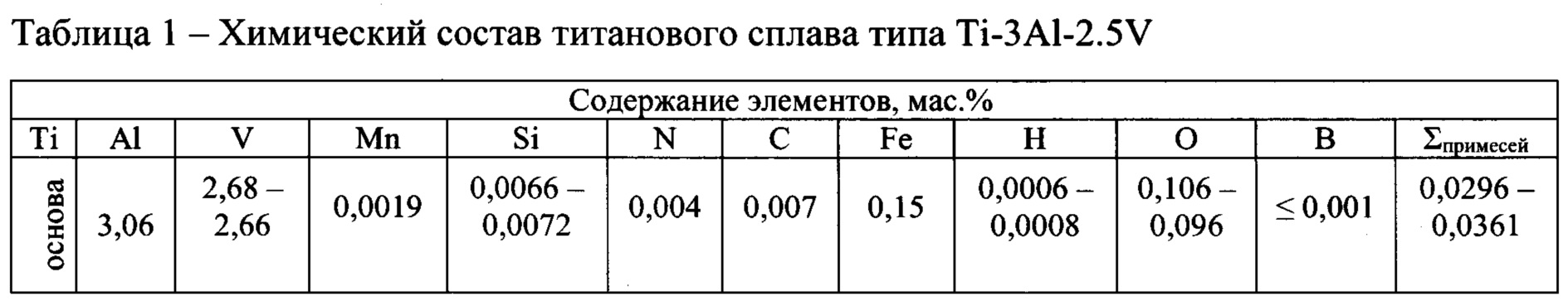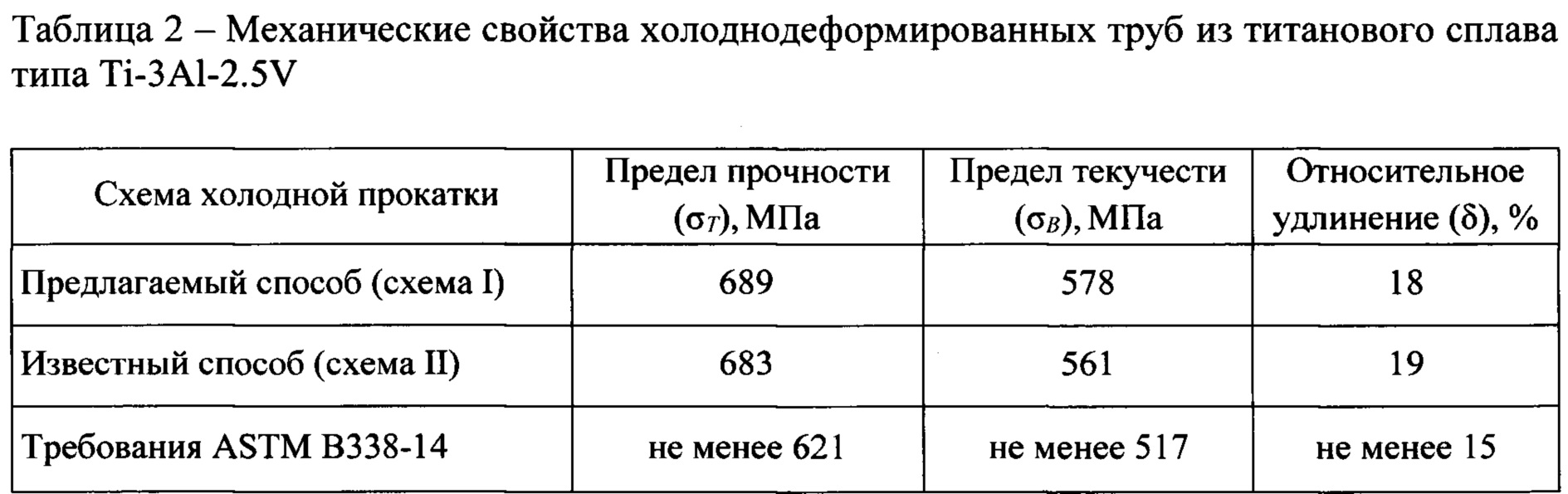 Способ изготовления бесшовных холоднодеформированных труб из титанового сплава типа Ti-3Al-2,5V, включающий механическую обработку горячедеформированной цилиндрической заготовки, горячее прессование заготовки при температуре, не превышающей температуру полиморфного α→β-превращения, правку и механическую обработку горячепрессованных труб, последующую холодную прокатку по меньшей мере в три прохода при осуществлении промежуточных термических обработок в вакууме при температуре 690÷740°С и конечную термическую обработку труб готового размера в вакууме, отличающийся тем, что горячее прессование осуществляют при температуре TH, которую определяют по зависимости ТН=ТПП-k⋅ε⋅υпр, где ТПП - температура полиморфного превращения, °С; k=0,15÷0,20 - эмпирический коэффициент, учитывающий влияние деформационного разогрева, °С⋅с/мм; ε - логарифмическая степень деформации; υпр - скорость перемещения деформирующего инструмента при прессовании, мм/с, при этом холодную прокатку осуществляют со степенью деформации от 40 до 44%.