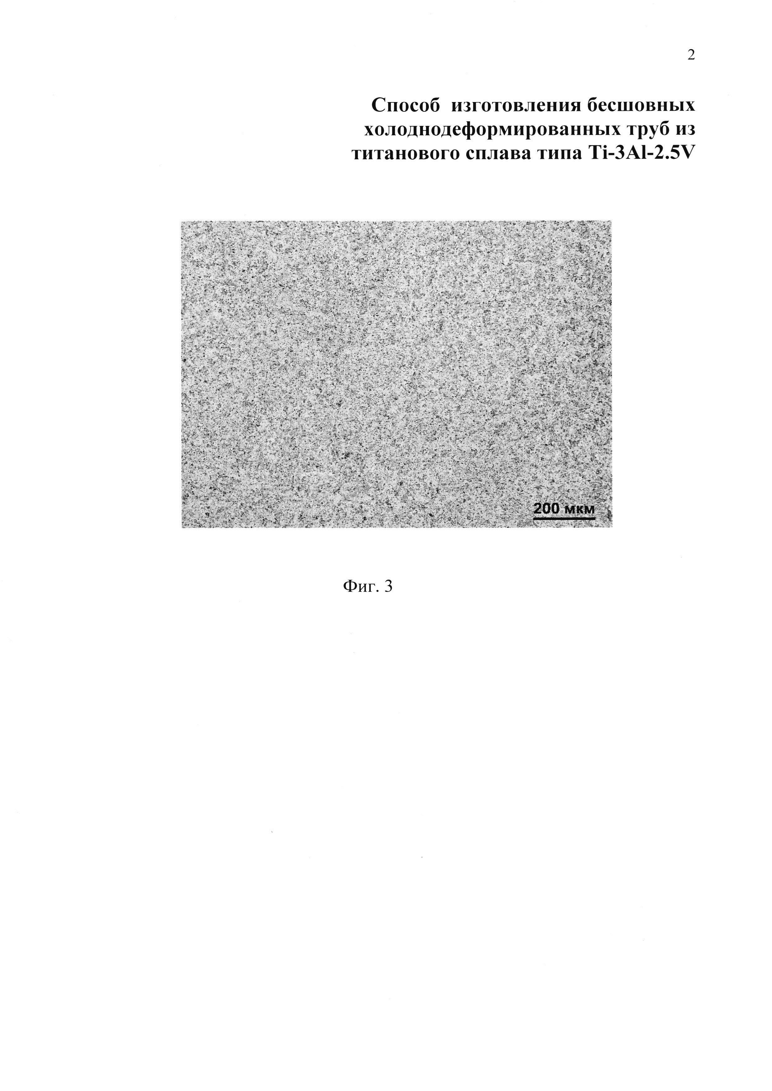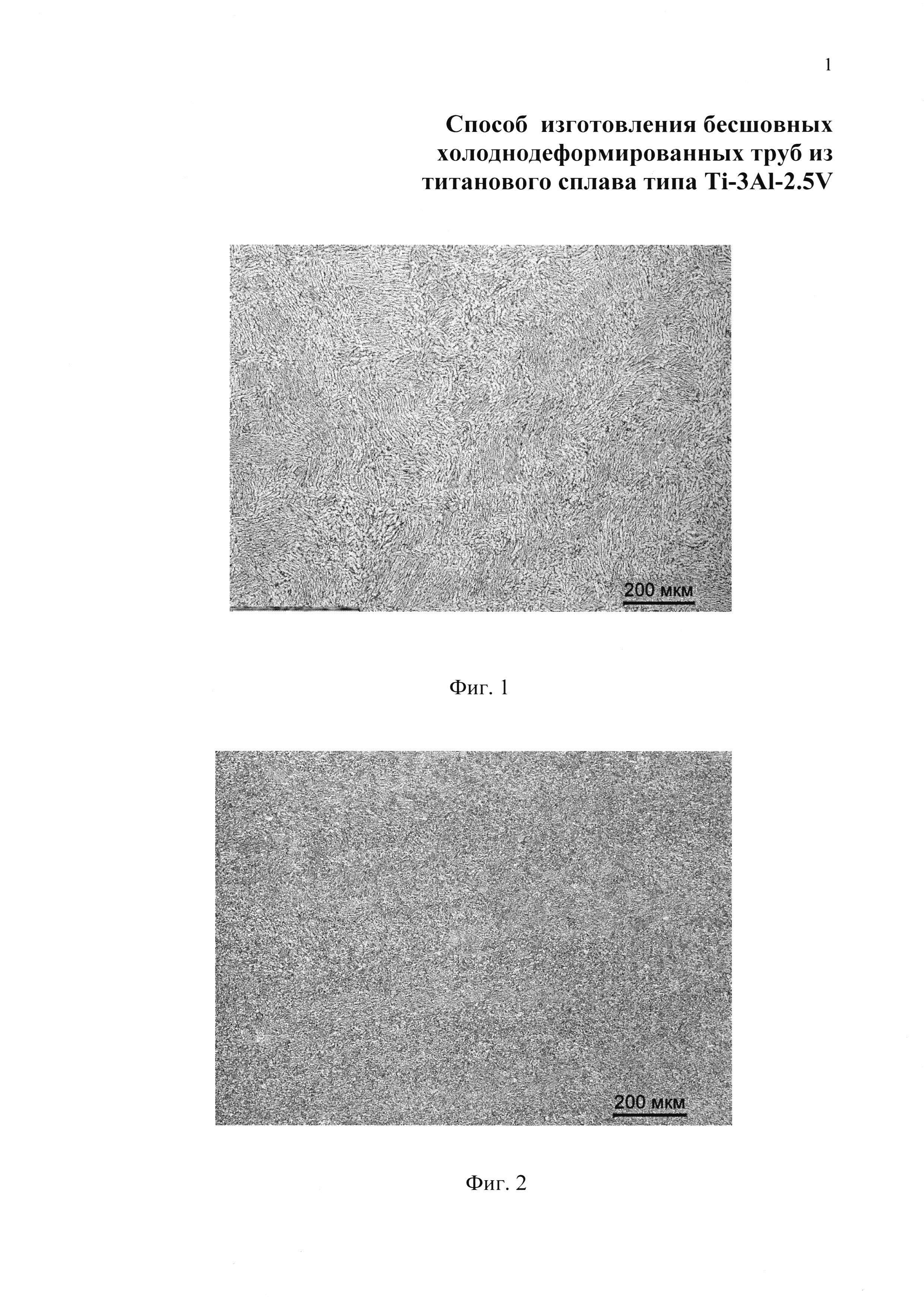 Изобретение относится к области металлургии, в частности к трубопрокатному производству, а именно к изготовлению бесшовных холоднодеформированных труб из титанового сплава типа Ti-3Al-2,5V, и может быть использовано для изготовления изделий ответственного назначения. Способ изготовления холоднодеформированных труб из титанового сплава типа Ti-3Al-2,5V включает механическую обработку горячедеформированной цилиндрической заготовки, горячее прессование заготовки при температуре нагрева Т=Т-k⋅ε⋅υ, не превышающей температуру Тполиморфного α→β-превращения, где Т- температура полиморфного превращения, °С, k=0,15÷0,20 - эмпирический коэффициент, учитывающий влияние деформационного разогрева, °С⋅с/мм, ε - логарифмическая степень деформации, υ- скорость перемещения деформирующего инструмента при прессовании, мм/с. Затем проводят механическую обработку и холодную прокатку со степенью деформации от 40 до 44% для получения трубы, при этом промежуточные и конечную термические обработки осуществляют в вакууме. Обеспечиваются требуемые механические свойства труб по пределу прочности и относительному удлинению за счет сохранения микроструктуры исходной заготовки, увеличение коэффициента выхода годного с одновременным снижением трудоемкости технологического процесса и затрат на производство. 3 ил., 2 табл.