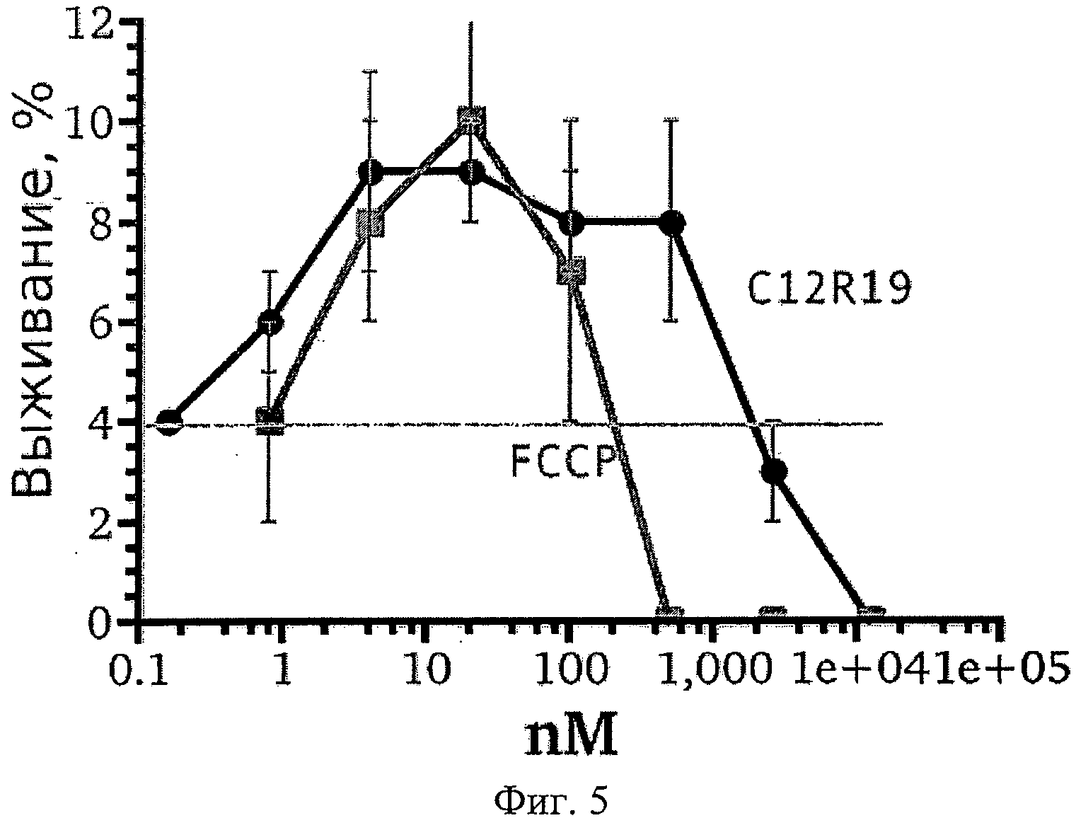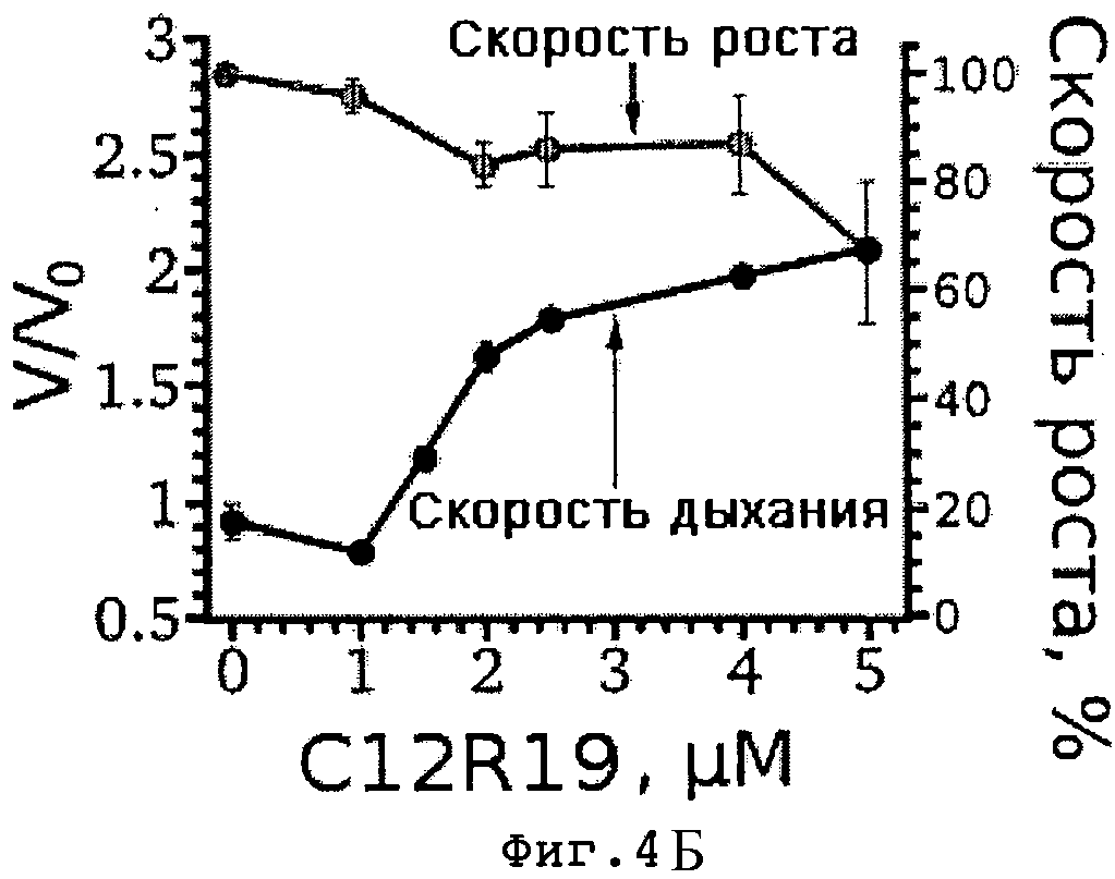 1. Фармацевтическая композиция, содержащая терапевтически эффективное количество действующего вещества, способного обеспечивать разобщение дыхания митохондрий в прямой зависимости от величины их мембранного потенциала и вызывающая мягкое разобщение - обратимое снижение мембранного потенциала митохондрий, при котором не происходит существенного/физиологически значимого подавления дыхания, повреждения компонентов дыхательной цепи либо нарушения физико-химических свойств мембран митохондрий, при условии, что вышеупомянутое действующее вещество представляет собой соединение общей структуры (II): 2. Композиция по п.1, в которой соединение формулы (II) представляет собой соединение C10R19 формулы: 3. Композиция по п.1, в которой соединение формулы (II) представляет собой соединение C12R19 формулы: 4. Композиция по п.1, в которой соединение формулы (II) представляет собой соединение C4R19 формулы: 5. Композиция по п.1, в которой соединение формулы (II) представляет собой соединение C2R19: 6. Применение композиций по пп.1-5 для изготовления лекарственного средства для снижения количества свободных радикалов и активных форм кислорода в клетке. 7. Применение композиций по пп.1-5 для изготовления лекарственного средства для стимуляции клеточного метаболизма. 8. Применение по пп.6-7 в случаях, когда клетка, будучи нормальной, или раковой, или стволовой клеткой, находится в организме человека или другого млекопитающего; является растительной клеткой и/или находится в составе растения на любой стадии его развития, в том числе и генетически модифицированного; находится в культуре растительных клеток или протопластов; является грибковой клеткой и/или находится в культуре грибковых клеток; в том числе, когда необходимо увеличение жизнеспособности и/или продуктивности клеток-продуцентов препаратов, фармакологически применимых белков, пептидов, антител. 9. Применение по п.8 при лечении ожирения, включая его патологические формы, а также болезней, связанных с нарушением метаболизма. 10. Применение по п.8 при лечении диабета, осложнений, вызванных диабетом, а также сопутствующих ему заболеваний. 11. Применение по п.8 при лечении заболевания, при котором полезным является снижение количества свободных радикалов и активных форм кислорода в организме. 12. Применение по п.8 при защите здоровых клеток от повреждения во время химиотерапии, радиотерапии или фотодинамической терапии рака; во время обеззараживания крови или другой субстанции, содержащей здоровые клеточные элементы при помощи свободных радикалов, активных форм кислорода или веществ, их образующих. 13. Применение по п.8 при косметических процедурах, при заживлении хирургических швов, при предотвращении поражения здоровых тканей во время хирургических операций, заживлении или предотвращении ожогового поражения тканей, при воспалениях, при сохранении трансплантационного материала, при борьбе с отторжением трансплантируемых тканей и органов. 14. Применение композиции по любому из пп.1-5 для увеличения продолжительности жизни организма, борьбы со старением; в том числе, применение в комбинации с гормональной терапией, в частности в комбинации с гормонами эпофиза, щитовидной железы, в том числе с дигидроэпиандростероном или мелатонином. 15. Соединение общей формулы: