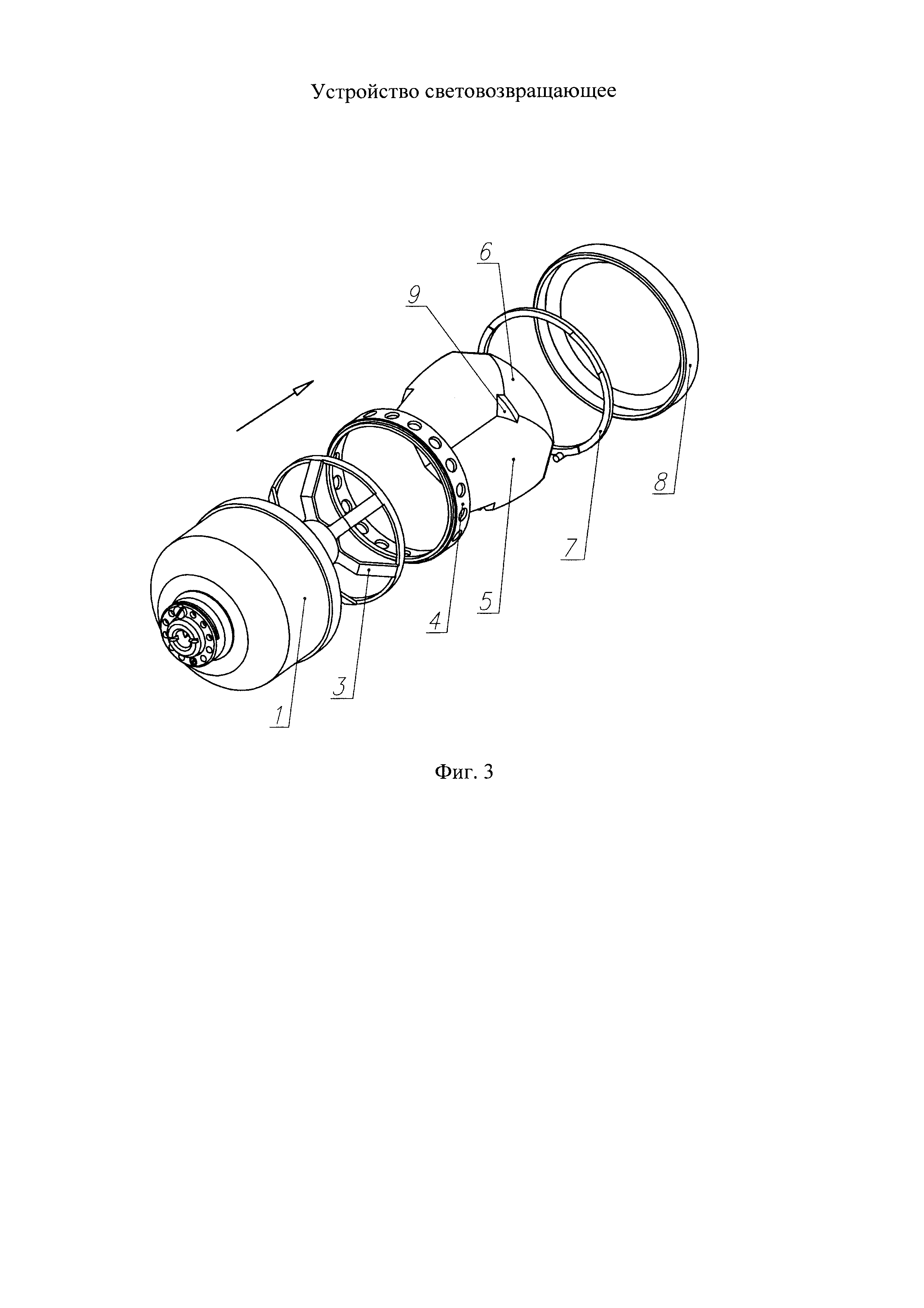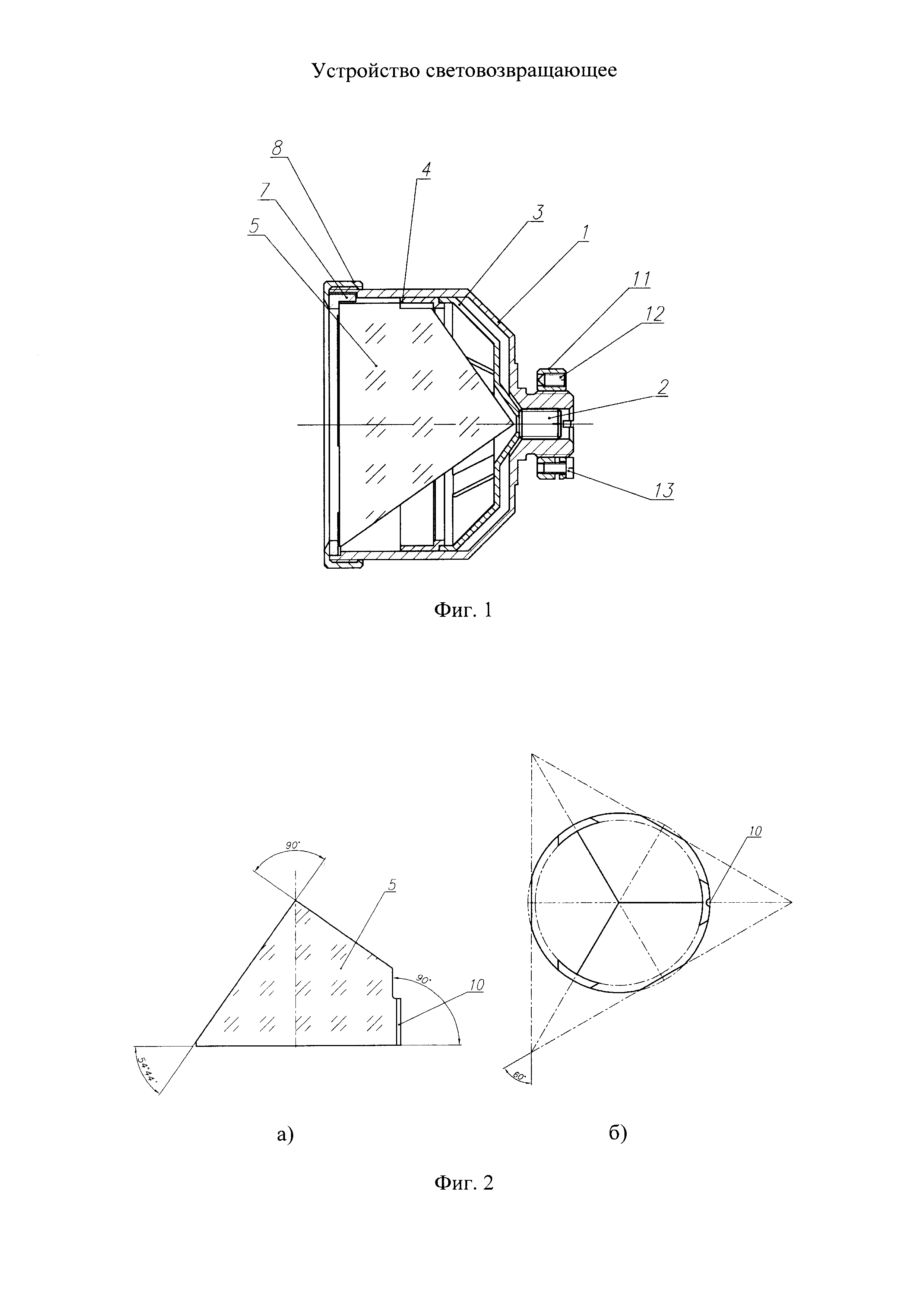 Устройство световозвращающее, содержащее установленный в металлический корпус на ложемент призменный уголковый световозвращатель с боковыми гранями в форме треугольника и срезами углов у входной грани, кольцо опорное, поджатое фиксирующим элементом, опору, винт регулировочный, отличающееся тем, что в верхней части срезов углов, которые выполнены скругленными, параллельно входной грани выполнены установочные площадки, опирающиеся на торец ложемента, выполненный в виде полого перфорированного цилиндра, опертого на кромку основания конусообразной опоры, имеющей отдельные ступенчатые ребра, создающие пружинящий эффект, кроме того, на внешней стороне одного из трех срезов углов световозвращателя выполнена вертикальная проточка от входной грани до установочной площадки, другая проточка выполнена вертикально на внутренней стенке корпуса, и при совмещении обе образуют единый канал, в который введен фиксирующий выступ, выполненный на опорном кольце, которое поджато фиксирующим элементом в виде прижимной гайки.