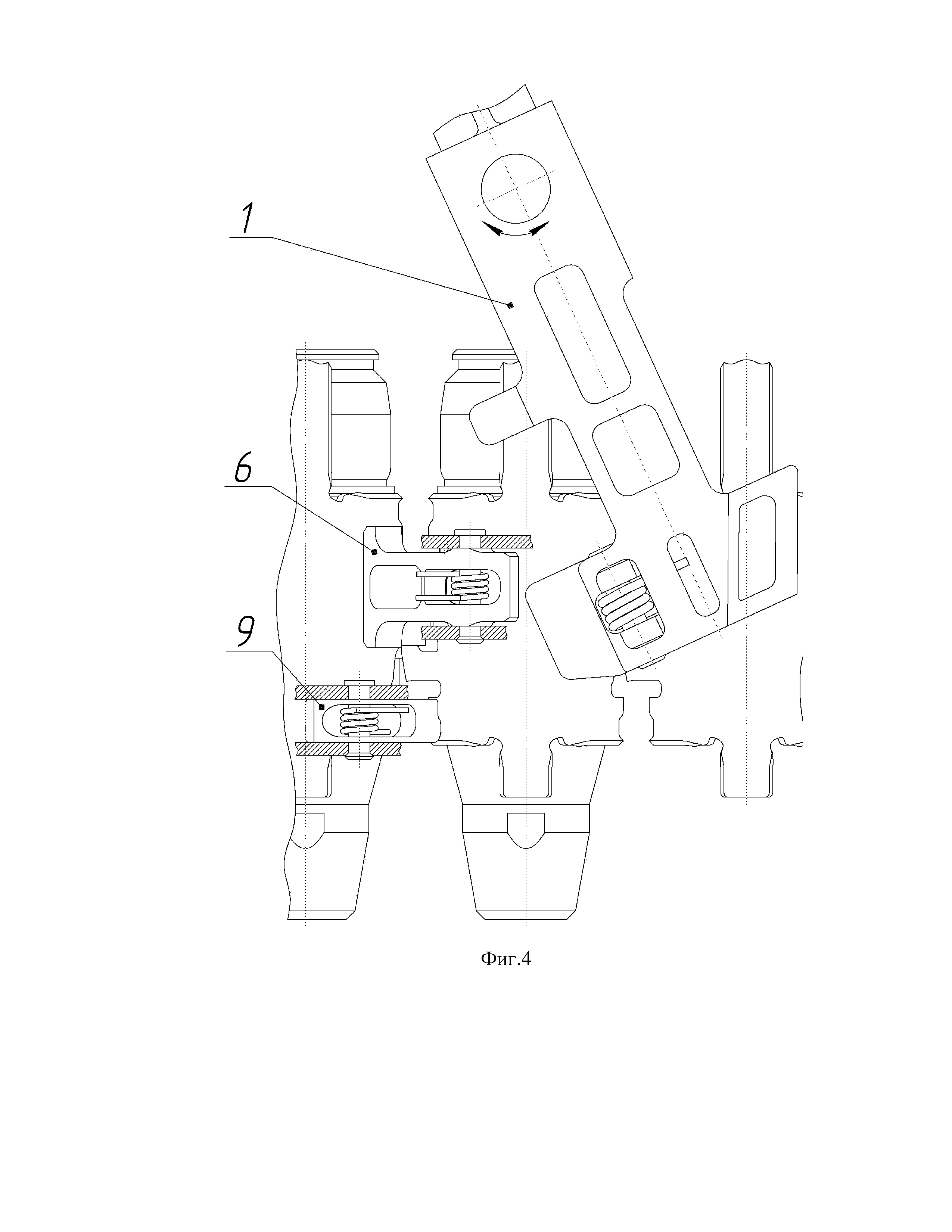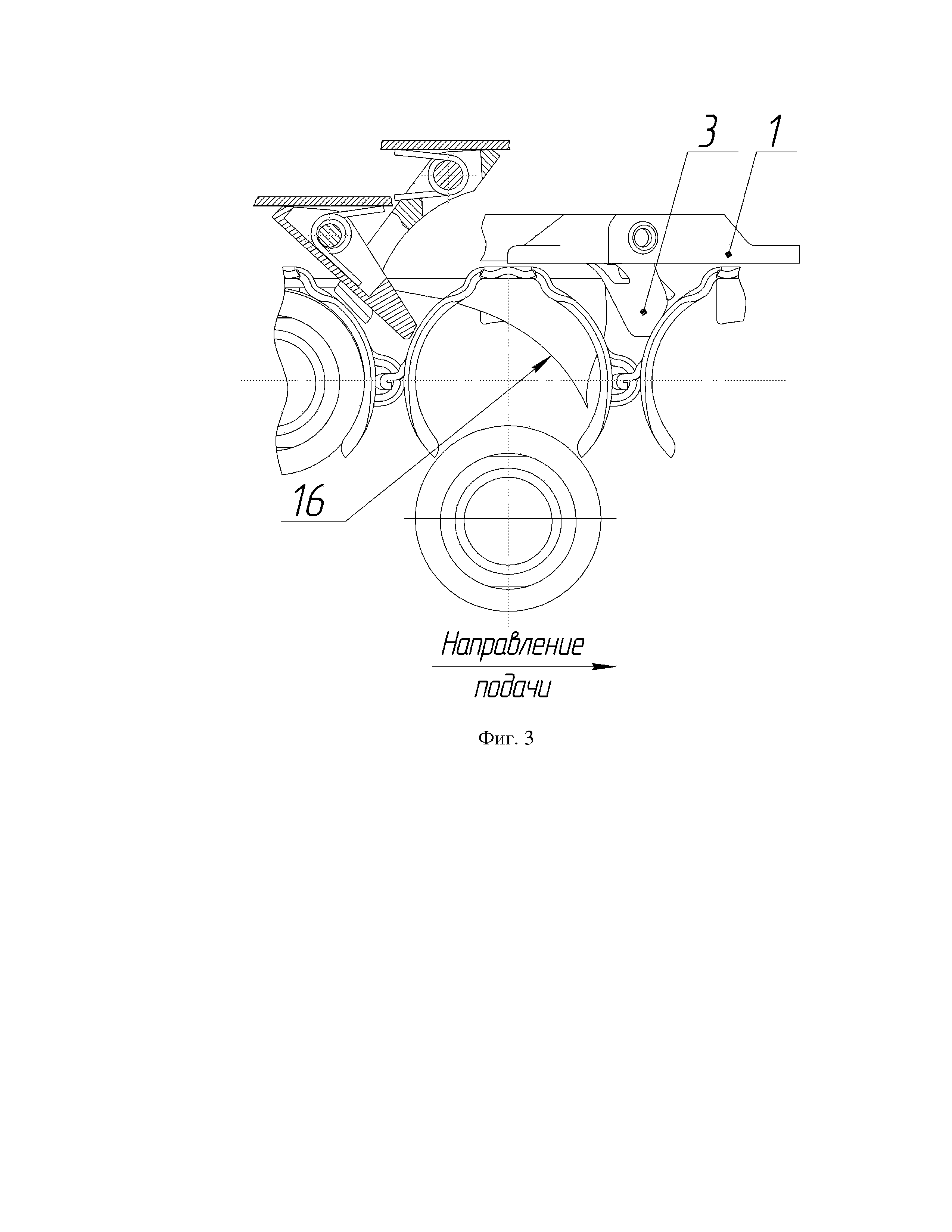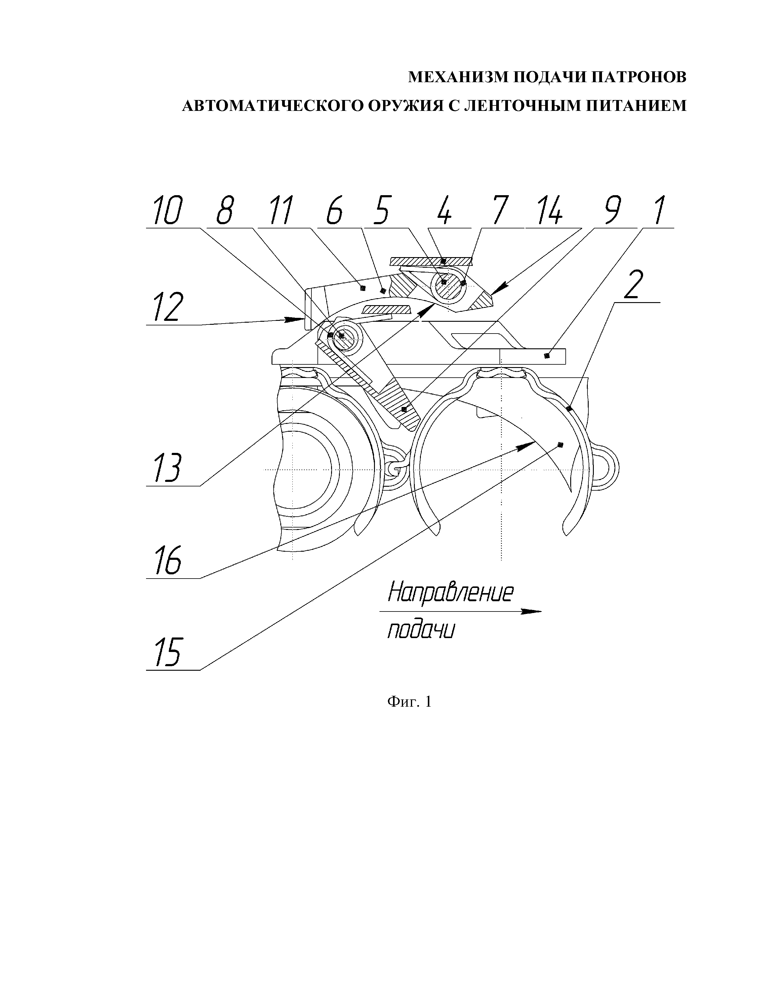 Изобретение относится к автоматическому оружию и может быть использовано в механизмах подачи автоматического оружия с ленточным питанием. Во всех образцах автоматического оружия с ленточным питанием боеприпасами при подаче патронной ленты происходит инерционное перемещение патронной ленты внутри автоматики изделия, что снижает надежность работы механизма подачи образца оружия. Известен механизм подачи патронов 30-мм автоматического гранатомета на станке АГС-17 (см. Руководство по 30-мм автоматическому гранатомету на станке АГС-17, Министерство обороны СССР, Москва, 1982 г., http://forum.guns.ru/forummessage/18/140174.html), выбранный в качестве ближайшего аналога, содержащий вращающийся рычаг подачи с подпружиненным подавателем и ограничители. Ограничители представляют собой два фиксирующих пальца, расположенных на крышке. При движении затвора вперед рычаг подачи перемещается вправо и подаватель заходит за очередной патрон, ограничители удерживают ленту от перемещения назад внутри оружия. При откате затвора после выстрела рычаг подачи перемещается влево и подаватель перемещает ленту на шаг, очередной патрон упирается в специальные выступы приемника и устанавливается на линию снижения. В коробке магазина, присоединяемой к гранатомету, находится выступающий пластинчатый элемент для устранения инерционного перемещения патронной ленты при подаче внутри оружия. Недостатком данной конструкции является низкая надежность работы механизма подачи патронов, так как выступающий пластинчатый элемент не устраняет полностью инерционное перемещение патронной ленты внутри оружия. Технической задачей заявляемого изобретения является повышение надежности работы механизма подачи патронной ленты. Технический результат заключается в полном исключении инерционного перемещения патронной ленты внутри оружия при подаче патронной ленты. Поставленная задача достигается тем, что механизм подачи патронов автоматического оружия с ленточным питанием содержит вращающийся на оси рычаг подачи с подпружиненным подавателем, ограничитель. Механизм подачи патронов снабжен отсекателем, шарнирно установленным на крышке и выполненным с возможностью взаимодействия с патронной лентой, отсекатель представляет собой подпружиненный двуплечий рычаг с профильной поверхностью, взаимодействующей с рычагом подачи, причем в конце подачи патронной ленты одно плечо отсекателя взаимодействует с патронной лентой, другое плечо взаимодействует с крышкой. Сущность изобретения поясняется чертежами, на которых изображено: на фиг.1 – общий вид оружия – положение деталей механизма подачи в начале подачи патронной ленты на шаг; на фиг.2 – вид сверху оружия – положение деталей механизма подачи в начале подачи патронной ленты на шаг; на фиг.3 – общий вид оружия – положение деталей механизма подачи в конце подачи патронной ленты на шаг; на фиг.4 – вид сверху оружия – положение деталей механизма подачи в конце подачи патронной ленты на шаг. Механизм подачи патронов автоматического оружия с ленточным питанием содержит рычаг подачи 1 патронной ленты 2 с подпружиненным подавателем 3. В неподвижной во время стрельбы крышке 4 на оси 5 расположен отсекатель 6 с пружиной 7, на оси 8 расположен ограничитель 9 с пружиной 10. Отсекатель 6 выполнен в виде двуплечего рычага, одно плечо 11 кот
