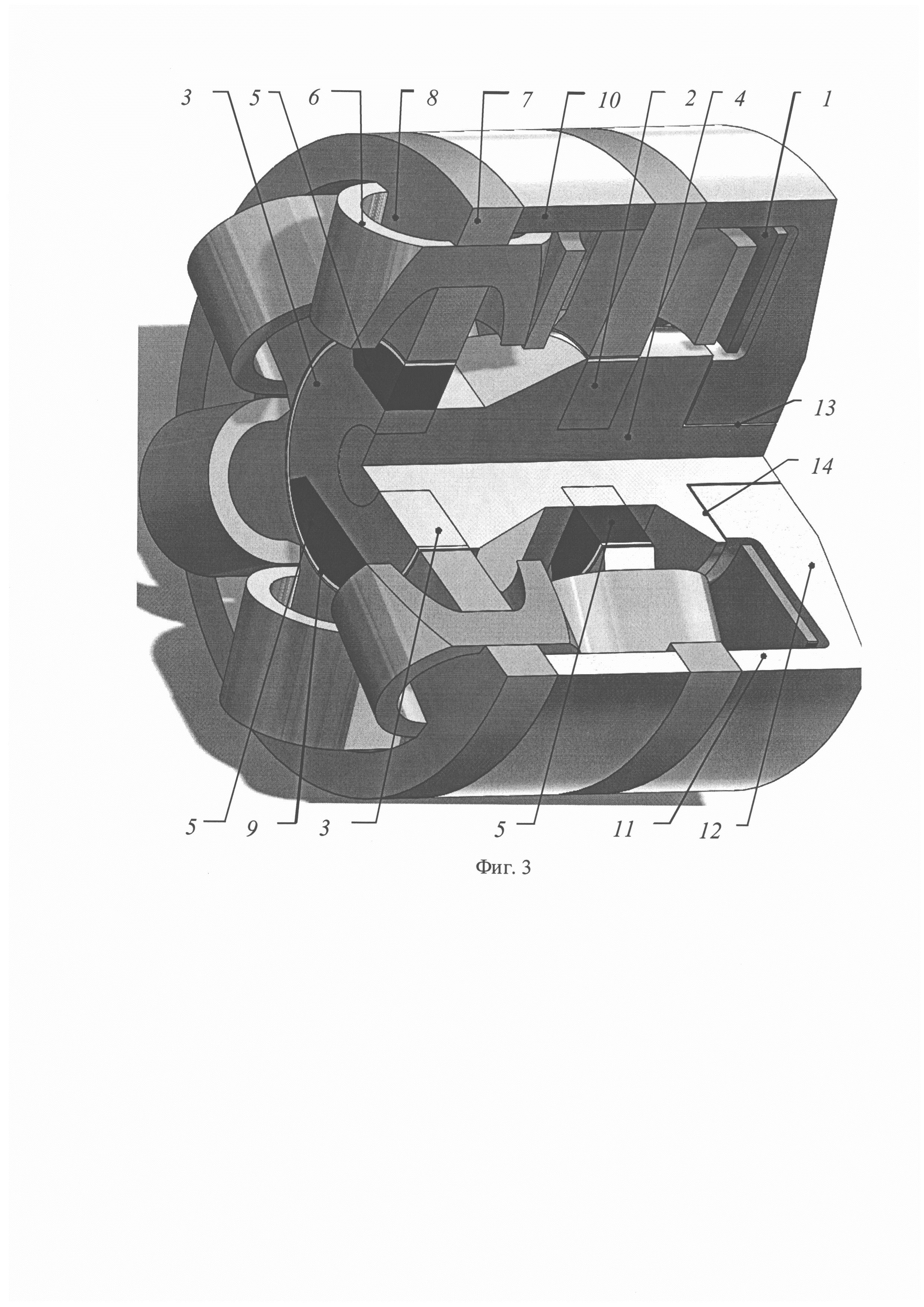 Изобретение относится к электроэнергетике, а именно, к бесконтактным синхронным электрическим машинам с комбинированным возбуждением и предназначено для использования в системах электроснабжения и системах электродвижения морских судов, наземных транспортных средств и перспективных летательных аппаратов, в том числе полностью электрифицированного самолета, а также на электростанциях в качестве высокоэффективных электромашинных преобразователей (синхронных компенсаторов, стабилизаторов напряжения, синхронизаторов, электромашинных трансформаторов) с высокими удельными массогабаритными показателями. Известны индукторная электрическая машина с комбинированным возбуждением с постоянными магнитами (ПМ) и обмоткой осевого возбуждения (см. Бут Д.А. Бесконтактные электрические машины: Учеб. пособие для электромеханических и электроэнергетических спец. втузов. - М.: Высш. шк., 1985. - 255 с., стр. 129 рис. 4.12а и идентичная конструкция на стр. 99 рис. 3.18б); синхронная электрическая машина с когтеобразным ротором с постоянными магнитами и сверхпроводниковой обмоткой возбуждения (СПОВ) на статоре (Патент №163830 от 22.07.2016. БИ №22 от 10.08.2016 г.); сверхпроводниковая синхронная электрическая машина с обмотками якоря и возбуждения на статоре в неподвижном криостате (Патент №2664716 от 22.08.2018 г.); D S Dezhin, R I Ilyasov and К L Kovalev HTS inductor electric machine with combined excitation IOP Conference Series: Earth and Environmental Science 194(2018) 052007 IOP Publishing doi:10.1088/1755-1315/194/5/052007. Приведенным известным устройствам присущ ряд недостатков: невысокие значения удельной мощности, КПД, массогабаритных показателей. Наиболее близкой по технической сущности к заявленному изобретению является индукторная электрическая машина с комбинированным возбуждением с постоянными магнитами и обмоткой осевого возбуждения (см. Бут Д.А. Бесконтактные электрические машины: Учеб. пособие для электромеханических и электроэнергетических спец. втузов. - М.: Высш. шк., 1985. - 255 с., стр. 129 рис. 4.12а и идентичная конструкция на стр. 99 рис. 3.18б), содержащая статоры с шихтованными сердечниками, с размещенными на них обмотками якоря, ферромагнитный вал, на котором установлены ферромагнитные стальные сердечники ротора с роторными выступами (зубцами), неподвижную кольцевую обмотку возбуждения осевого магнитного потока, однонаправленные радиально намагниченные постоянные магниты, расположенные между ферромагнитными роторными выступами. Заявляемое изобретение направлено на решение следующих задач: повышение массоэнергетических и эксплуатационных показателей электрической машины. Поставленные задачи решаются за счет того, что в двухпакетной индукторной электрической машине с комбинированным возбуждением, содержащей два пакета, в каждом из которых статоры содержат шихтованные сердечники с размещенными на них трехфазными обмотками якоря, ферромагнитный вал, на котором установлены два ферромагнитных стальных сердечника ротора с роторными выступами, радиально намагниченные постоянные магниты (ПМ) с одинаковой полярностью, расположенные между ферромагнитными роторными выступами, неподвижную кольцевую обмотку возбуждения осевого магнитного потока, установленную на внутренней стороне ферромагнитного подшипникового щита, статоры с трехфазными независимыми сосредоточенными обмотками якоря выполнены со сдвигом равным 30 электрически