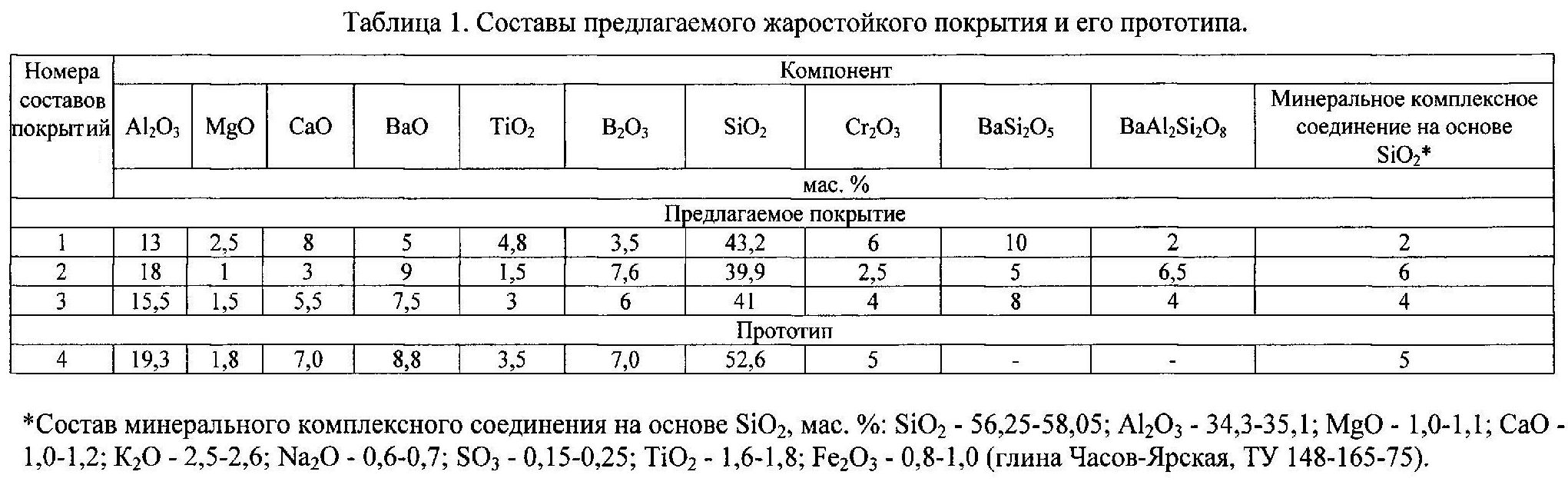 Жаростойкое покрытие, содержащее Al2O3, MgO, СаО, ВаО, TiO2, B2O3, Cr2O3, SiO2 и минеральное комплексное соединение на основе SiO2, отличающееся тем, что оно дополнительно содержит BaSi2O5 и BaAl2Si2O8 при следующем соотношении компонентов, мас. %:Al2O3 13,0-18,0 MgO 1,0-2,5 СаО 3,0-8,0 ВаО 5,0-9,0 TiO2 1,5-4,8 B2O3 3,5-7,6 Cr2O3 2,5-6,0 BaSi2O5 5,0-10,0 BaAl2Si2O8 2,0-6,5 минеральное комплексное соединение на основе SiO2 2,5-6,0 SiO2 остальное