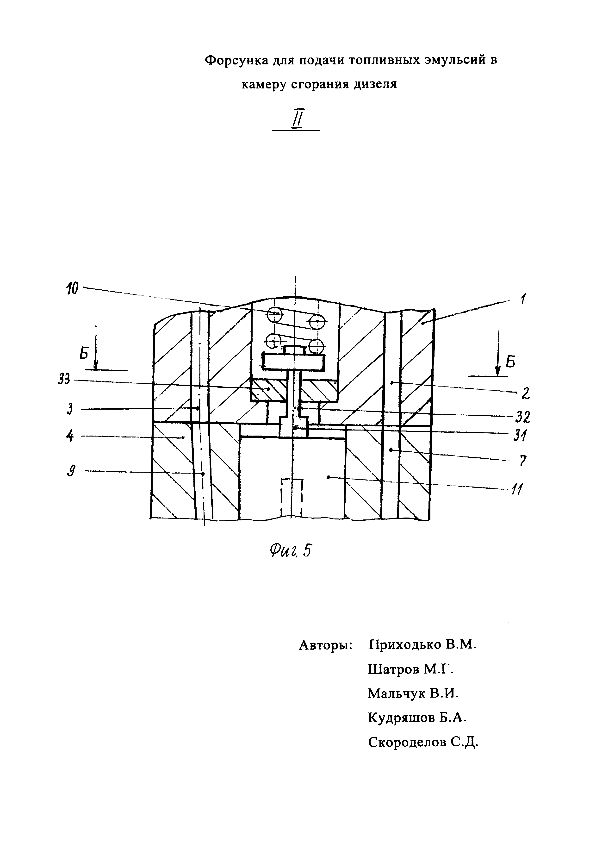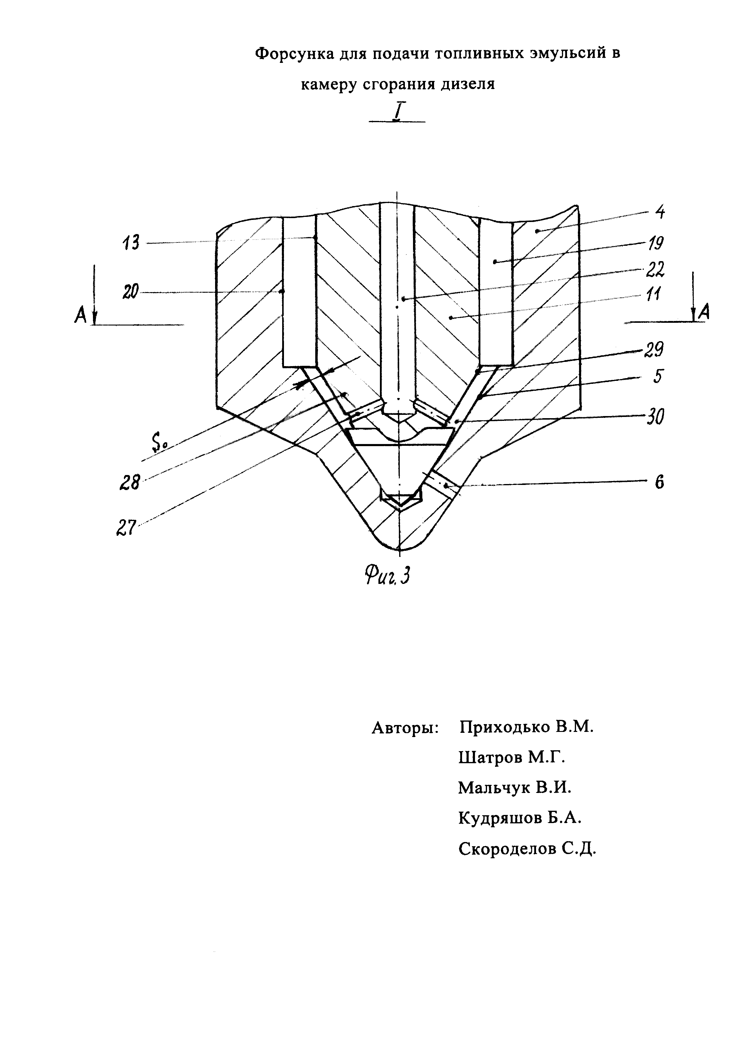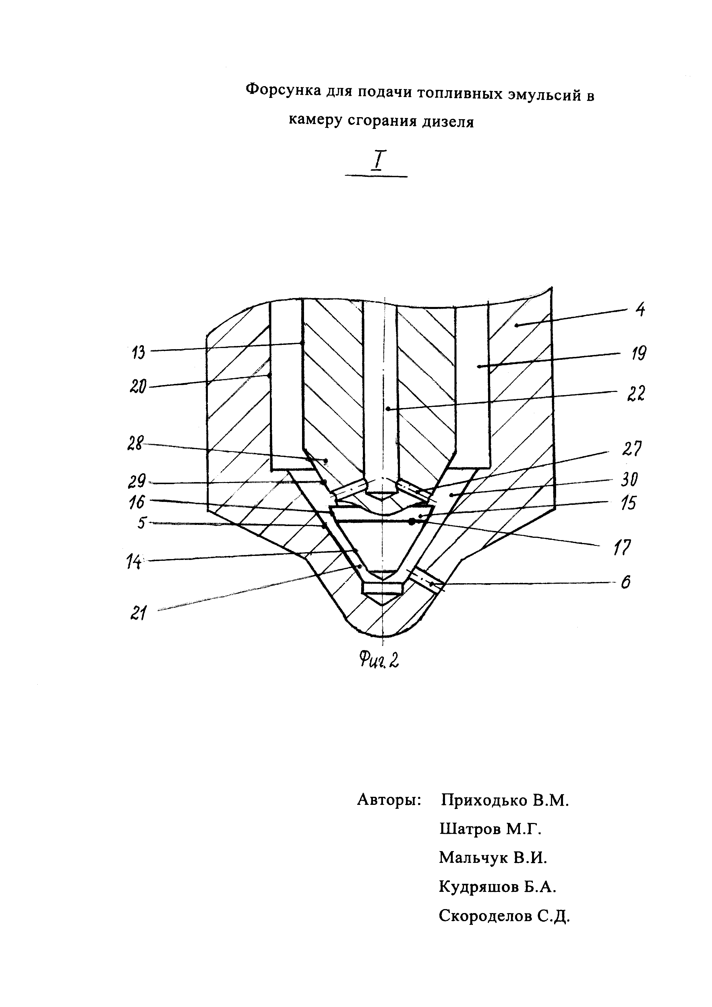 1. Форсунка для подачи топливных эмульсий в камеру сгорания дизеля, содержащая корпус с каналами подвода основного и запального топлива, полый распылитель с запирающим коническим седлом, распыливающими отверстиями, каналами подвода каждого вида топлива, сообщенными с соответствующими каналами подвода топлива в корпусе форсунки, и подпружиненную запирающую иглу, размещенную в полости распылителя и выполненную с направляющей и цилиндрической поверхностями, а также запирающей конической поверхностью с обратным конусом, ограниченным конической поверхностью и кромкой, при этом в распылителе выполнена распределительная полость, связанная с каналами подвода одного из видов топлив и с распыливающими отверстиями посредством кольцевого канала, образованного цилиндрическими поверхностями запирающей иглы и распылителя, а также посредством зазора между их коническими поверхностями, в теле запирающей иглы выполнен осевой канал, сообщенный радиальными каналами с каналами подвода другого вида топлива посредством кольцевой полости между цилиндрическими поверхностями запирающей иглы и распылителя соответственно, а также дополнительные радиальные каналы, выполненные в нижней части запирающей иглы и выходящие одним концом в осевой канал, а другим - в зазор между коническими поверхностями запирающей иглы и распылителя, отличающаяся тем, что в нижней части запирающей иглы выполнена проточка с образованием дополнительного конуса, ограниченного конической поверхностью, меньшее основание которого сопряжено с большим основанием обратного конуса и которое при этом меньше, чем большее основание упомянутого обратного конуса, причем коническая поверхность дополнительного конуса совместно с запирающим коническим седлом распылителя и выходными кромками дополнительных радиальных каналов запирающей иглы образуют полость смешения в виде гарантированного в течение эксплуатационного цикла работы зазора So, значение которого в исходном положении запирающей иглы определяют из следующего соотношения: So≥0,33⋅ymax+sinγ⋅Δyд, [мм], где ymax - максимальный подъем запирающей иглы распылителя, [мм]; γ - угол, образованный осью распылителя и образующей дополнительного конуса нижней части запирающей иглы, [град]; Δyд - допустимое увеличение максимального перемещения запирающей иглы в результате приработки запирающих конических поверхностей запирающей иглы и распылителя, [мм], при этом число k дополнительных радиальных каналов подвода топлива в полость смешения подбирают, исходя из выражения: k=(1÷3)n, где n - число распыливающих отверстий распылителя. 2. Форсунка по п. 1, отличающаяся тем, что в хвостовике запирающей иглы с двух сторон выполнены прямоугольные пазы, допускающие ее осевое перемещение в прямоугольной прорези проставки, установленной с фиксацией в корпусе форсунки.