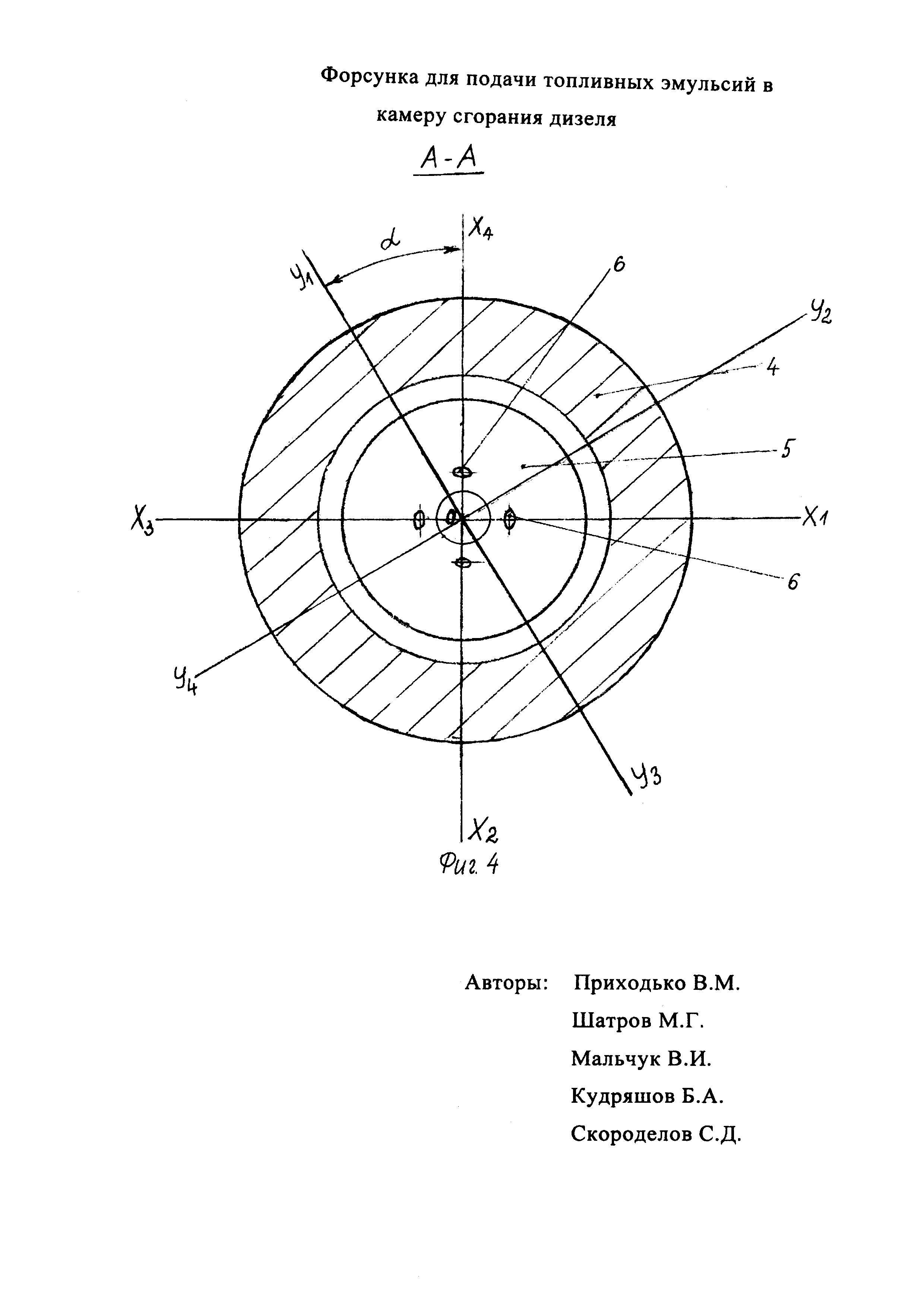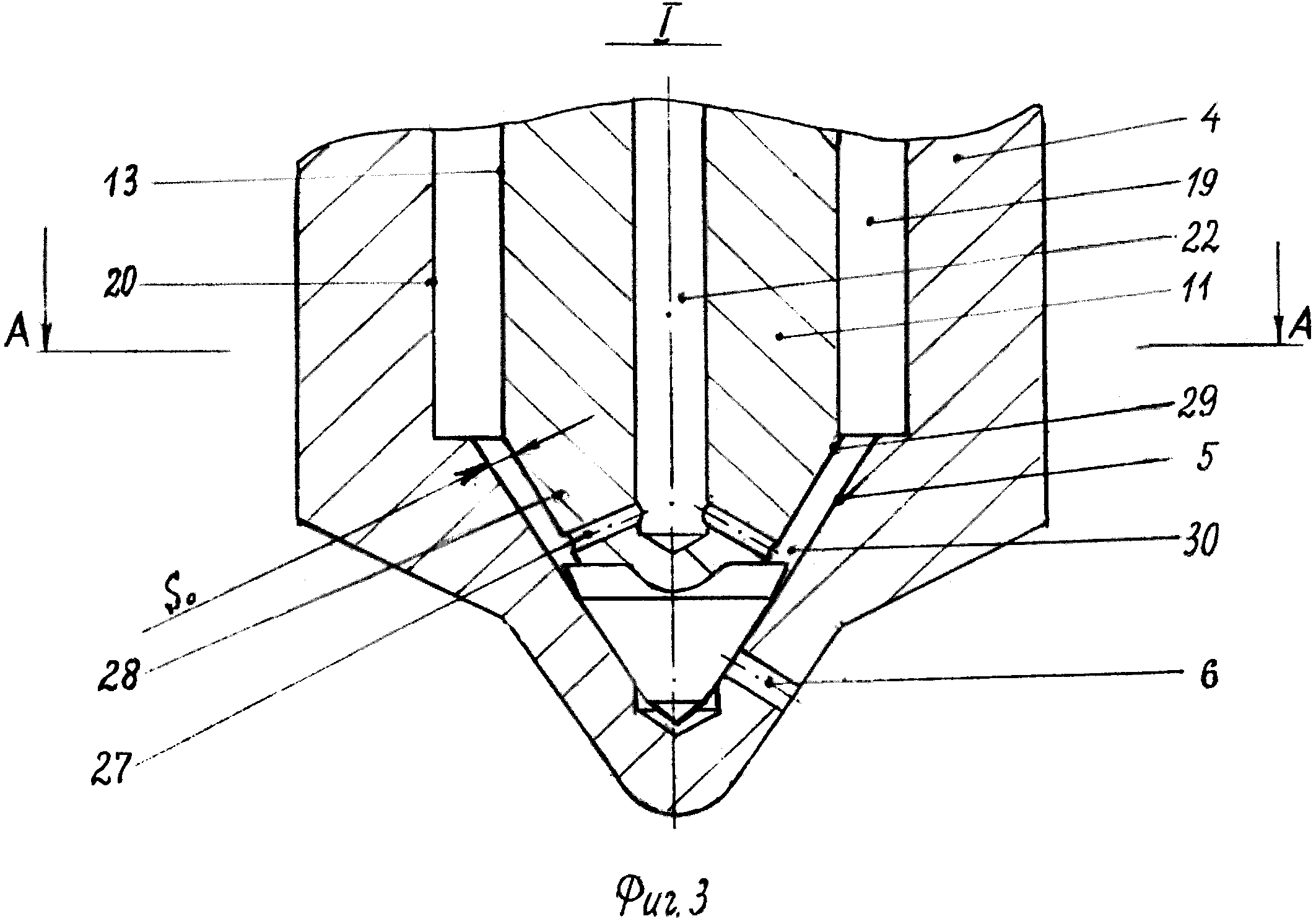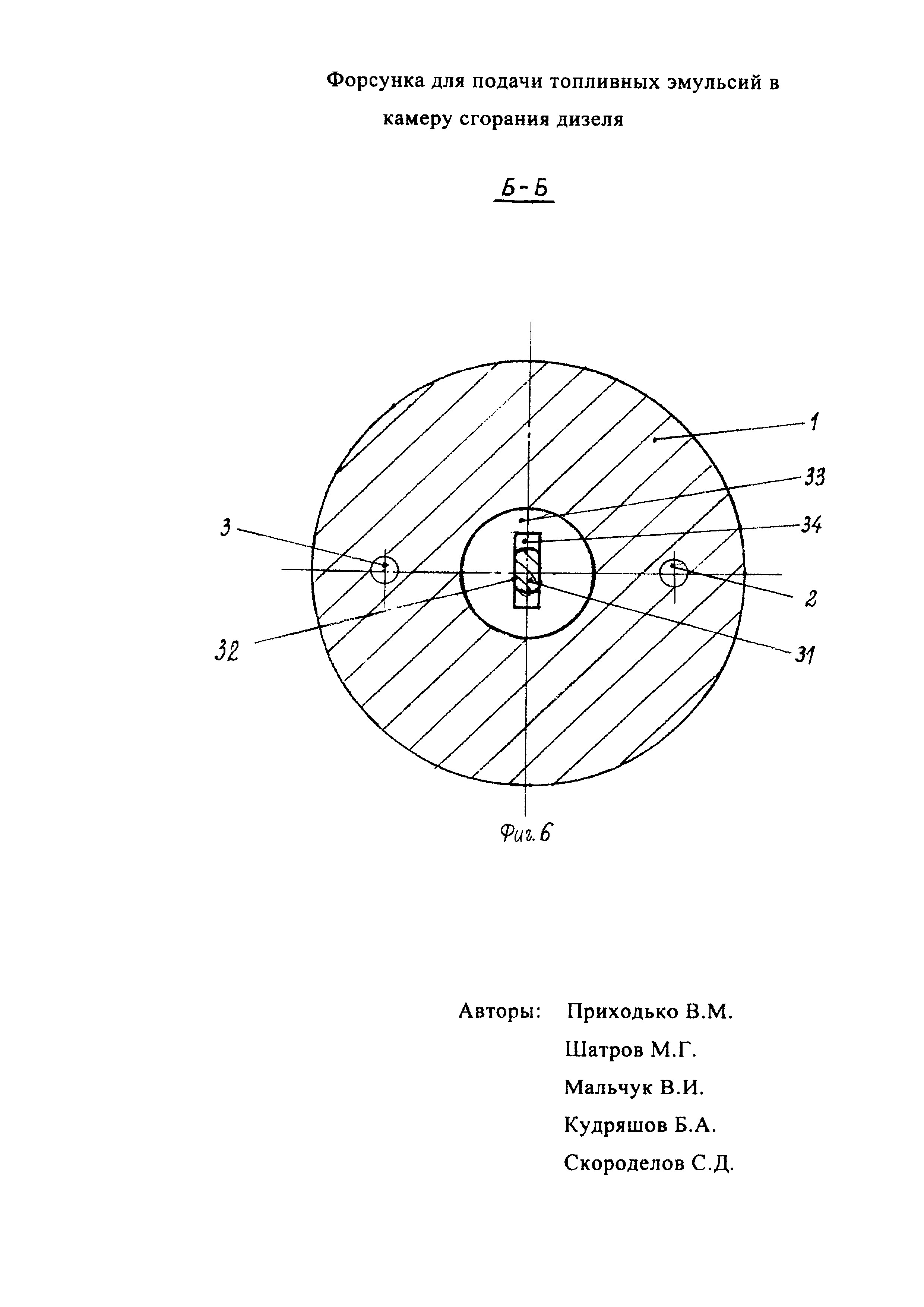 1. Форсунка для подачи топливных эмульсий в камеру сгорания дизеля, содержащая корпус с каналами подвода основного и запального топлива, полый распылитель с запирающим коническим седлом, распыливающими отверстиями, каналами подвода каждого вида топлива, сообщенными с соответствующими каналами подвода топлива в корпусе форсунки, и подпружиненную запирающую иглу, размещенную в полости распылителя и выполненную с направляющей и цилиндрической поверхностями, а также запирающей конической поверхностью с обратным конусом, ограниченным конической поверхностью и кромкой, при этом в распылителе выполнена распределительная полость, связанная с каналами подвода одного из видов топлив и с распыливающими отверстиями посредством кольцевого канала, образованного цилиндрическими поверхностями запирающей иглы и распылителя, а также посредством зазора между их коническими поверхностями, в теле запирающей иглы выполнен осевой канал, сообщенный радиальными каналами с каналами подвода другого вида топлива посредством кольцевой полости между цилиндрическими поверхностями запирающей иглы и распылителя соответственно, а также дополнительные радиальные каналы, выполненные в нижней части запирающей иглы и выходящие одним концом в осевой канал, а другим - в зазор между коническими поверхностями запирающей иглы и распылителя, отличающаяся тем, что в нижней части запирающей иглы выполнена проточка с образованием дополнительного конуса, ограниченного конической поверхностью, меньшее основание которого сопряжено с большим основанием обратного конуса и которое при этом меньше, чем большее основание упомянутого обратного конуса, причем коническая поверхность дополнительного конуса совместно с запирающим коническим седлом распылителя и выходными кромками дополнительных радиальных каналов запирающей иглы образуют полость смешения в виде гарантированного в течение эксплуатационного цикла работы зазора So, значение которого в исходном положении запирающей иглы определяют из следующего соотношения: So≥0,33⋅ymax+sinγ⋅Δyд, [мм], где ymax - максимальный подъем запирающей иглы распылителя, [мм]; γ - угол, образованный осью распылителя и образующей дополнительного конуса нижней части запирающей иглы, [град]; Δyд - допустимое увеличение максимального перемещения запирающей иглы в результате приработки запирающих конических поверхностей запирающей иглы и распылителя, [мм], при этом число k дополнительных радиальных каналов подвода топлива в полость смешения подбирают, исходя из выражения: k=(1÷3)n, где n - число распыливающих отверстий распылителя. 2. Форсунка по п. 1, отличающаяся тем, что в хвостовике запирающей иглы с двух сторон выполнены прямоугольные пазы, допускающие ее осевое перемещение в прямоугольной прорези проставки, установленной с фиксацией в корпусе форсунки.