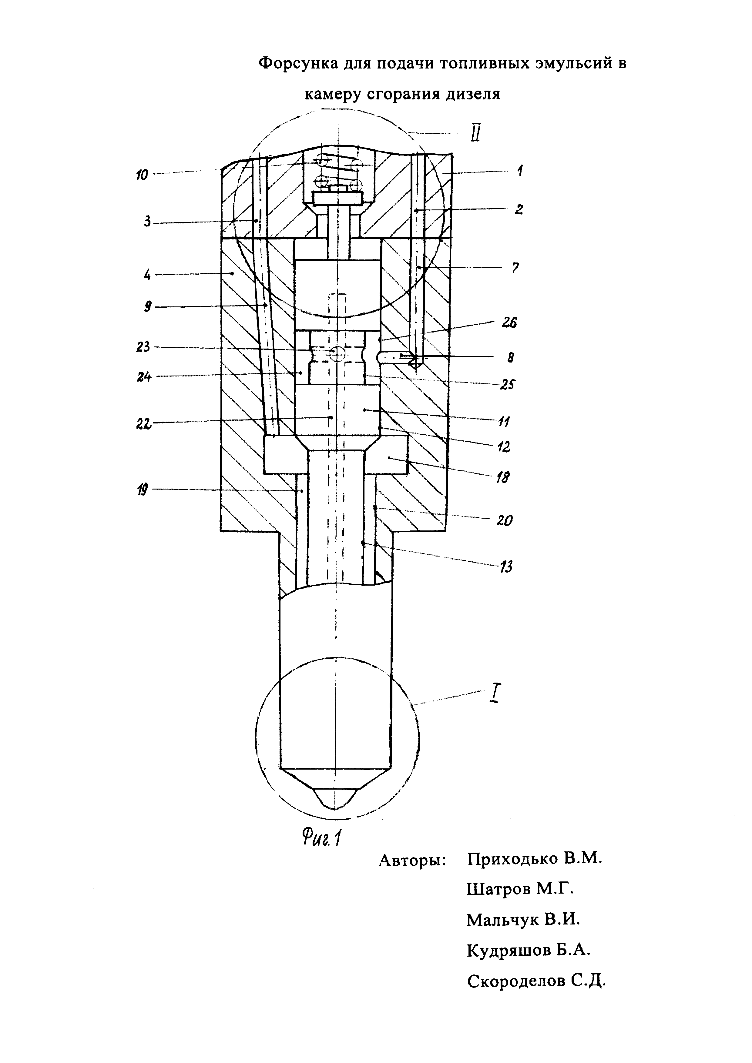 Изобретение относится к транспортному машиностроению и может быть использовано в конструкциях дизельных двигателей. В дизелях получили большое распространение топливные системы, включающие топливный насос ТНВД с механическим приводом плунжера, топливопровод и форсунку с подпружиненной запирающей иглой в распылителе [1]. Эти системы приемлемы для подачи в камеру сгорания традиционного, альтернативного топлива и их смесей [2]. Недостаток этих систем состоит в том, что конструкции не позволяют изменять массовый состав смесей с учетом многорежимности, а также в процессе впрыскивания, что необходимо для обеспечения высоких эксплуатационных характеристик дизеля в условиях совместного применения традиционных, альтернативных топлив и присадок [2; 3]. Известна принятая в качестве прототипа форсунка для дизеля для подачи двух видов топлива в двигатель, состоящая из корпуса с закрепленным в нем распылителем, в полости которого установлена подпружиненная запирающая игла, имеющая направляющую, цилиндрическую и коническую запирающую поверхности. В корпусе и полом распылителе выполнены связанные между собой соответствующие каналы подвода основного и запального топлив. При этом в теле иглы выполнен центральный канал, связанный с каналами подвода запального топлива, а в нижней части иглы с выходом на ее коническую запирающую поверхность - радиальные каналы, которые при подъеме иглы сообщаются с распыливающими отверстиями. Канал подвода основного топлива связан с полостью распределительной полости - карманом распылителя и при подъеме иглы также сообщается посредством кольцевого канала с распыливающими отверстиями, образуя совместно с запальным топливом смесь с определенным коэффициентом состава смеси Ксм [4]. Недостаток прототипа состоит в том, что в эксплуатационных условиях происходит приработка запирающих конусов иглы и седла, уменьшение подачи присадки в полость смешения при увеличении ее поступления в кольцевой канал между корпусом распылителя и запирающей иглой. Согласно конструкции [4] поперечное сечение отмеченного кольцевого канала в разы больше, чем поперечное сечение полости смешения смесей, расположенной в зазоре запирающих конусов корпуса распылителя и запирающей иглы. В результате массовая доля присадки в кольцевом канале будет существенно меньше, чем в предусмотренной конструкцией полости смешения, что приведет к существенному уменьшению динамики ввода присадки в камеру сгорания дизеля практически на всех режимах и ухудшению воспламенения смеси. Кроме этого, отмеченное перераспределение присадки по объемам распылителя существенно скажется на характеристиках двигателя при неустановившихся режимах, что в значительной степени проявится при уменьшении нагрузки с рабочего режима до режима холостого хода. Оценка токсичности дизеля на неустановившихся режимах предусмотрена, в частности, Европейским тестом ETC. Технической задачей, решаемой изобретением, является получение возможности коррекции массового состава смеси, подаваемой в камеру сгорания дизеля в процессе рабочего цикла, и улучшение протекания характеристик массового состава смеси и их стабильность в процессе эксплуатации. Дополнительной технической задачей изобретения является обеспечение идентичности рабочих циклов в различны