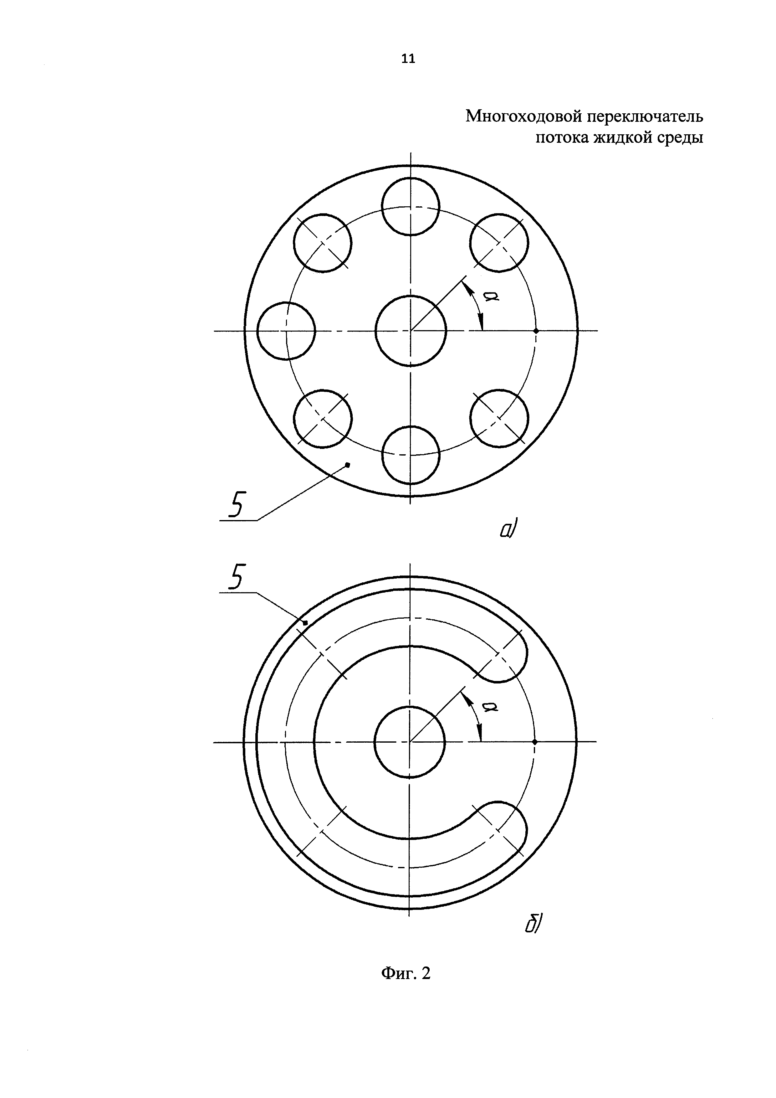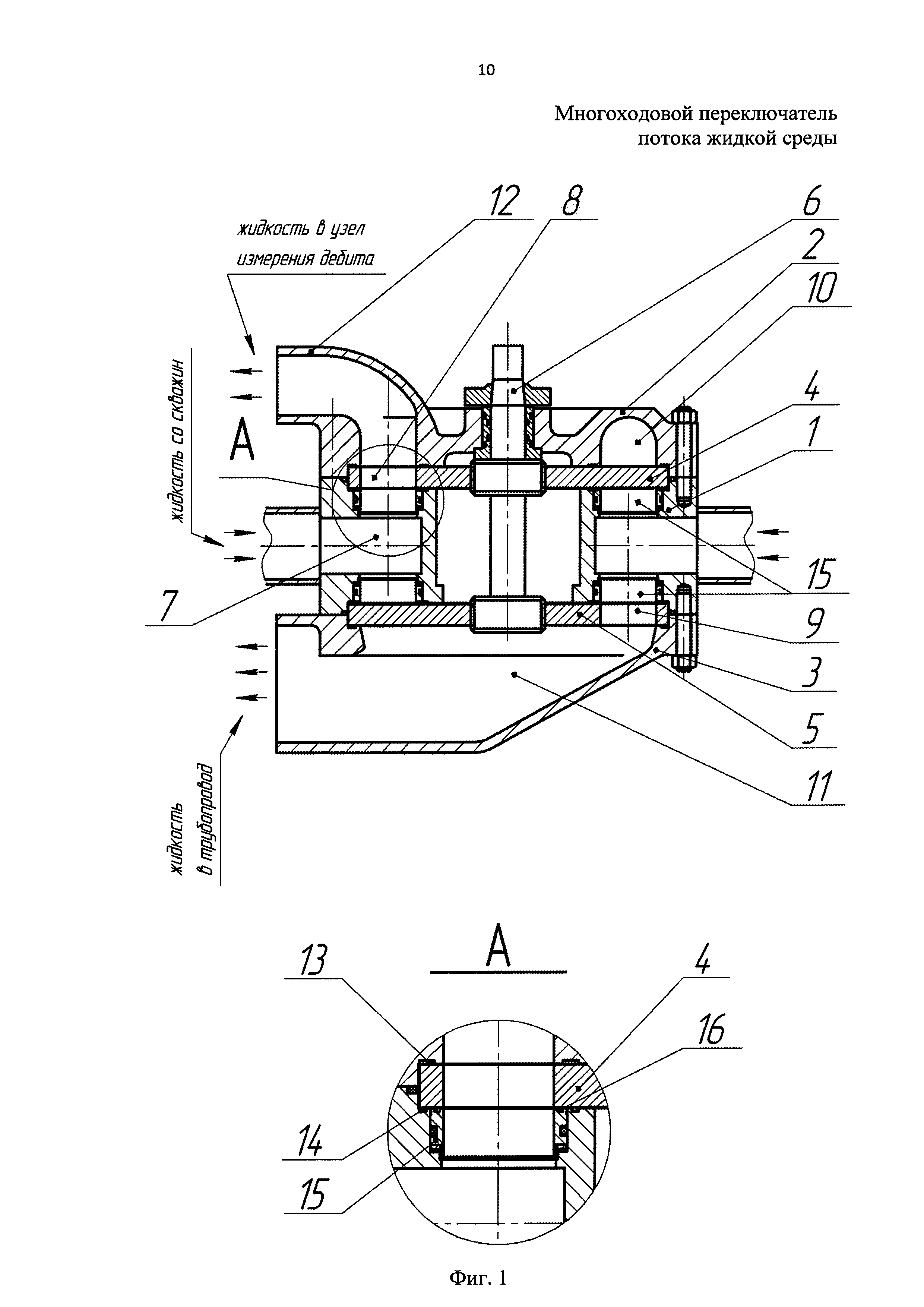 1. Многоходовой переключатель потока жидкой среды, содержащий корпус с равномерно расположенными с угловым шагом α Т-образными радиальными распределительными каналами, верхнюю и нижнюю торцевые крышки, между которыми и торцами корпуса расположены соответственно верхний дисковый шибер с одним отверстием и нижний дисковый шибер с количеством отверстий, на одно меньше количества Т-образных радиальных распределительных каналов в корпусе, расположенных с угловым шагом, аналогичным расположению радиальных распределительных каналов, таким образом, что все они перекрыты верхним дисковым шибером, а шиберы соединены посредством вала, расположенного вдоль оси корпуса, и образуют с верхней и нижней торцевыми крышками соответственно верхнюю и нижнюю полости, причем верхняя полость имеет кольцеобразную форму, образованную кольцеобразной внутренней поверхностью верхней торцевой крышки, и сообщается с каналом подачи жидкости в узел измерения дебита, а нижняя полость сообщается с каналом подачи жидкости в трубопровод, при этом верхний и нижний дисковые шиберы ориентированы с возможностью переключения канала подачи жидкости в узел измерения дебита через отверстие в верхнем дисковом шибере к Т-образным радиальным распределительным каналам, а на поверхностях верхней и нижней торцевых крышек и корпуса, соприкасающихся с дисковыми шиберами, расположены кольцевые подшипники скольжения, при этом плоские поверхности верхнего и нижнего дисковых шиберов уплотнены по корпусу посредством подпружиненных седел, установленных в вертикальных участках Т-образных радиальных распределительных каналов и снабженных кольцевыми вставками на уплотняющих поверхностях. 2. Переключатель потока по п. 1, отличающийся тем, что кольцевые вставки на подпружиненных седлах выполнены из металлокерамического или полимерного материала. 3. Переключатель потока по п. 1, отличающийся тем, что верхний и нижний дисковые шиберы имеют износостойкое и антикоррозионное покрытия. 4. Переключатель потока по п. 1, отличающийся тем, что верхний и нижний дисковые шиберы выполнены из коррозионностойкого материала. 5. Переключатель потока по п. 1, отличающийся тем, что отверстия в нижнем дисковом шибере объединены в одно дугообразное отверстие.