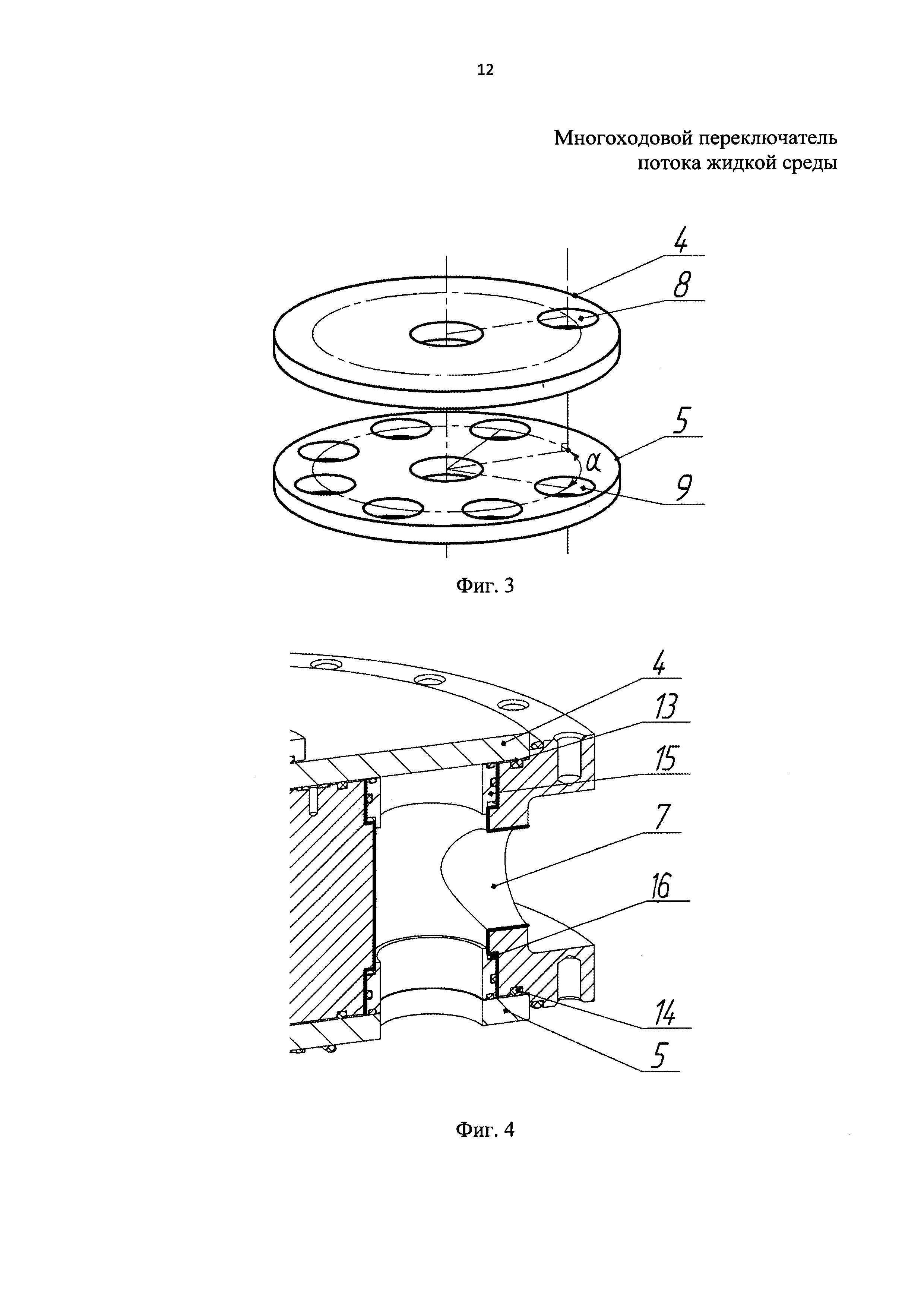 Изобретение относится к многоходовым переключателям потоков жидкой среды в трубопроводных системах в области добычи нефти и может быть использовано для переключения направления потока жидкой среды от подводящих трубопроводов добывающих скважин на устройство, замеряющее дебит скважины. Многоходовый переключатель потока жидкой среды содержит корпус с равномерно расположенными с угловым шагом α Т-образными радиальными распределительными каналами, верхнюю и нижнюю торцевые крышки, между которыми и торцами корпуса расположены соответственно верхний дисковый шибер с одним отверстием и нижний дисковый шибер с количеством отверстий, на одно меньше количества Т-образных радиальных распределительных каналов в корпусе, расположенных с угловым шагом, аналогичным расположению радиальных распределительных каналов таким образом, что все они перекрыты верхним дисковым шибером, а шиберы соединены посредством вала, расположенного вдоль оси корпуса, и образуют с верхней и нижней торцевыми крышками соответственно верхнюю и нижнюю полости, причем верхняя полость имеет кольцеобразную форму, образованную кольцеобразной внутренней поверхностью верхней торцевой крышки, и сообщается с каналом подачи жидкости в узел измерения дебита, а нижняя полость сообщается с каналом подачи жидкости в трубопровод, при этом верхний и нижний дисковые шиберы ориентированы с возможностью переключения канала подачи жидкости в узел измерения дебита через отверстие в верхнем дисковом шибере к Т-образным радиальным распределительным каналам, а на поверхностях верхней и нижней торцевых крышек и корпуса, соприкасающихся с дисковыми шиберами, расположены кольцевые подшипники скольжения, при этом плоские поверхности верхнего и нижнего дисковых шиберов уплотнены по корпусу посредством подпружиненных седел, установленных в вертикальных участках Т-образных радиальных распределительных каналов и снабженных кольцевыми вставками на уплотняющих поверхностях. Изобретение позволяет упростить процесс распределения потока жидкой среды с одновременным обеспечением герметизации пространства между изолированными полостями устройства и повысить его надежность. 4 з.п. ф-лы, 4 ил.