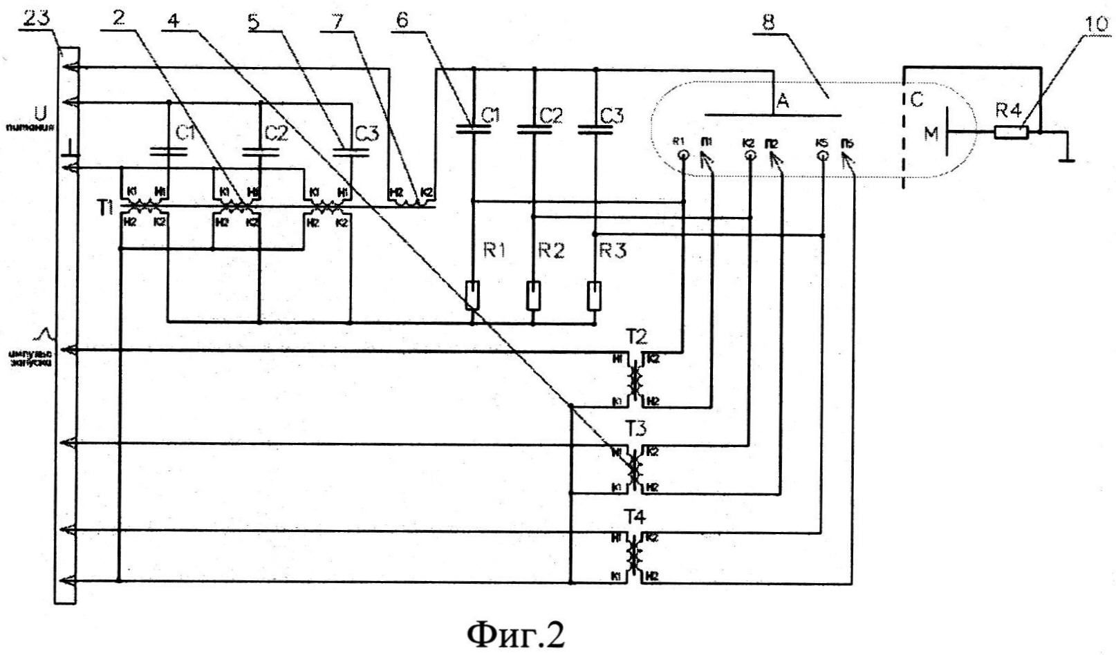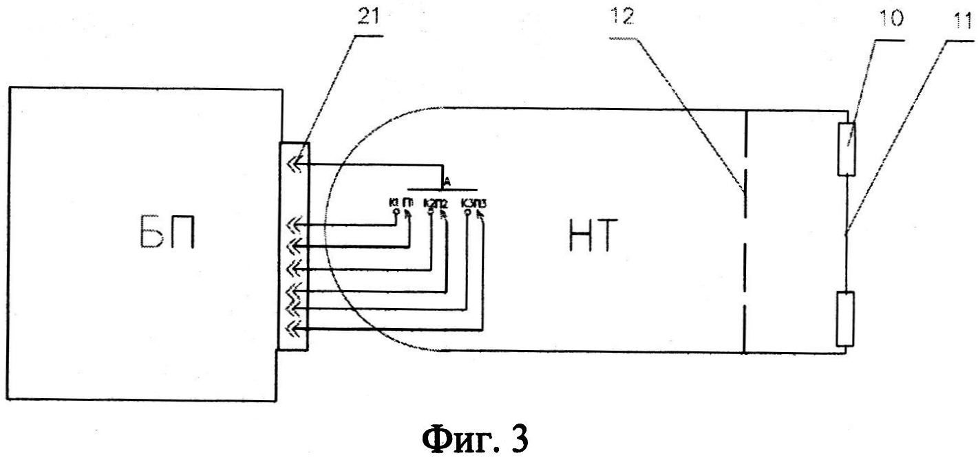 1. Блок излучателя нейтронов, содержащий нейтронную трубку со схемой питания, включающей накопительный конденсатор, схему формирования ускоряющего импульса напряжения на нейтронную трубку, схему питания ионного источника нейтронной трубки, схему формирования импульса поджига нейтронной трубки, причем схема питания размещена отдельным блоком в металлическом герметичном корпусе, залитом жидким диэлектриком, с системой термокомпенсации, отличающийся тем, что нейтронная трубка с металлическим корпусом герметично закреплена на торце корпуса блока схемы питания, имеет с ним тепловой и электрический контакты с возможностью смены нейтронной трубки, нейтронная трубка размещена с зазором между высоковольтным изолятором нейтронной трубки и изолятором блока схемы питания, заполненным газообразным диэлектриком. 2. Блок излучателя нейтронов по п.1, отличающийся тем, что между корпусом нейтронной трубки и мишенью расположено керамическое кольцо с электрическим сопротивлением, равным сопротивлению смещения. 3. Блок излучателя нейтронов по п.1, отличающийся тем, что блок схемы питания и нейтронная трубка электрически соединены между собой плавающими контактами.