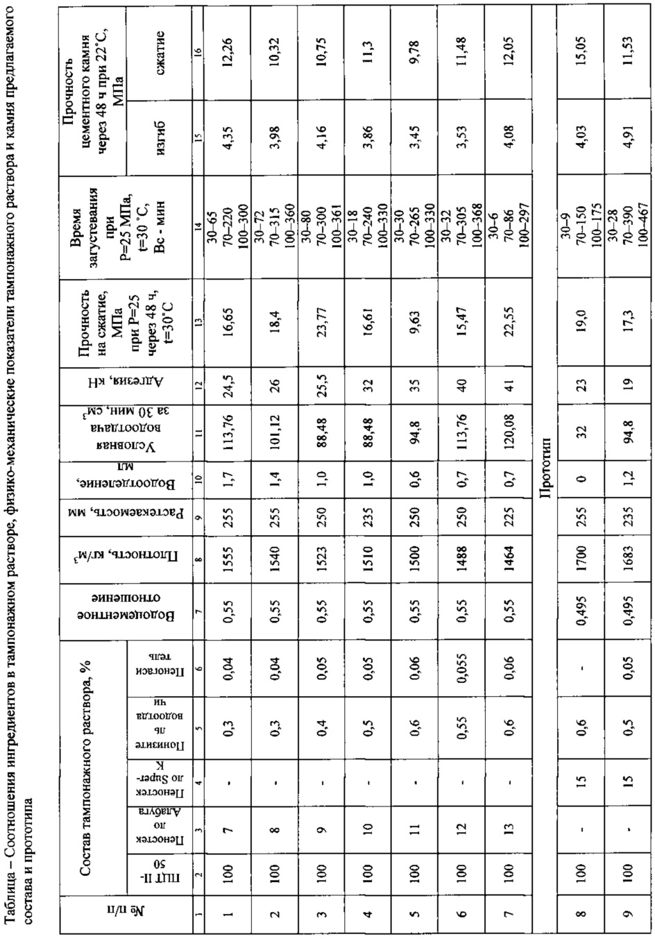 Изобретение относится к нефтегазодобывающей промышленности, а именно к строительству нефтяных и газовых скважин, и может быть использовано при креплении скважины в зоне продуктивного пласта тампонажным материалом с добавлением пеностекла. Известен облегченный тампонажный раствор для продуктивной зоны скважины и способ цементирования скважин (патент RU №2255205, МПК Е21В 33/138, опубл. 27.06.2005 г., бюл. №18), в котором указан состав тампонажного раствора для цементирования интервала продуктивного пласта, включающий портландцемент, оксихлорид алюминия, понизитель водоотдачи, пеногаситель, ускоритель схватывания и пластификатор. Недостатками данного раствора являются малая прочность цементного камня на изгиб и сжатие, низкая адгезия цементного раствора к обсадной трубе и породе. Наиболее близкой по составу и назначению к предлагаемому тампонажному составу является рецептура тампонажного раствора (Опыт повышения качества крепления скважин в ОАО «Татнефть»/ Р.С. Хисамов [и др.] // Нефтяное хозяйство. - 2012. - №5. С. 45-47, и Опытное применение облегченной тампонажной смеси в ОАО «Татнефть»/ А.Я. Вакула [и др.] // Бурение и нефть. - 2013. - №4. - С. 26-28). В качестве наполнителя в ней использованы стеклянные полнотелые увеличенные в объеме (0,1 - 0,8 мм) гранулы плотностью 1000 кг/м3 с закрытыми порами. Недостатком данного тампонажного состава для цементирования продуктивного интервала является нестабильность состава из-за высокой гигроскопичности (до 10%), препятствующей равномерному смешению с сухим цементом с образованием комков, что может привести к недостижению заявленной прочности сцепления цементного камня с обсадной колонной. Техническими задачами настоящего изобретения являются сокращение материальных и финансовых затрат за счет уменьшения расхода используемого и более дешевого инертного абразивного наполнителя, а также расширение технологических возможностей применения тампонажного состава за счет возможности изменения диапазона плотностей при сохранении высоких технологических показателей получаемого раствора и высокой прочности цементного камня из него, а также прочности сцепления цементного камня с обсадной колонной и стенкой скважины. Поставленные технические задачи решаются описываемым тампонажным составом для крепления продуктивной зоны скважины, включающим тампонажный портландцемент, абразивную добавку. Новым является то, что состав дополнительно содержит пеногаситель и понизитель водоотдачи, а в качестве абразивной добавки используют пеностекло, имеющее гранулометрический состав 0,35-1,5 мм, водопоглощение по объему - 2-5%, насыпную плотность гранул - 300±50 кг/м3 при следующем соотношении компонентов, мас. % от массы цемента: По мнению авторов и заявителя такая совокупность признаков патентуемого состава позволяет сделать вывод о его патентоспособности, поскольку нижние и верхние пределы пеностекла отличаются от прототипа и при этом состав обладает хорошими адгезионными свойствами (см. таблицу), превышающими показатель прототипа в 1,5 раза при меньшем содержании инертного наполнителя - пеностекла (7-13%), тогда как у прототипа - 15%, причем он в три раза дешевле импортного, взятого за прототип. Предварительные исследования по патентным источникам показали, что в пределах 7-13% добавки пеностекла не обнаружено. Основные показа