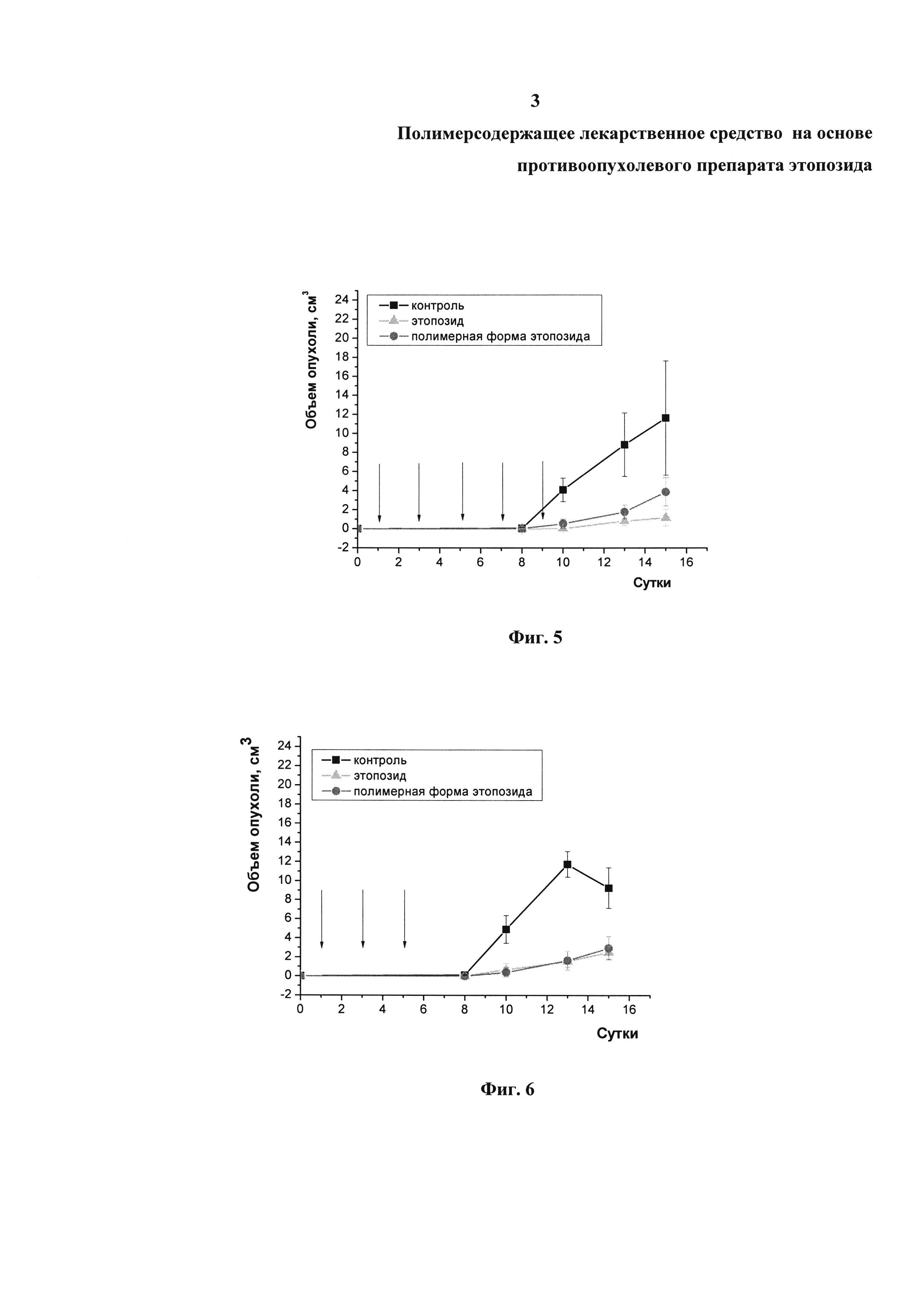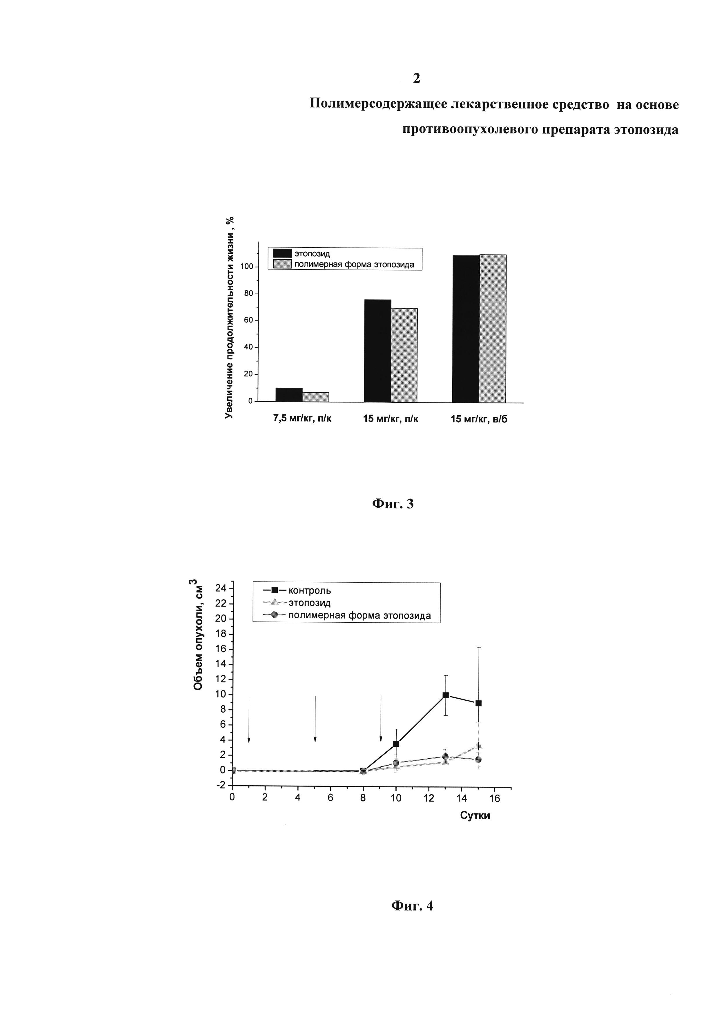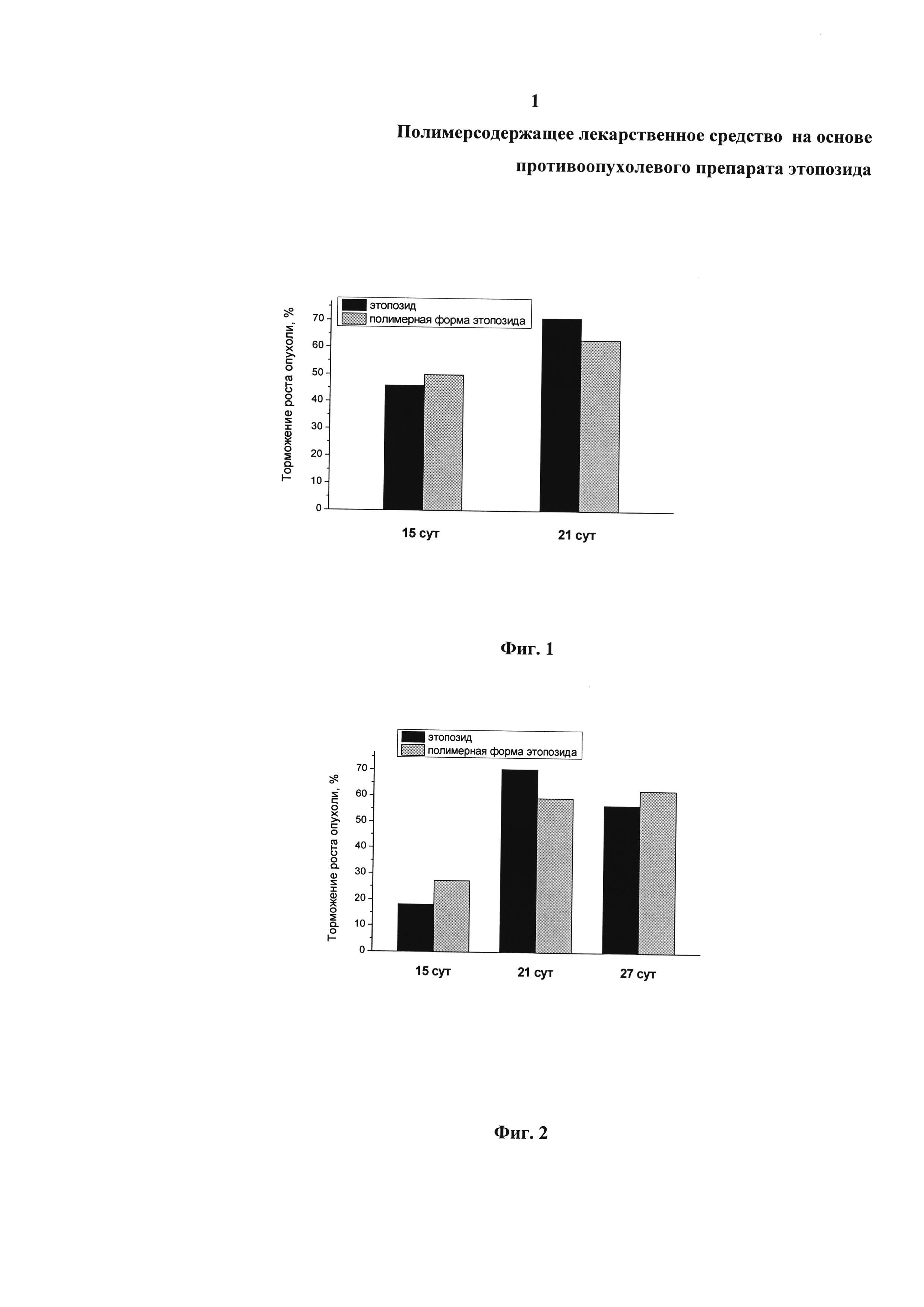 Изобретение относится к области фармакологии и медицины, а именно к новому поколению противоопухолевых препаратов на основе этопозида, и описывает полимерсодержащее лекарственное средство на основе противоопухолевого препарата этопозида, который включает биодеградируемый полимер в виде сополимера молочной и гликолевой кислот с характеристической вязкостью 0,41 дл/г и молярным соотношением мономерных звеньев 50 на 50%, поверхностно-активное вещество в виде поливинилового спирта, криопротектор в виде D-маннитола, представляющее собой частицы субмикронного размера, следующего состава, мас.%: этопозид - 5.0÷8,0; сополимер молочной и гликолевой кислот - 55.0÷61.0; поливиниловый спирт - 16.0÷18.0; D-маннитол - 17.0÷20.0. Изобретение характеризуется высокой противоопухолевой активностью при подкожном, внутрибрюшинном и внутривенном путях введения, а также пониженным уровнем токсического действия и может быть использовано для лечения злокачественных новообразований. 1 з.п. ф-лы, 6 ил., 2 табл., 4 пр.