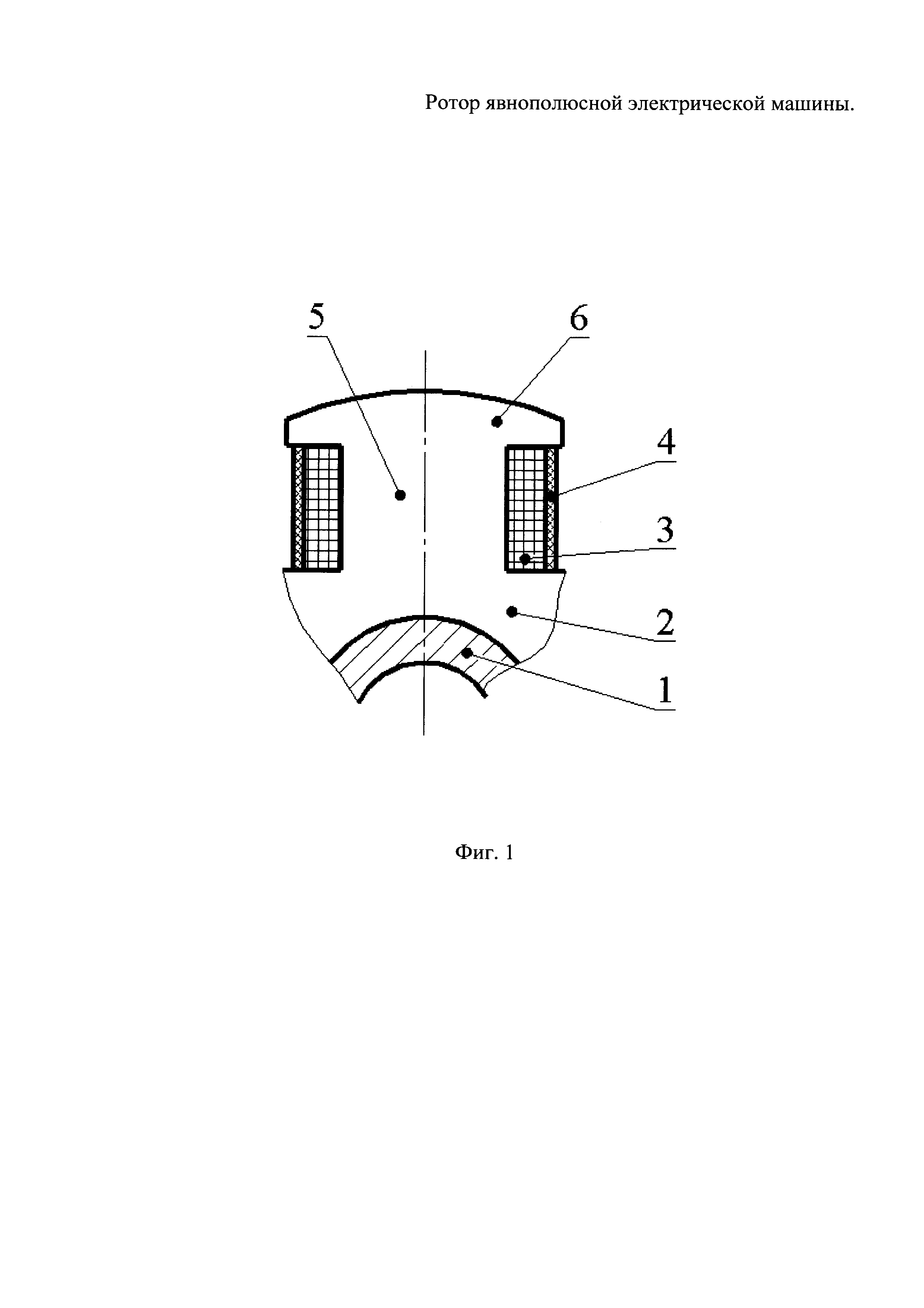 Изобретение относится к электрическим машинам, а именно к явнополюсным электрическим машинам, и может быть использовано при проектировании электрических машин различного назначения. Из уровня техники известны конструкции роторов явнополюсных машин, например, ротор, раскрытый в способе изготовления ротора явнополюсной электрической машины по опубликованной заявке RU 2005104219 «Способ изготовления ротора явнополюсной электрической машины», опубл. 27.07.2006, сердечник которого выполняют как единое целое, состоящее из ярма ротора и сердечников полюсов с полюсными наконечниками. Катушки ротора выполняют из длинномерного материала и размещают на полюсах сердечников. Для того чтобы катушки не разрушались центробежными силами, возникающими во время работы ротора, катушки, после размещения их на полюсах, опрессовывают. Такая конструкция не обеспечивает достаточной надежности и эффективности работы электрической машины при работе ротора на повышенных частотах вращения. Наиболее близкой к предлагаемому техническому решению является конструкция сборного ротора явнополюсной электрической машины с катушками: Поспелов Л.И. Конструкции авиационных электрических машин. Под ред. А.Ф. Федосеева. - М.: Энергоиздат, 1982, стр. 112, рис. 5.3, стр. 117, рис. 5.9, которая содержит вал, магнитную систему в виде полюсов и ярма, демпферные обмотки, катушки, по которым протекает ток для создания магнитного потока, и угловые распорки, обеспечивающие фиксацию катушек. Указанная конструкция ротора с катушками обеспечивает высокие энергетические характеристики электрических машин и обладает достаточной надежностью при невысоких скоростях вращения. Однако для работы на повышенных частотах вращения в большинстве конструкций роторов требуется применение крепежных деталей из немагнитного, как правило, материала, предохраняющих катушки ротора от разрушения центробежными силами при вращении. Применение таких крепежных деталей за счет усложнения конструкции снижает надежность работы электрической машины. Техническим результатом изобретения является повышение эффективности использования ротора за счет использования его при повышенных частотах вращения, повышение надежности работы электрической машины. Технический результат достигается посредством создания ротора явнополюсной электрической машины, содержащего вал, сердечник, выполненный как единое целое, состоящий из ярма ротора и полюсов с полюсными наконечниками, катушки, размещенные по прямоугольному контуру вокруг полюсов, при этом каждая катушка снабжена бандажом прямоугольной формы, выполненным в виде слоев немагнитного синтетического материала и размещенным с натягом по всей внешней поверхности катушки. На фиг. 1, иллюстрирующей изобретение, представлен разрез ротора явнополюсной электрической машины, где: 1 - вал; 2 - ярмо ротора как составная часть единого сердечника ротора; 3 - катушка; 4 - бандаж; 5 - полюс как составная часть единого сердечника ротора; 6 - полюсной наконечник как составная часть единого сердечника ротора. Ротор явнополюсной электрической машины содержит вал (1), ярмо ротора (2), катушку (3), бандаж (4), полюс (5), полюсной наконечник (6). Ярмо ротора (2), полюс (5) и полюсной наконечник (6) выполнены как единое целое и образуют сердечник ротора. Магнитная система может быть выполнена к