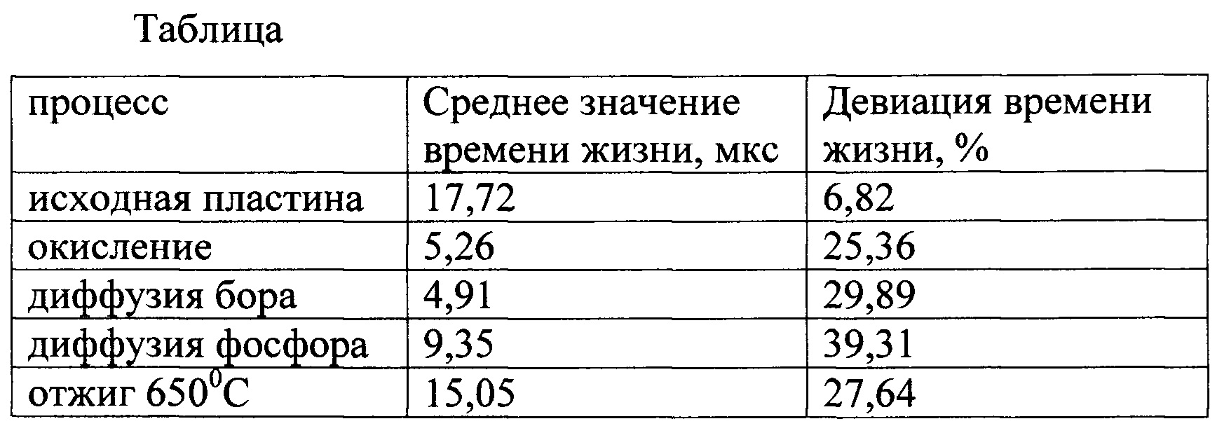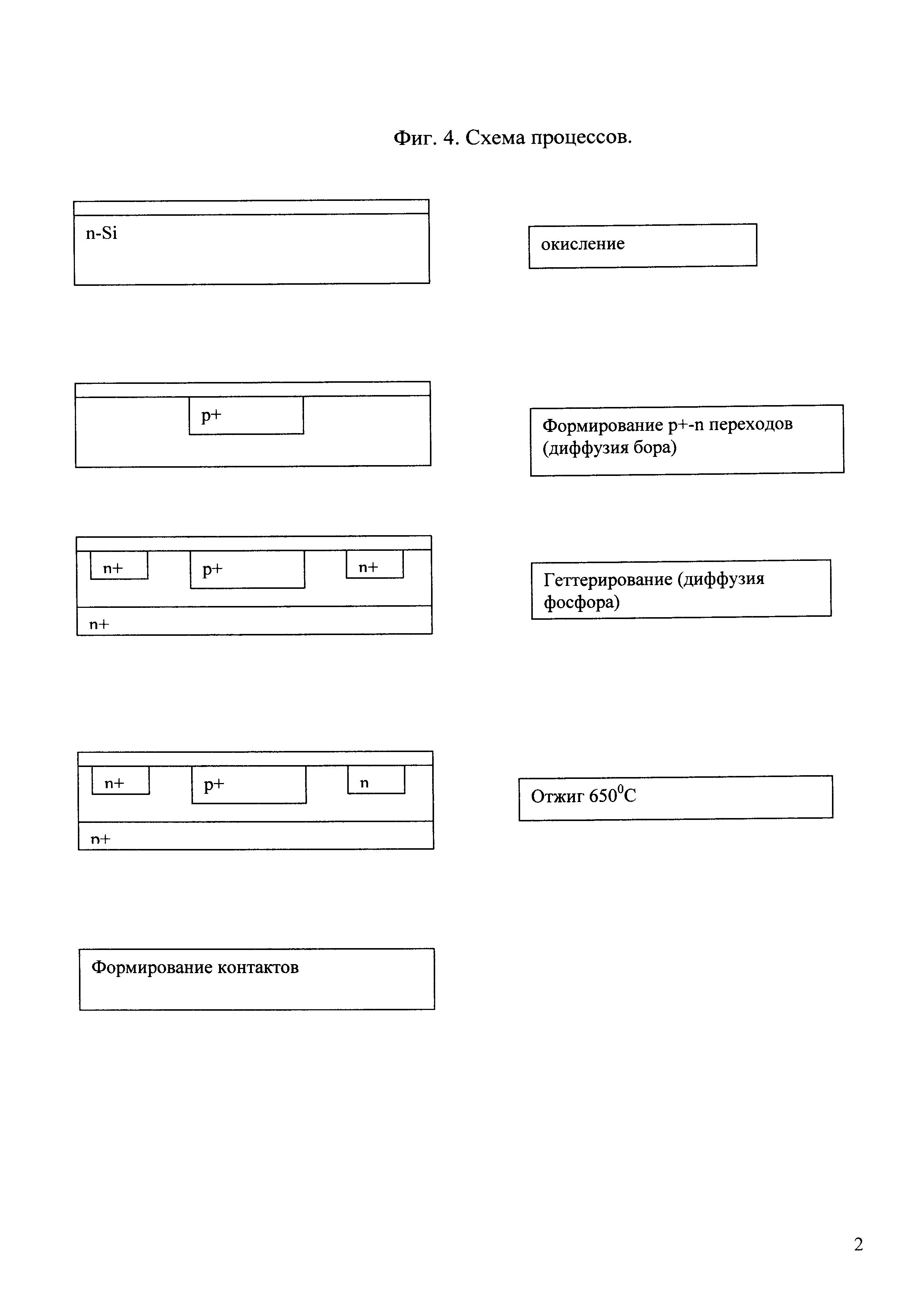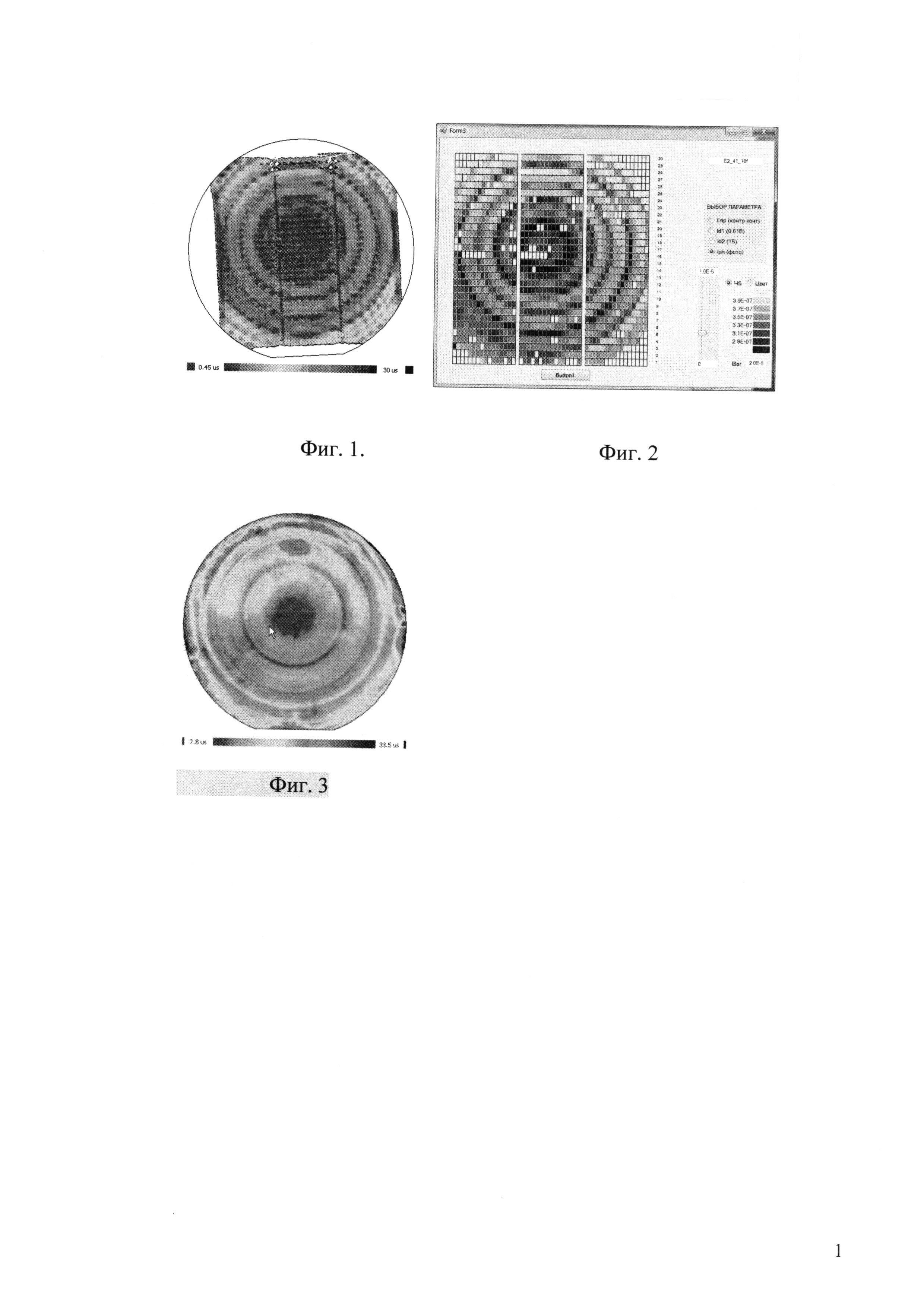 Изобретение относится к технологии изготовления кремниевых фотодиодов (ФД), чувствительных к излучению с длинами волн 0,4-1,0 мкм, и изготавливаемых на кремнии n-типа проводимости. Они предназначены для использования в различной электронно-оптической аппаратуре, в которой требуется высокая пороговая чувствительность. К такой аппаратуре относятся системы наведения, астроориентации и другие системы. Известен патент [№2169412 с приоритетом от 05.10.1999 г. Вовк О.В.], способ изготовления фотодиода, в котором описана технология ФД, содержащая эпитаксиальную структуру n-n+ с фоточувствительными областями в виде планарных р+-n-переходов. Известна техническая документация АГЦ 3.368.253 ТУ на фотодиод ФД 297М [ВИМИ, г. Москва, 1992], способ изготовления которого принят в качестве ближайшего аналога. В подложке из монокристаллического кремния n-типа проводимости с помощью диффузии бора через пленку двуокиси кремния (SiO2) сформированы фоточувствительные области p+-типа проводимости. На другой стороне подложки диффузией фосфора сформирован слой n+-типа проводимости. Создание двухслойных омических контактов к фоточувствительной р+-области и контактному слою n+-типа проводимости осуществляется путем нанесения пленки алюминия. Недостатком этого способа изготовления является достаточно большой разброс в величинах чувствительности и темнового тока в фотодиодах одной партии, вызванный наличием кольцевых неоднородностей в пространственном распределении времени жизни неосновных носителей заряда по пластине (фиг. 1 - распределение времени жизни в пластине до отжига), что вызывает разброс параметров фотодиодов (фиг. 1 и 2 - распределение фоточувствительности фотодиодов до отжига) и снижает процент выхода годных фотодиодов. Это особенно негативно сказывается на проценте выхода многоэлементных фотодиодов, так как ухудшает один из основных параметров - неравномерность чувствительности между элементами. Задачей предлагаемого изобретения является снижение разброса в величинах чувствительности и темнового тока и увеличение процента выхода годных приборов. Технический результат достигается тем, что после проведения следующих высокотемпературных термодиффузионных процессов для создания структуры ФД: - термического окисления; - диффузии бора для создания областей р+-типа проводимости (фоточувствительных площадок); - диффузии фосфора в тыльную поверхность пластины для геттерирования загрязняющих примесей, проводится отжиг пластин со сформированными структурами при температуре ~650°C в атмосфере азота в течение 4 часов. Далее проводится процесс формирования омических контактов. Результатом является значительное увеличение значений и снижение разброса времени жизни носителей зарядов по пластине и, соответственно, улучшение параметров фотодиодов и их однородности (фиг. 3 распределение времени жизни в пластине после отжига 650°C). Таблица показывает характеристики времени жизни носителей по последовательности процессов. Сущность изобретения поясняется схемой (фиг. 4), на которой представлены последовательности термодиффузионных процессов, используемые при изготовлении фотодиода-аналога и фотодиода по предлагаемому способу.