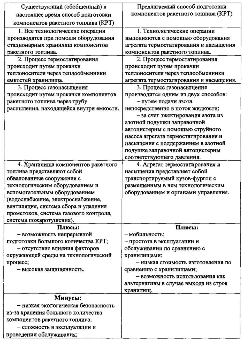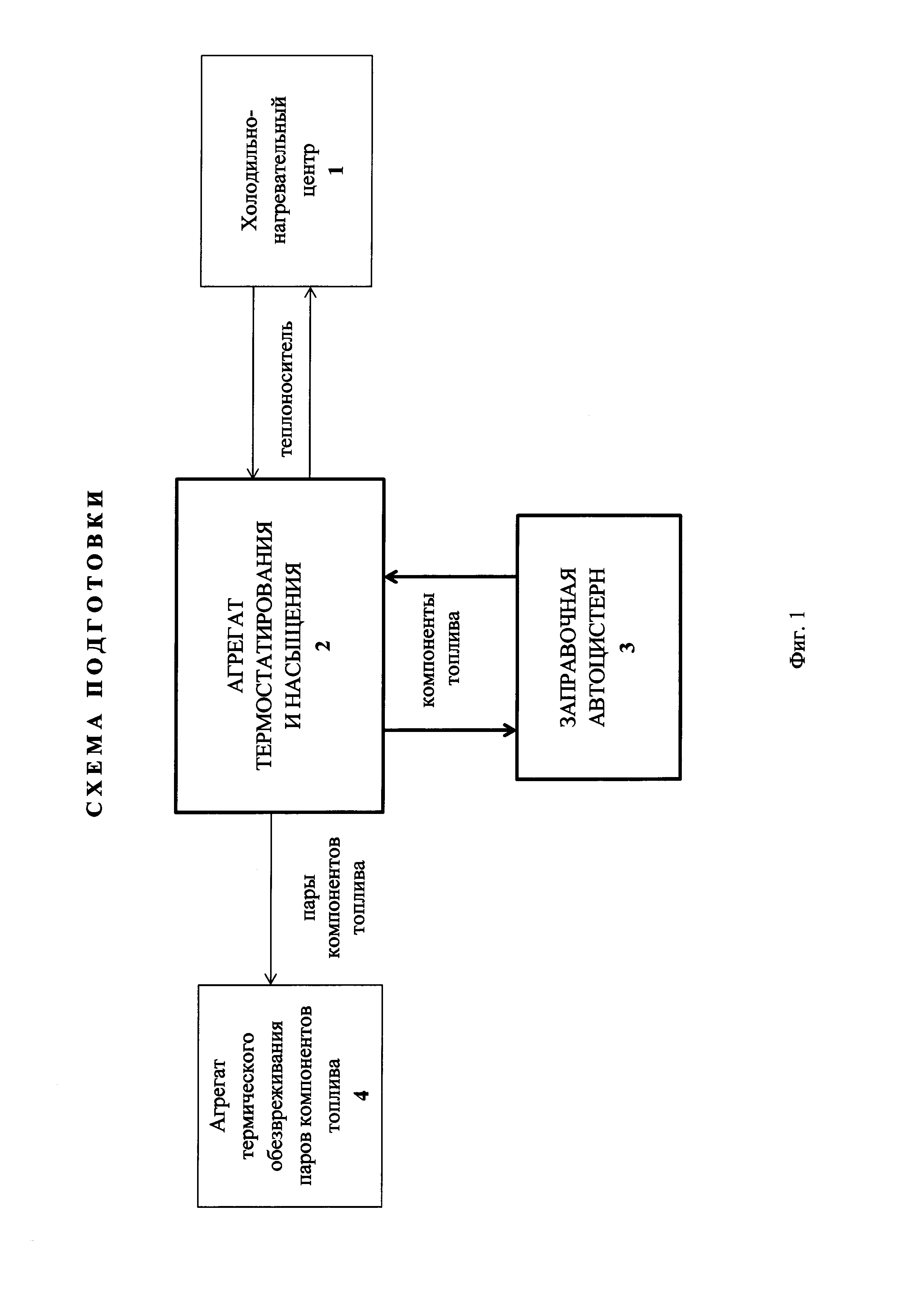 Изобретение относится к ракетной технике и может использоваться для подготовки ракетного топлива. Способ подготовки компонентов ракетного топлива для заправки двигательных установок ракетной техники включает процесс термостатирования и газонасыщения. Процесс термостатирования и газонасыщения производится в агрегате термостатирования и газонасыщения с использованием заправочной автоцистерны и вспомогательного оборудования. Процесс заключается в прокачке компонентов топлива по замкнутому контуру: заправочная автоцистерна – агрегат термостатирования и газонасыщения – заправочная автоцистерна. Заправочная автоцистерна представляет собой подвижный агрегат, обеспечивающий транспортирование и временное хранение компонентов топлива. В качестве вспомогательного оборудования используют холодильно-нагревательный центр и агрегат термического обезвреживания паров компонентов топлива. Техническим результатом изобретения является обеспечение заданных параметров температуры и газонасыщения компонентов топлива, повышение мобильности и простота эксплуатации. 2 ил., 1 табл.