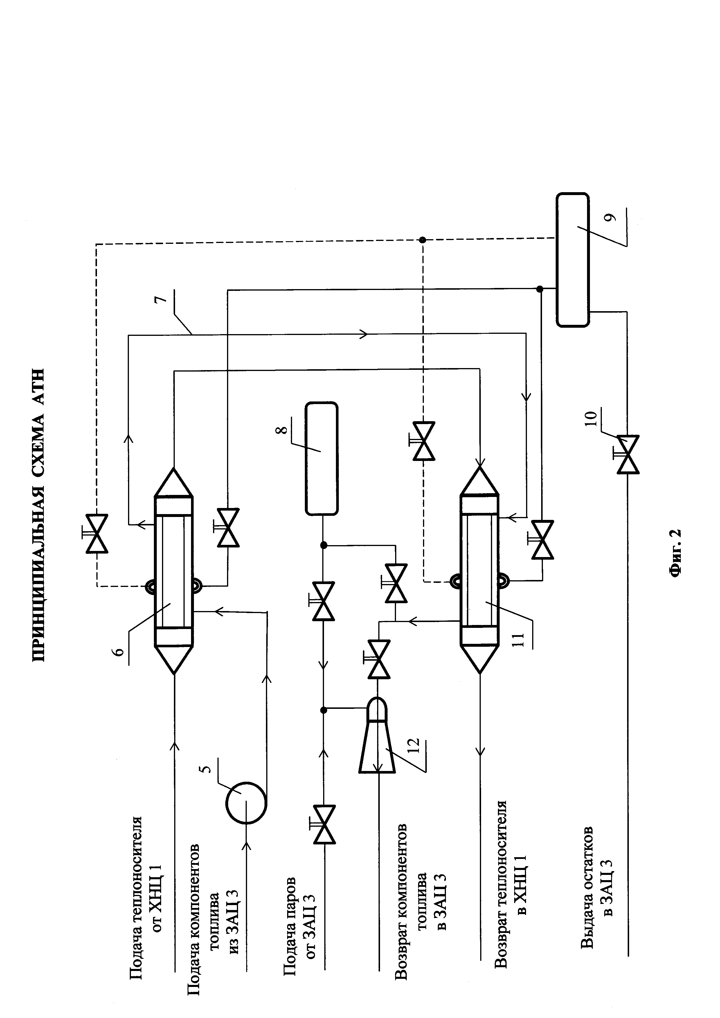 Предлагаемое изобретение относится к ракетной технике и может быть использовано при подготовке компонентов ракетного топлива, двигательные установки которой работают на высококипящих компонентах. Наиболее близким к предлагаемому изобретению является стартовый комплекс для предстартовой подготовки и пуска ракеты-носителя с космической головной частью (варианты), содержащий хранилища жидких ракетных горючих, сооружения для заправки и слива компонентов жидких ракетных горючих (патент номер RU 2318706 С1, B64G 5/00, 10.03.2008). Предлагаемый способ подготовки компонентов топлива (КТ) для заправки двигательных установок ракетной техники включает процесс термостатирования и газонасыщения компонентов топлива, при этом процесс термостатирования и газонасыщения осуществляют в агрегате термостатирования и насыщения (АТН) с использованием заправочной автоцистерны (ЗАЦ) и вспомогательного оборудования путем прокачки компонентов топлива по замкнутому контуру: заправочная автоцистерна - агрегат термостатирования и насыщения - заправочная автоцистерна. Сущность (задача) способа заключается в обеспечении заданных параметров температуры и газонасыщения компонентов топлива путем прокачки их через агрегат термостатирования и насыщения. Сущность изобретения поясняется «Схемой подготовки» (Фиг. 1) и «Принципиальной схемой АТН» (Фиг. 2). Агрегат термостатирования и насыщения представляет собой транспортируемый кузов-фургон с размещенным в нем технологическим оборудованием и органами управления. В качестве органов управления используются - щит питания, пульт управления, пневматический щит. В качестве технологического оборудования используются - сливная емкость (поз. 9), струйный насос (поз. 12), электронасосный агрегат (поз. 5), теплообменники Т1 (поз. 6) и Т2 (поз. 11). Все технологическое оборудование соединено между собой трубопроводами (поз. 7) с запорной арматурой (поз. 10). Теплоноситель от холодильно-нагревательного центра (ХНЦ) (поз. 1) подается на вход агрегата термостатирования и насыщения (АТН) (поз. 2), проходит через теплообменники Т1 и Т2 (поз. 6 и 11) и возвращается в ХНЦ (поз. 1). Компоненты топлива из заправочной автоцистерны (ЗАЦ) (поз. 3) поступают на вход АТН (поз. 2), где с помощью электронасосного агрегата (поз. 5) прокачиваются через теплообменники Т1 и Т2 (поз. 6, 11), в которых происходит либо их нагрев, либо их охлаждение. После теплообменника Т2 (поз. 11) компоненты топлива поступают в струйный насос (поз. 12), где происходит их газонасыщение одним из двух способов: - подачей азота из баллона (поз.8) в поток компонента; - эжектированием азота из азотной подушки ЗАЦ. Нагретые (охлажденные) и газонасыщенные компоненты топлива возвращаются в ЗАЦ (поз. 3). После завершения операций термостатирования и газонасыщения остатки компонентов топлива из теплообменников Т1 и Т2 (поз. 6, 11) выдавливаются азотом, поступающим из баллона (поз. 8) в сливную емкость (поз. 9), откуда поступают в ЗАЦ по отдельной магистрали трубопровода. Пары компонентов топлива из агрегата термостатирования и насыщения (поз. 2) поступают в агрегат термического обезвреживания паров компонентов топлива (поз. 4), в котором происходит их сжигание. Таким образом, мы видим, что технологическое оборудование обеспечивает термостатирование компонентов топлива, проходящего через теплообменники агрегата
