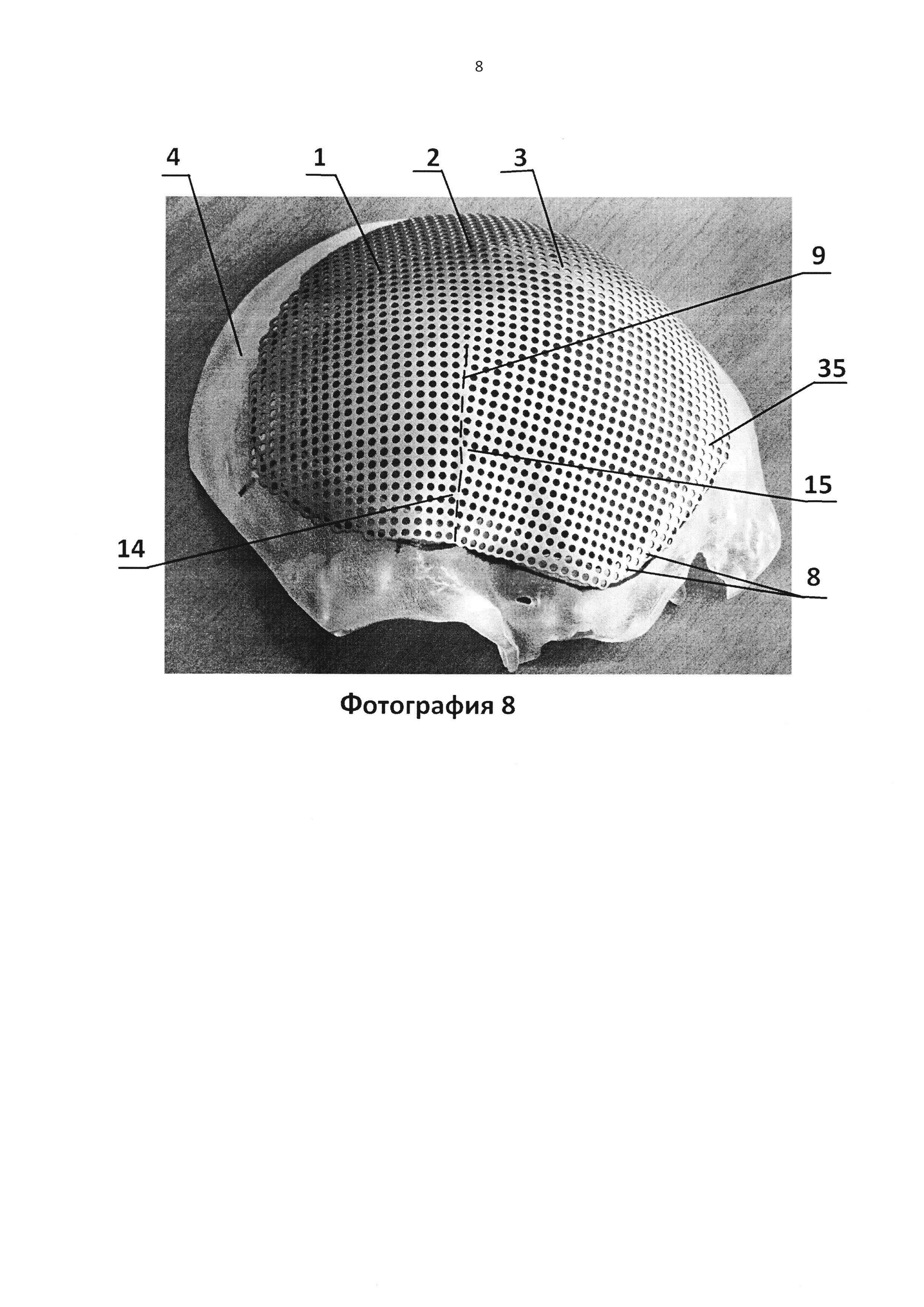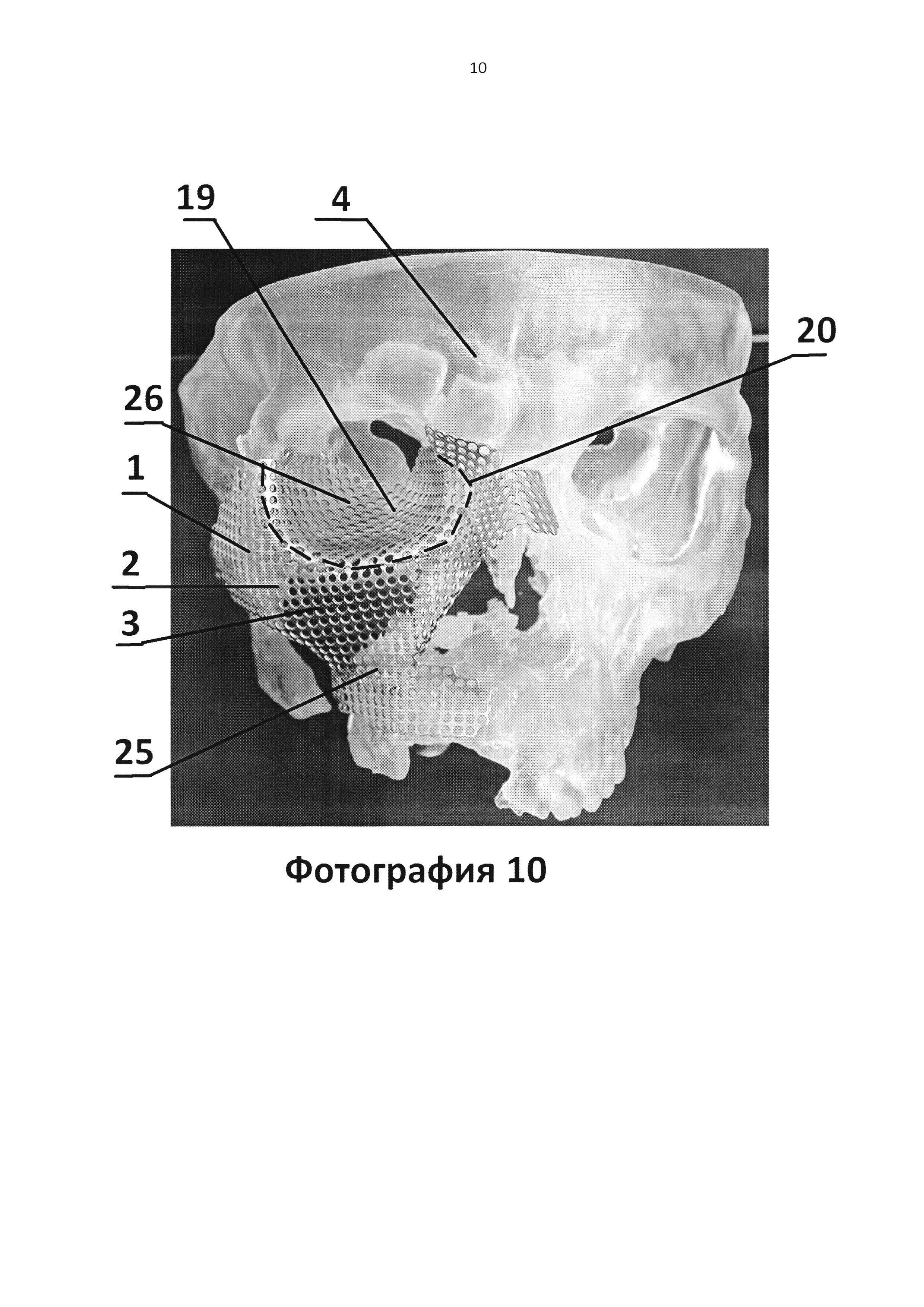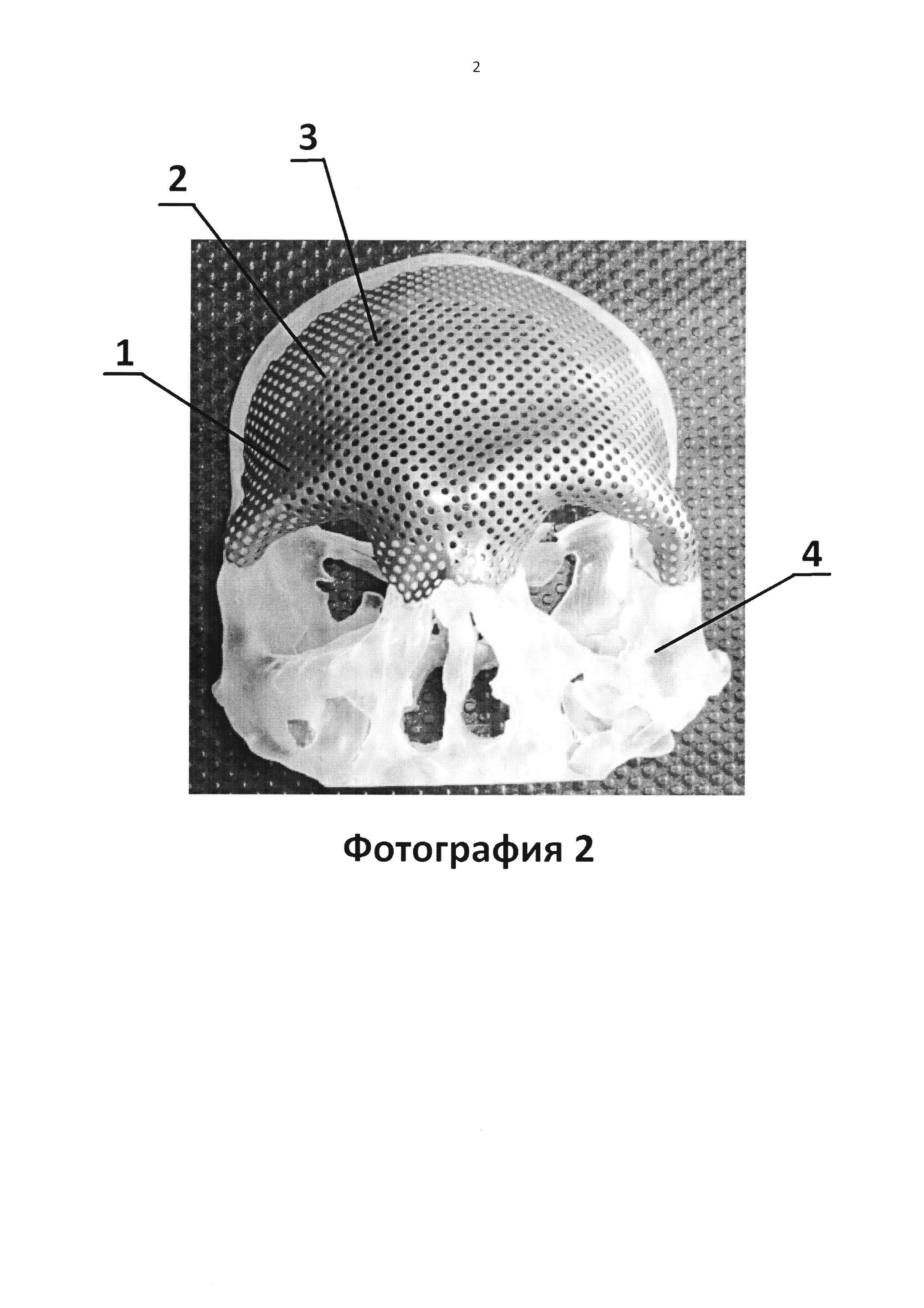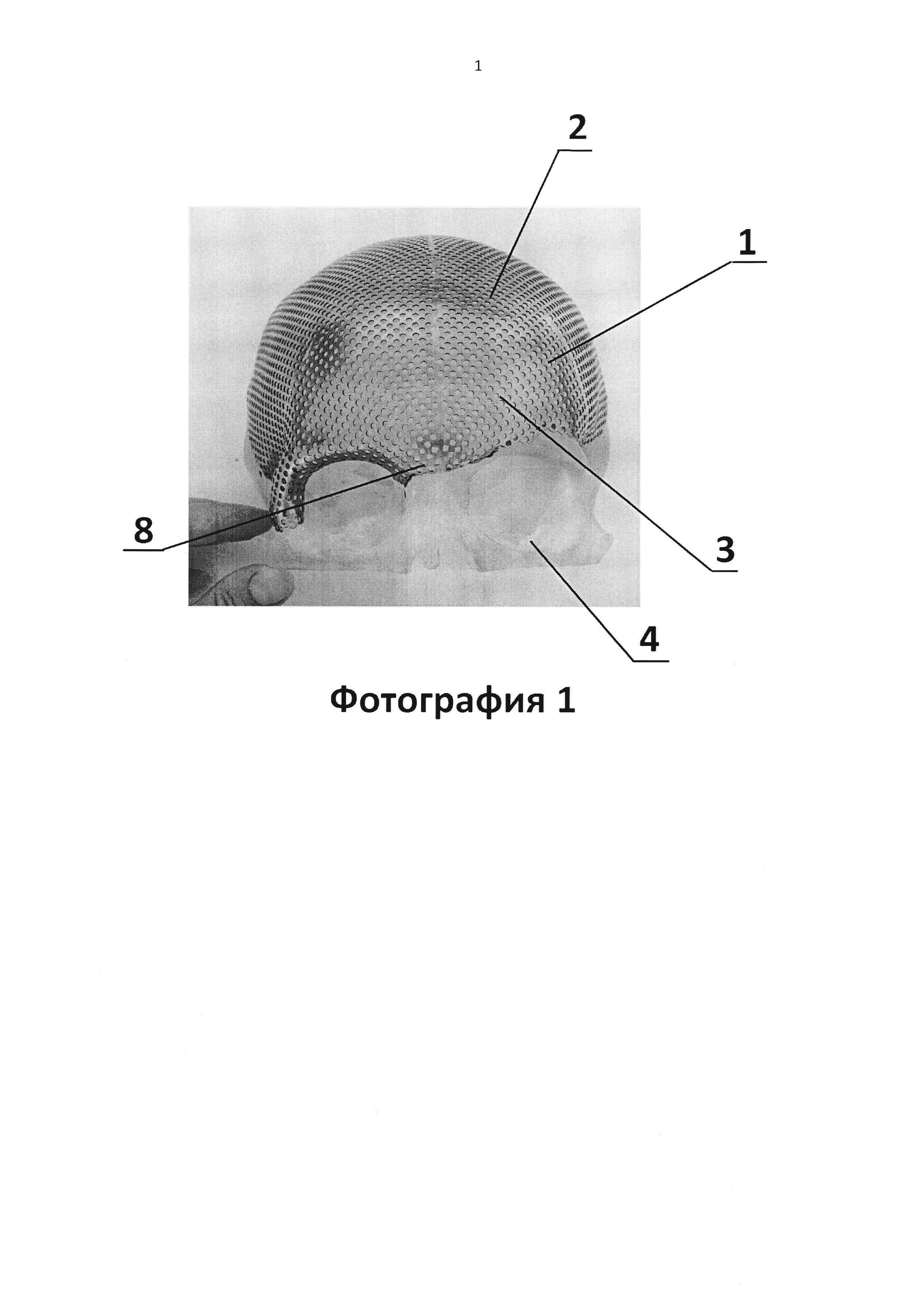 Изобретение относится к области медицины и эстетики. Оно предполагает использование изогнутой титановой пластины в качестве имплантата при проведении нейрохирургических операций и пластических операций. Изобретение предназначено для обеспечения закрытия дефекта черепа и/или лицевого черепа любого происхождения, например после трепанации черепа, его переломов, удаления части кости черепа вследствие лечения онкологических заболеваний и т.д., когда отсутствие участка костной ткани (далее - отсутствующая часть кости черепа) обусловливает необходимость восстановления целостности головы с помощью изогнутых титановых пластин (имплантатов). Известен имплантат для протезирования костей черепа, представляющий собой плоскую прямоугольную сетчатую перфорированную пластину, которую изготовители предлагают докторам самим изгибать своими инструментами вручную при проведении операции (см. Каталог фирмы KLS martin, 2011 г.). Известен способ изготовления имплантата в виде сетчатой перфорированной пластины для протезирования костей черепа путем изгиба плоской заготовки сетчатой перфорированной пластины (см. Каталог фирмы KLS martin, 2011 г.). Как отмечалось выше, данные изготовители предлагают докторам самим изгибать пластины своими инструментами вручную при проведении операции. Недостатками данных известных устройства и способа являются: - Несоответствие используемой сетчатой перфорированной пластины в форме черепа; - Недостаточная точность прилегания сетчатой перфорированной пластины к краям дефекта; - Сложность для доктора в течение проведения операции изогнуть пластину так, чтобы она стала зеркальным отражением соответствующей части другой половины черепа; - Требуется значительное время на изгиб пластины в процессе операции; - Сложно и трудоемко, а в ряде случаев невозможно изогнуть пластину сложной формы; - Если делать отверстия (перфорации) пластины сложной формы и с малыми перемычками, то облегчается ее изгиб вручную в ходе проведения операции, но снижается жесткость при эксплуатации, что повышает риск деформации и искажения формы пластины вследствие повторной травмы пациента, например в результате падения; - Если делать отверстия пластины простой формы (круглой, квадратной) и с большими перемычками и большой толщины, то усложняется ее изгиб вручную, требуется приложение повышенных усилий для ее изгибания вручную, однако пластина будет прочнее при эксплуатации; - известное техническое решение можно применять для сравнительно небольших размеров дефекта, то есть оно применимо для использования малых пластин, например, размером не более 10 см на 10 см. Эстетический результат обычно приемлем в случае расположения дефектов на темени или на затылке и не приемлем на лобной кости и височной кости из-за их сложной формы. - Если использовать известный имплантат в виде сетчатой перфорированной пластины большего размера, например заготовка с размерами более 12 см на 12 см, закрытие будет, но по эстетическим параметрам оно будет неудовлетворительно, так как мало того, что надо придать пластине нужную форму, так еще надо обеспечить плотное прилегание пластины к краям дефекта. Как следствие, происходит усложнение операции, причем, как правило, ее результаты не удовлетворяют ни доктора, ни пациента, ни по эстетике, ни по медицинским пока