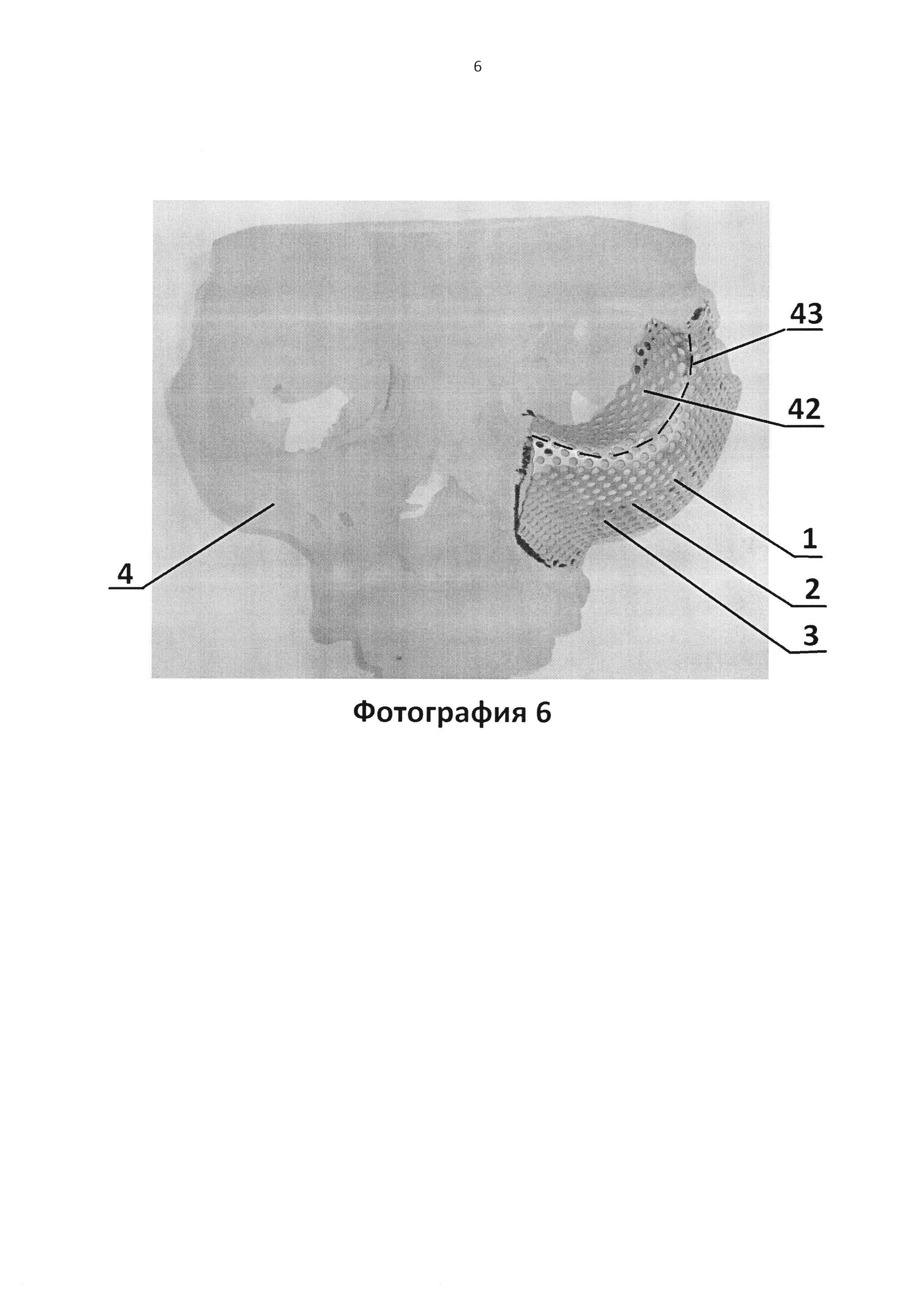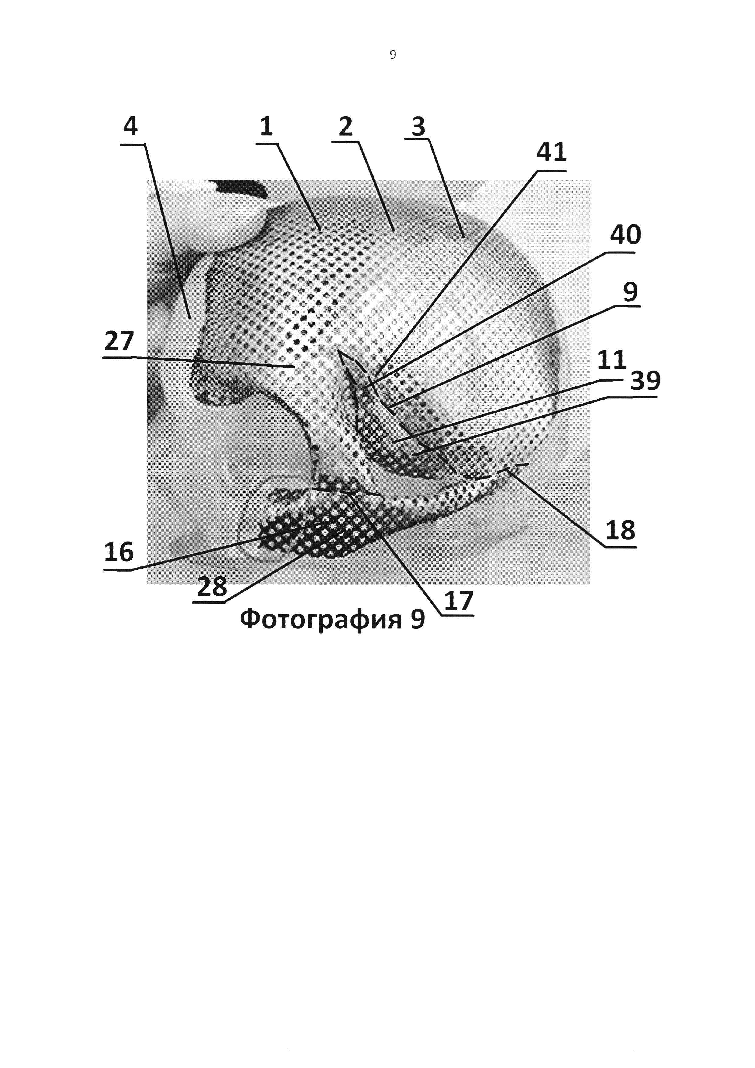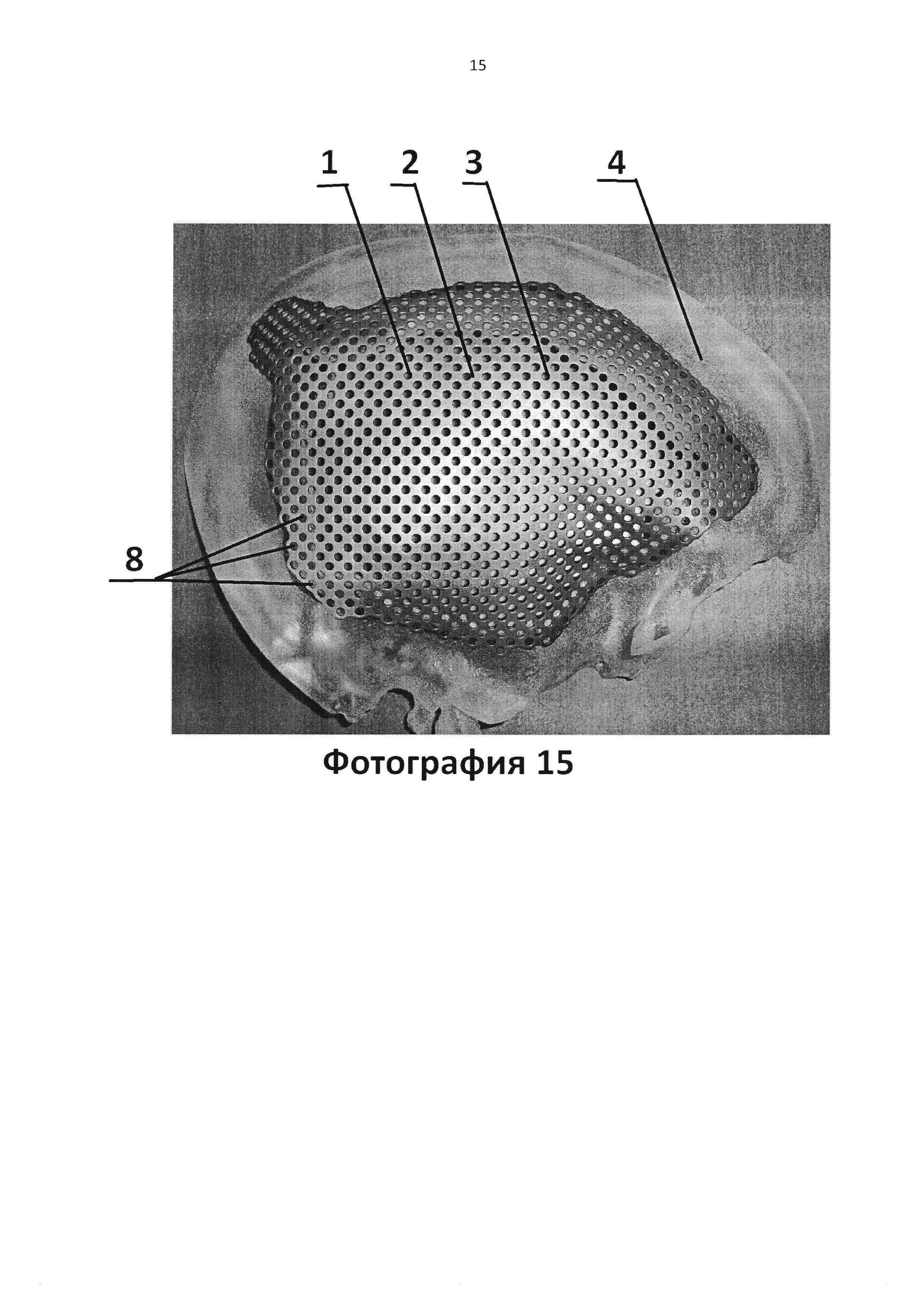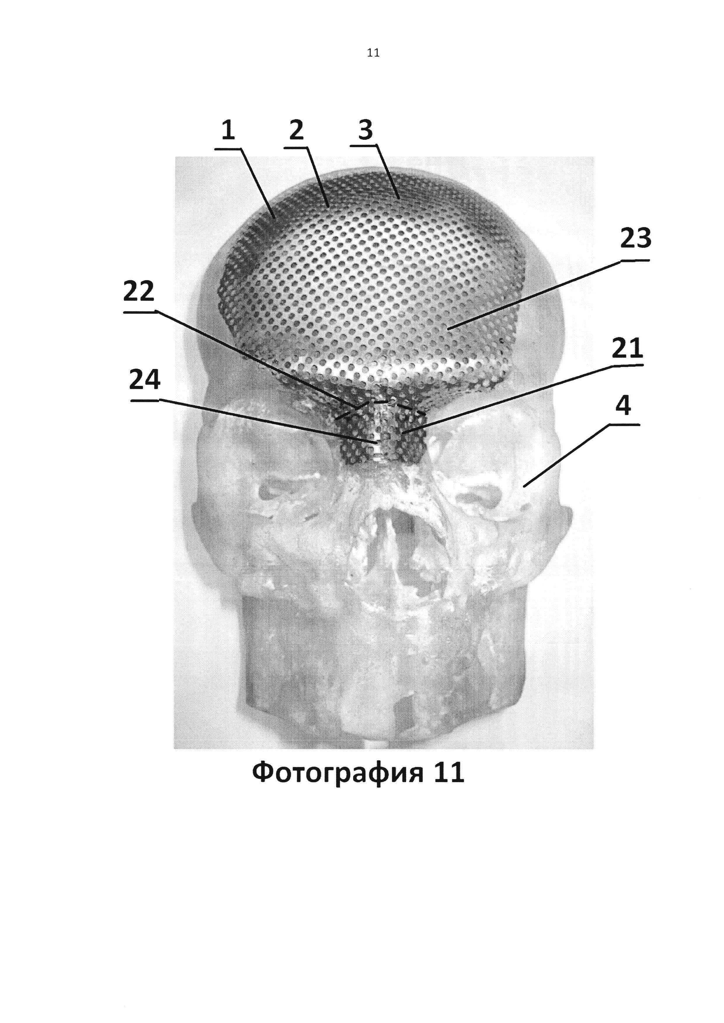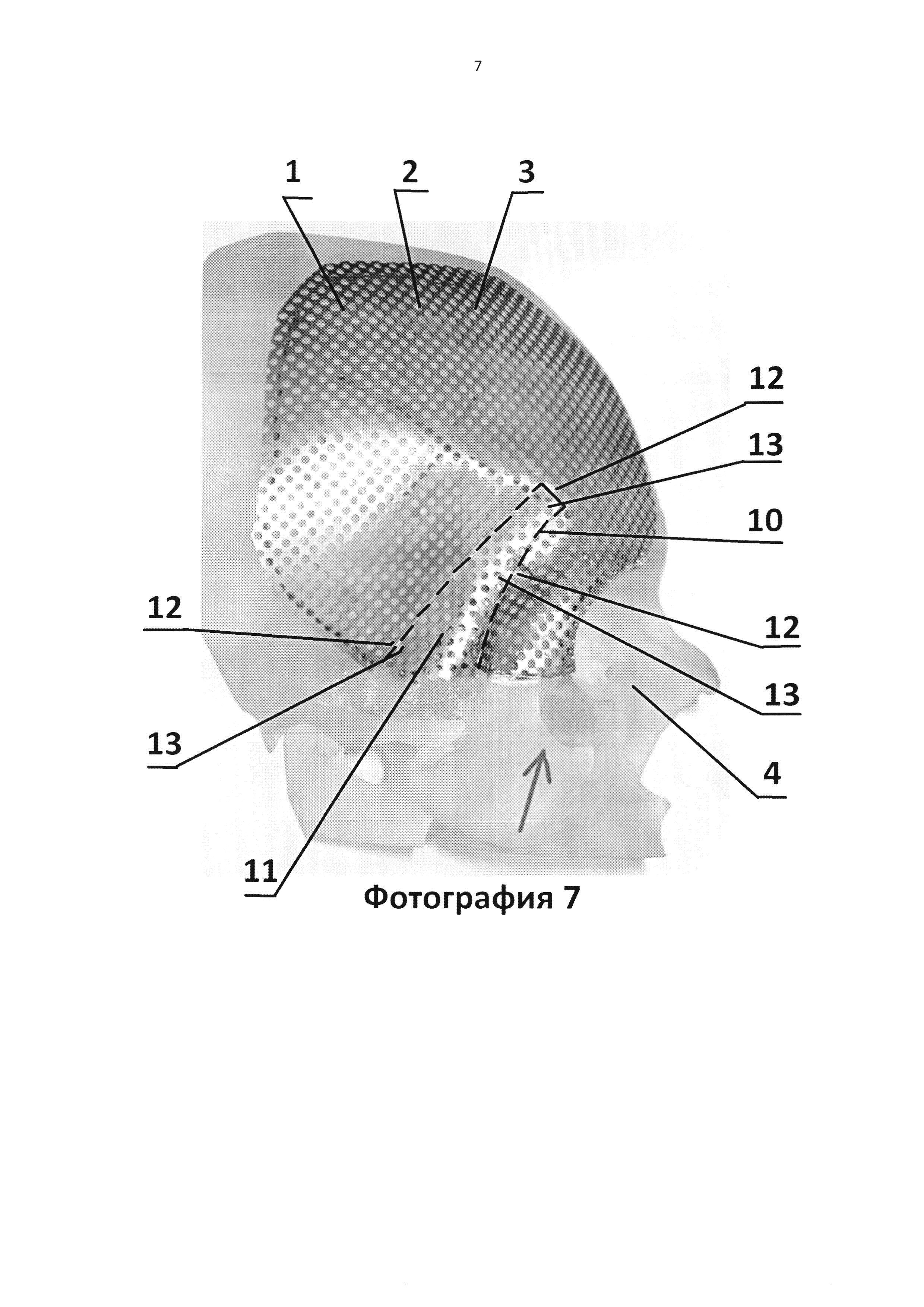 Изобретение относится к области медицины и эстетики. Оно предполагает использование изогнутой титановой пластины в качестве имплантата при проведении нейрохирургических операций и пластических операций. Изобретение предназначено для обеспечения закрытия дефекта черепа и/или лицевого черепа любого происхождения, например после трепанации черепа, его переломов, удаления части кости черепа вследствие лечения онкологических заболеваний и т.д., когда отсутствие участка костной ткани (далее - отсутствующая часть кости черепа) обусловливает необходимость восстановления целостности головы с помощью изогнутых титановых пластин (имплантатов). Известен имплантат для протезирования костей черепа, представляющий собой плоскую прямоугольную сетчатую перфорированную пластину, которую изготовители предлагают докторам самим изгибать своими инструментами вручную при проведении операции (см. Каталог фирмы KLS martin, 2011 г.). Известен способ изготовления имплантата в виде сетчатой перфорированной пластины для протезирования костей черепа путем изгиба плоской заготовки сетчатой перфорированной пластины (см. Каталог фирмы KLS martin, 2011 г.). Как отмечалось выше, данные изготовители предлагают докторам самим изгибать пластины своими инструментами вручную при проведении операции. Недостатками данных известных устройства и способа являются: - Несоответствие используемой сетчатой перфорированной пластины в форме черепа; - Недостаточная точность прилегания сетчатой перфорированной пластины к краям дефекта; - Сложность для доктора в течение проведения операции изогнуть пластину так, чтобы она стала зеркальным отражением соответствующей части другой половины черепа; - Требуется значительное время на изгиб пластины в процессе операции; - Сложно и трудоемко, а в ряде случаев невозможно изогнуть пластину сложной формы; - Если делать отверстия (перфорации) пластины сложной формы и с малыми перемычками, то облегчается ее изгиб вручную в ходе проведения операции, но снижается жесткость при эксплуатации, что повышает риск деформации и искажения формы пластины вследствие повторной травмы пациента, например в результате падения; - Если делать отверстия пластины простой формы (круглой, квадратной) и с большими перемычками и большой толщины, то усложняется ее изгиб вручную, требуется приложение повышенных усилий для ее изгибания вручную, однако пластина будет прочнее при эксплуатации; - известное техническое решение можно применять для сравнительно небольших размеров дефекта, то есть оно применимо для использования малых пластин, например, размером не более 10 см на 10 см. Эстетический результат обычно приемлем в случае расположения дефектов на темени или на затылке и не приемлем на лобной кости и височной кости из-за их сложной формы. - Если использовать известный имплантат в виде сетчатой перфорированной пластины большего размера, например заготовка с размерами более 12 см на 12 см, закрытие будет, но по эстетическим параметрам оно будет неудовлетворительно, так как мало того, что надо придать пластине нужную форму, так еще надо обеспечить плотное прилегание пластины к краям дефекта. Как следствие, происходит усложнение операции, причем, как правило, ее результаты не удовлетворяют ни доктора, ни пациента, ни по эстетике, ни по медицинским пока
