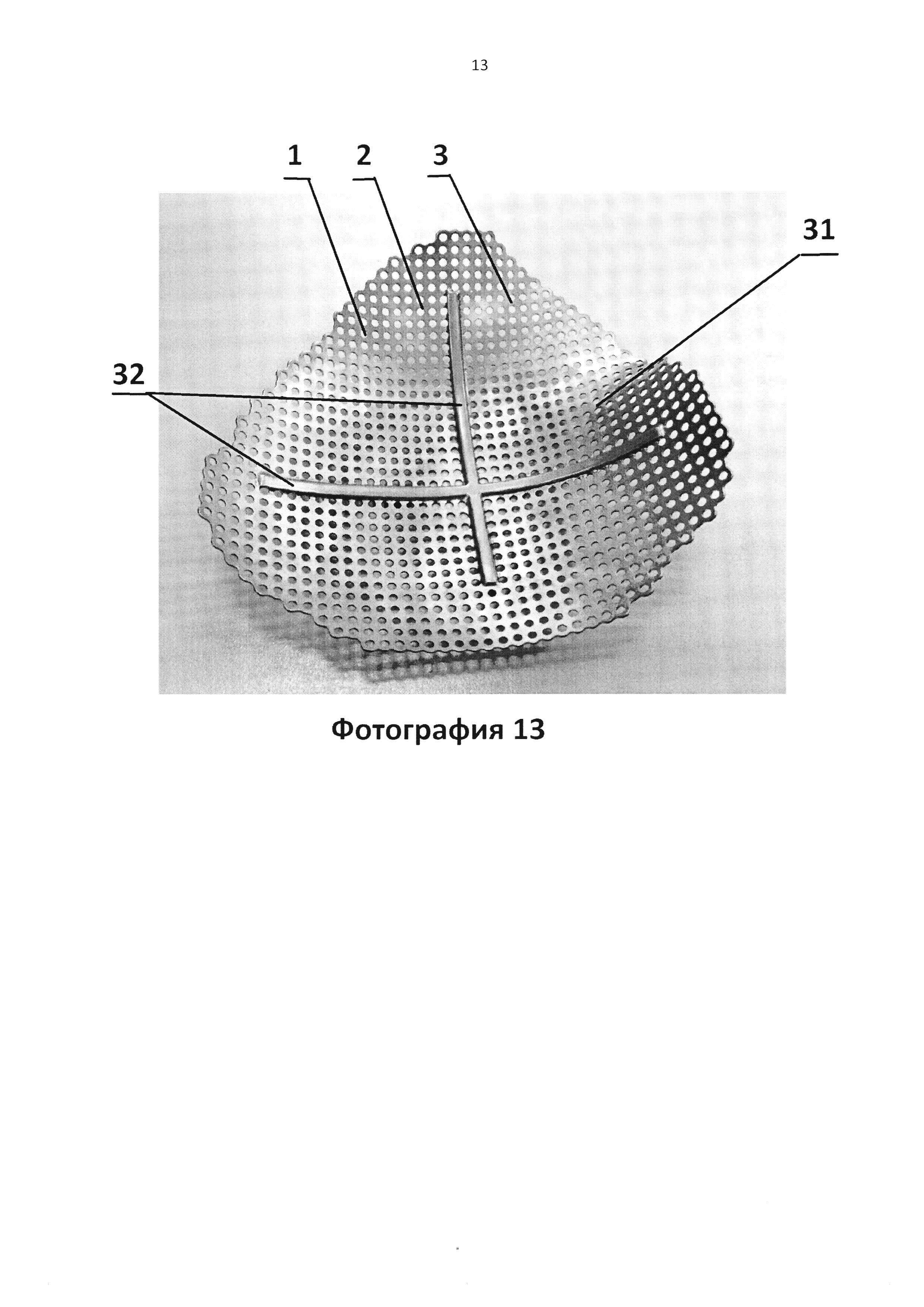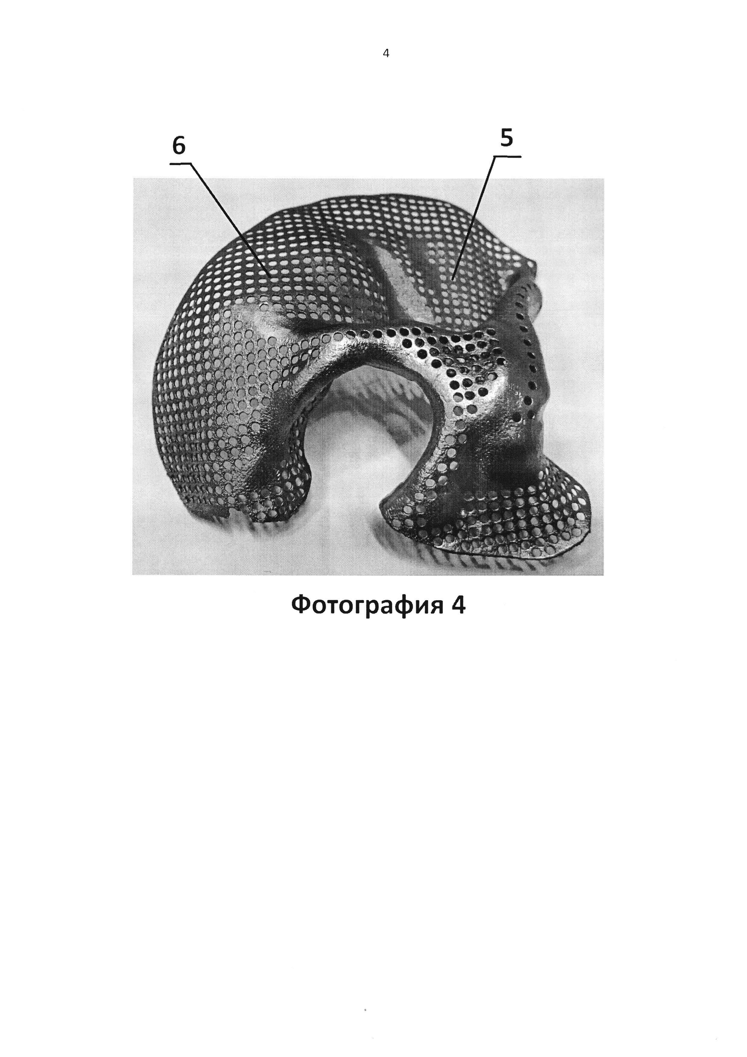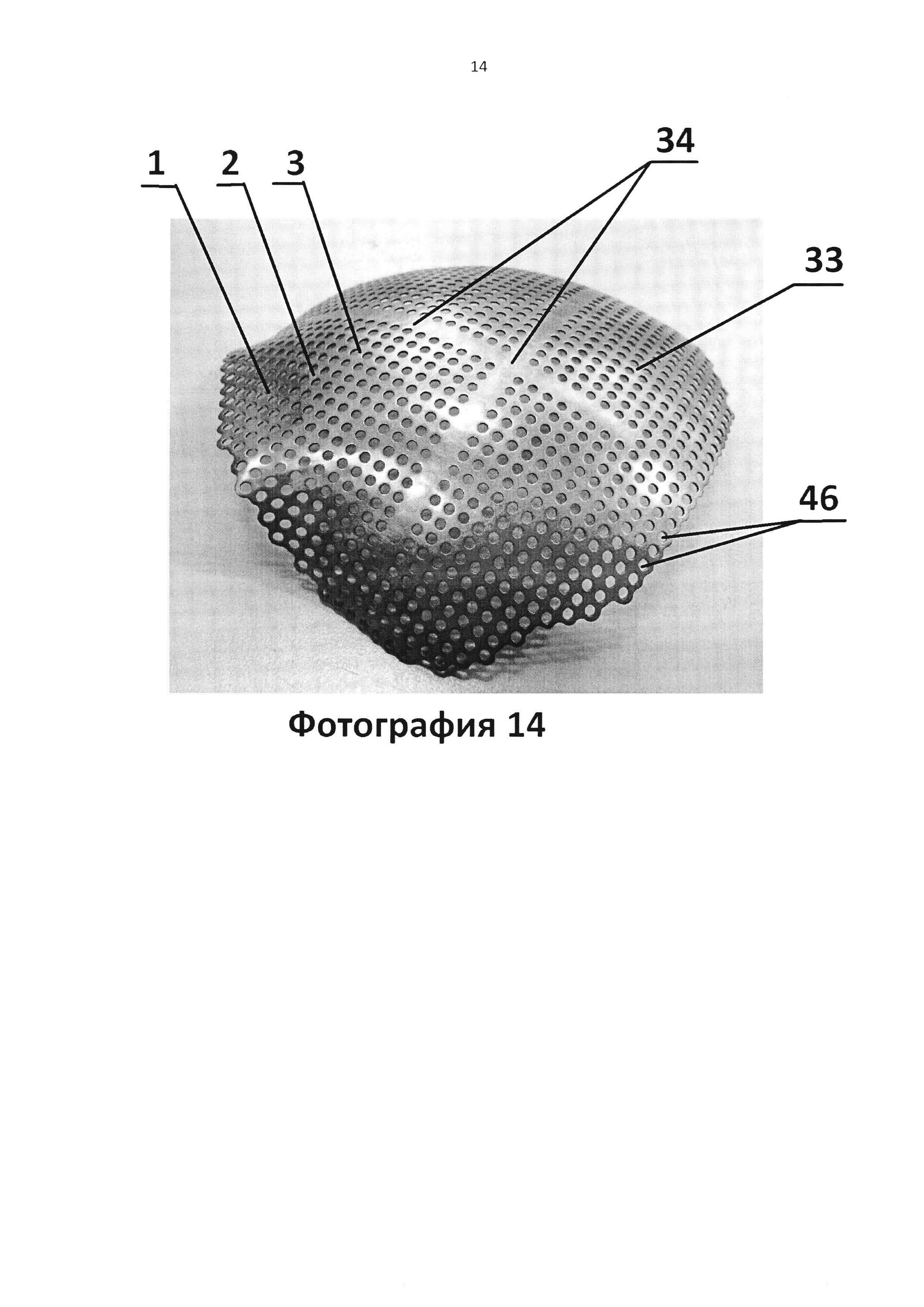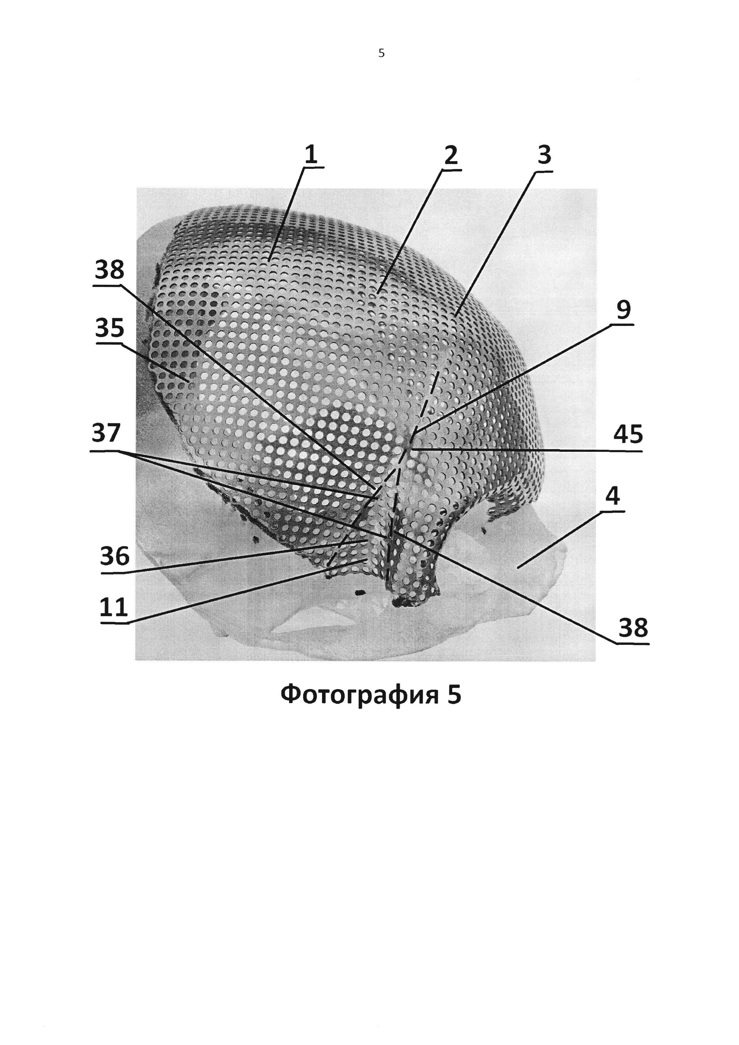 Изобретение относится к области медицины и эстетики. Оно предполагает использование изогнутой титановой пластины в качестве имплантата при проведении нейрохирургических операций и пластических операций. Изобретение предназначено для обеспечения закрытия дефекта черепа и/или лицевого черепа любого происхождения, например после трепанации черепа, его переломов, удаления части кости черепа вследствие лечения онкологических заболеваний и т.д., когда отсутствие участка костной ткани (далее - отсутствующая часть кости черепа) обусловливает необходимость восстановления целостности головы с помощью изогнутых титановых пластин (имплантатов). Известен имплантат для протезирования костей черепа, представляющий собой плоскую прямоугольную сетчатую перфорированную пластину, которую изготовители предлагают докторам самим изгибать своими инструментами вручную при проведении операции (см. Каталог фирмы KLS martin, 2011 г.). Известен способ изготовления имплантата в виде сетчатой перфорированной пластины для протезирования костей черепа путем изгиба плоской заготовки сетчатой перфорированной пластины (см. Каталог фирмы KLS martin, 2011 г.). Как отмечалось выше, данные изготовители предлагают докторам самим изгибать пластины своими инструментами вручную при проведении операции. Недостатками данных известных устройства и способа являются: - Несоответствие используемой сетчатой перфорированной пластины в форме черепа; - Недостаточная точность прилегания сетчатой перфорированной пластины к краям дефекта; - Сложность для доктора в течение проведения операции изогнуть пластину так, чтобы она стала зеркальным отражением соответствующей части другой половины черепа; - Требуется значительное время на изгиб пластины в процессе операции; - Сложно и трудоемко, а в ряде случаев невозможно изогнуть пластину сложной формы; - Если делать отверстия (перфорации) пластины сложной формы и с малыми перемычками, то облегчается ее изгиб вручную в ходе проведения операции, но снижается жесткость при эксплуатации, что повышает риск деформации и искажения формы пластины вследствие повторной травмы пациента, например в результате падения; - Если делать отверстия пластины простой формы (круглой, квадратной) и с большими перемычками и большой толщины, то усложняется ее изгиб вручную, требуется приложение повышенных усилий для ее изгибания вручную, однако пластина будет прочнее при эксплуатации; - известное техническое решение можно применять для сравнительно небольших размеров дефекта, то есть оно применимо для использования малых пластин, например, размером не более 10 см на 10 см. Эстетический результат обычно приемлем в случае расположения дефектов на темени или на затылке и не приемлем на лобной кости и височной кости из-за их сложной формы. - Если использовать известный имплантат в виде сетчатой перфорированной пластины большего размера, например заготовка с размерами более 12 см на 12 см, закрытие будет, но по эстетическим параметрам оно будет неудовлетворительно, так как мало того, что надо придать пластине нужную форму, так еще надо обеспечить плотное прилегание пластины к краям дефекта. Как следствие, происходит усложнение операции, причем, как правило, ее результаты не удовлетворяют ни доктора, ни пациента, ни по эстетике, ни по медицинским пока