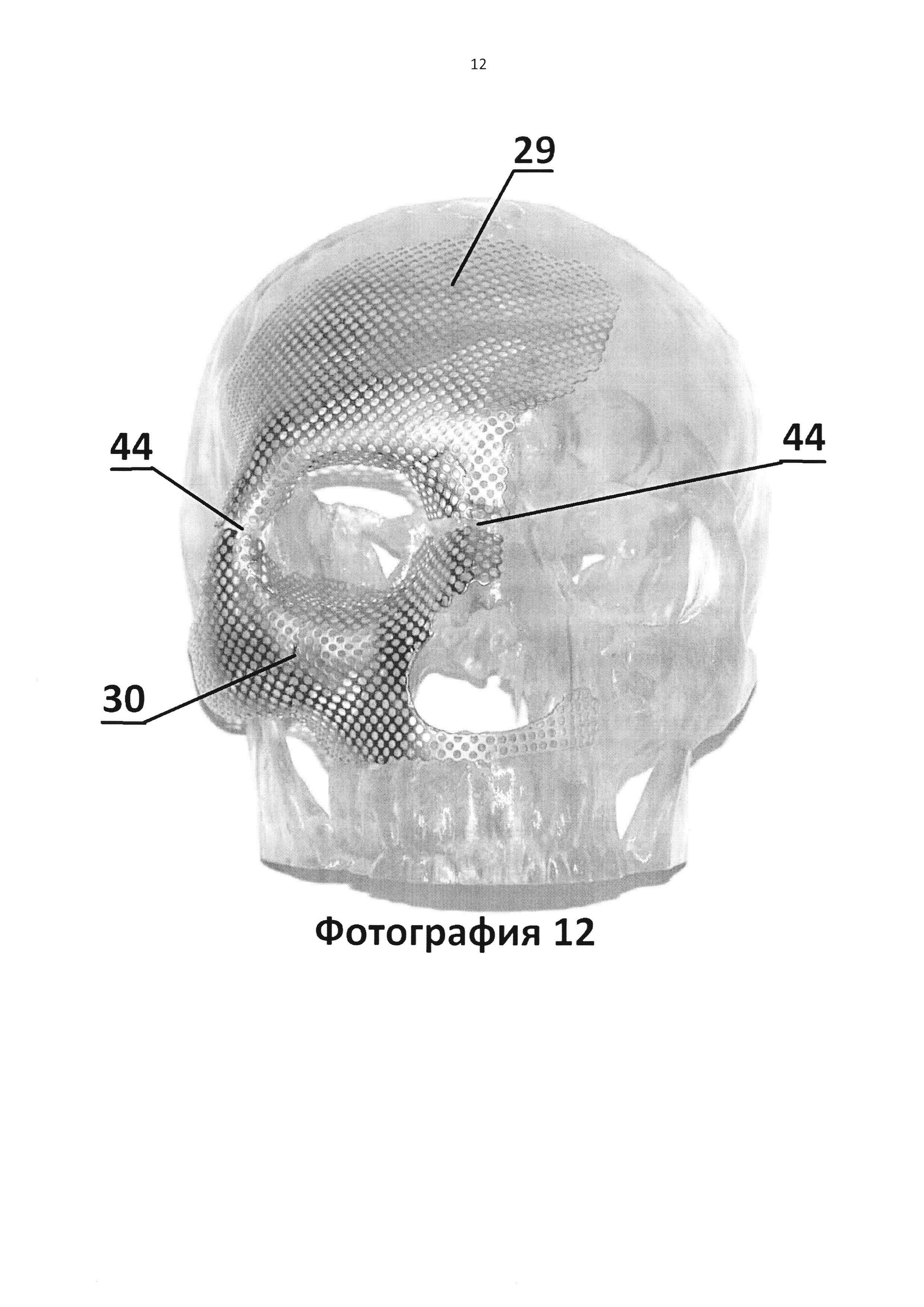 Группа изобретений относится к медицине. Способ изготовления имплантата для протезирования костей черепа, повторяющего геометрию костей черепа, подлежащих протезированию, и прилегающего к краям отсутствующей части черепа, то есть дефекта черепа, заключается в том, что включает следующие стадии: делают компьютерную томографию черепа с дефектами; со снимков, полученных с томограммы, создают объемное изображение черепа с дефектами, подлежащими редактированию, то есть цифровую трехмерную модель черепа при помощи программного обеспечения; осуществляют редактирование объемного изображения, виртуально вырезая по меньшей мере часть черепа с отсутствующей частью кости с получением цифровой трехмерной модели и ее файла; виртуально проектируют на основе томограммы отсутствующую часть кости черепа с получением ее цифровой трехмерной модели и ее файла; на основе полученных файлов цифровых трехмерных моделей на 3D-принтере изготавливают трехмерную пластиковую модель отсутствующей части кости черепа и трехмерную пластиковую модель по меньшей мере части черепа с отсутствующей частью кости черепа; изготавливают сетчатую перфорированную плоскую заготовку со сквозными отверстиями из титана или титанового сплава по размеру поверхности полученной пластиковой модели отсутствующей части кости черепа с нахлестом, отрезая, при необходимости, излишек; полученную плоскую заготовку имплантата изгибают методом пластической деформации по поверхности сборки, состоящей из пластиковой модели отсутствующей части кости черепа и из пластиковой модели по меньшей мере части черепа с отсутствующей частью кости черепа, формируя перед проведением операции изогнутую сетчатую перфорированную пластину со сквозными отверстиями в виде изогнутого тела. Имплантат для протезирования костей черепа, полученный вышеуказанным способом, представляет собой изогнутое тело, выполненное в виде сетчатой перфорированной пластины из титана или титанового сплава со сквозными отверстиями, являющимися крепежными элементами, повторяющей геометрию костей черепа, подлежащих протезированию, и точно прилегающей к краям дефекта черепа - отсутствующей части черепа, имеющей перемычки между отверстиями сетчатой пластины и в которой по меньшей мере один крайний ряд отверстий откалиброван по наружному периметру, при этом изогнутая сетчатая пластина со сквозными отверстиями прикреплена к костям черепа при помощи крепежных средств через сквозные отверстия сетчатой пластины, зеркально замещающей любые кости головного и лицевого черепа. Изобретения обеспечивают повышение точности прилегания имплантата к краям части черепа вокруг отсутствующей части черепа (иначе говоря, дефекта) и исключение необходимости изгиба пластины во время операции и ее подгонки под размер дефекта, что резко снижает трудоемкость операции в целом. 2 н. и 22 з.п. ф-лы, 15 ил.