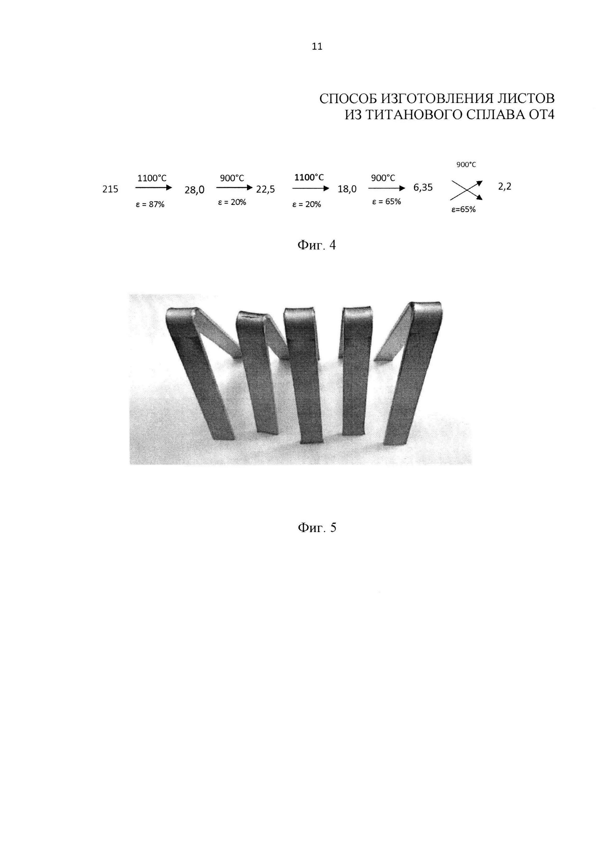 Изобретение относится к области металлургии, а именно к изготовлению листов из титанового сплава ОТ4, и может быть использовано для получения изделий сложной конфигурации глубокой вытяжкой и штамповкой. Способ изготовления листов из титанового сплава ОТ4 включает деформацию слитка в сляб, механическую обработку сляба, многоэтапную прокатку сляба на подкат, резку подката на листовые заготовки, их сборку в пакет, прокатку листовых заготовок в листы в составе пакета и адъюстажные операции листов после пакетной прокатки. Слиток деформируют в сляб в два этапа, при этом на первом этапе в β-области в интервале температур выше температуры полиморфного превращения (ТПП) на 150-250°C с суммарной степенью деформации 30-80%, а на втором этапе в (α+β)-области в интервале температур ниже ТПП на 30-50°C с суммарной степенью деформации 20-50%, многоэтапную прокатку сляба на подкат осуществляют последовательно в четыре этапа, при этом на первом этапе в β-области в интервале температур выше ТПП на 90-160°C с суммарной степенью деформации 30-90%, на втором этапе в (α+β)-области в интервале температур ниже ТПП на 30-70°C с суммарной степенью деформации 15-40%, на третьем этапе в β-области в интервале температур выше ТПП на 90-160°C с суммарной степенью деформации 15-25% и на четвертом этапе в (α+β)-области в интервале температур ниже ТПП на 30-70°C с суммарной степенью деформации 40-70%, разрезают подкат на листовые заготовки, собирают их в пакет, укладывают с обеспечением перпендикулярности предыдущей прокатки листовой заготовки к направлению последующей прокатки листовой заготовки и прокатывают пакет на готовый размер в интервале температур ниже ТПП на 30-70°C с суммарной степенью деформации 40-70%. Полученные листы имеют высокие значения пластичности, низкую анизотропию механических свойств. 5 ил., 3 табл.