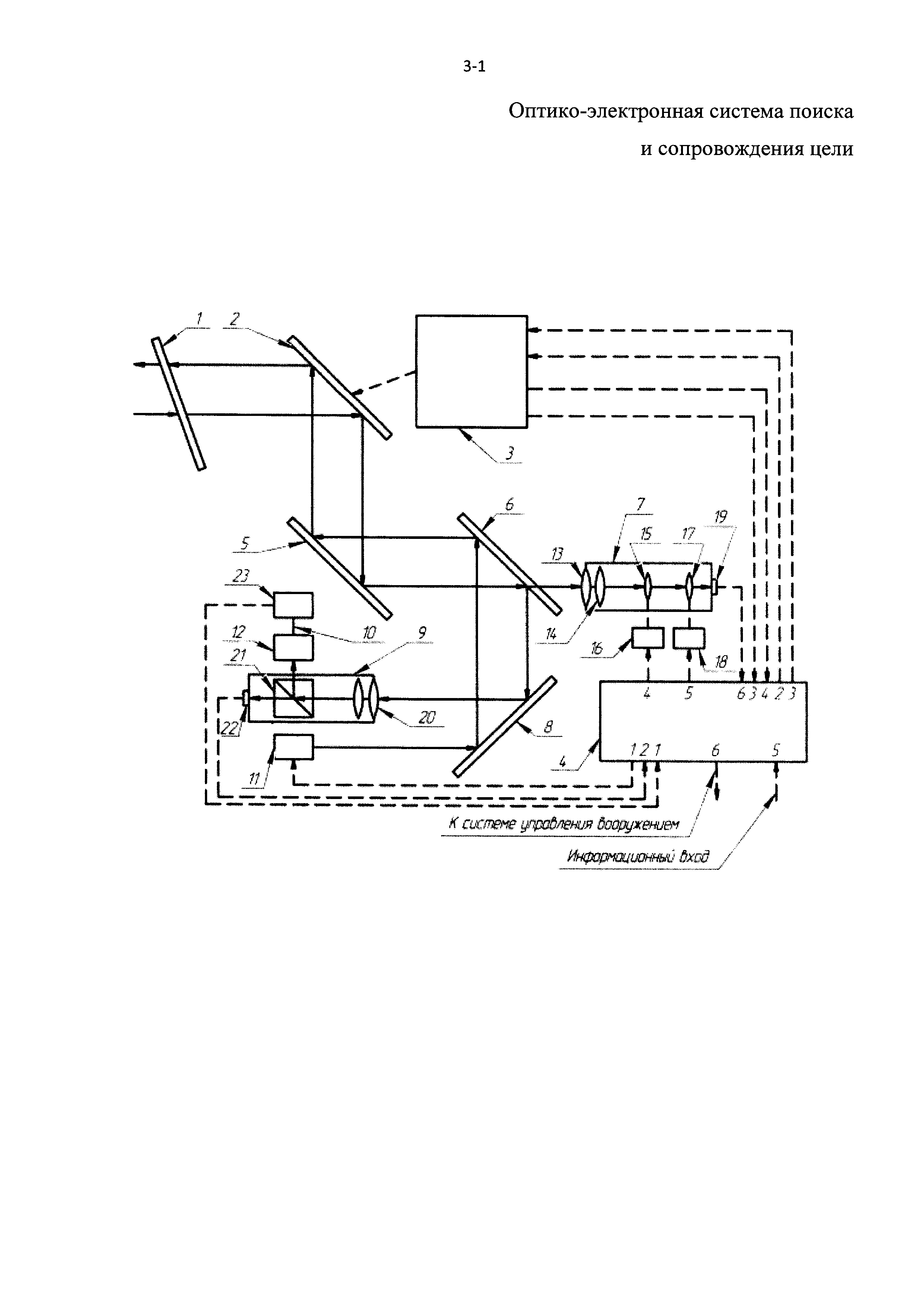 Оптико-электронная система поиска и сопровождения цели, содержащая подвижное зеркало, выполненное с возможностью перемещения по двум взаимно перпендикулярным осям с помощью устройства управления поворотным зеркалом, спектроделитель, расположенный за подвижным зеркалом, ИК канал, формирующий сигнал рассогласования между оптической осью ИК канала и направлением на цель, расположенный в проходящих лучах спектроделителя и состоящий по ходу луча из ИК объектива с коррегирующими линзами и ИК приемника излучения, а лазерные передающий и приемный каналы расположены в отраженных лучах спектроделителя, причем выход лазерного приемного канала связан с блоком обработки сигнала дальнометрирования, который в свою очередь связан с соответствующим входом блока управления, выход ИК приемника излучения и выходы устройства управления поворотным зеркалом подключены к блоку управления, соответствующие выходы которого подключены к устройству управления поворотным зеркалом и к входу лазерного передающего канала, отличающаяся тем, что устройство управления подвижным зеркалом выполнено в виде гиростабилизатора, блок управления выполнен в виде электронного блока связи, преобразования и управления, в ИК канале ИК приемник излучения построен на основе матричного фотоприемника, ИК объектив выполнен из блока линз с высокой степенью разрешения, в котором коррегирующие линзы выполнены в виде фокусирующей и рассеивающей линз, расположенные по ходу луча за блоком линз и выполненные со своими приводами, при этом входы приводов подключены к соответствующим входам электронного блока связи, преобразования и управления, а выход лазерного передающего канала напрямую связан со спектроделителем, кроме того, в систему добавлен телевизионный канал, формирующий сигнал рассогласования между оптической осью телевизионного канала и направлением на цель, расположенный в отраженных лучах спектроделителя и выполненный по ходу луча в виде высокоразрешающего телевизионного объектива, светоделительной призмы и фотоприемного устройства, выполненного в виде матричного фотоприемника, расположенного в проходящих лучах светоделительной призмы, а в отраженных лучах светоделительной призмы расположен лазерный приемный канал, причем телевизионный объектив выполнен общим как для телевизионного канала, так и для лазерного приемного канала, кроме того, выход телевизионного матричного фотоприемника телевизионного канала подключен к соответствующему входу электронного блока связи, преобразования и управления, а сам электронный блок связи, преобразования и управления выполнен с информационным входом и выходом к системе управления вооружением.