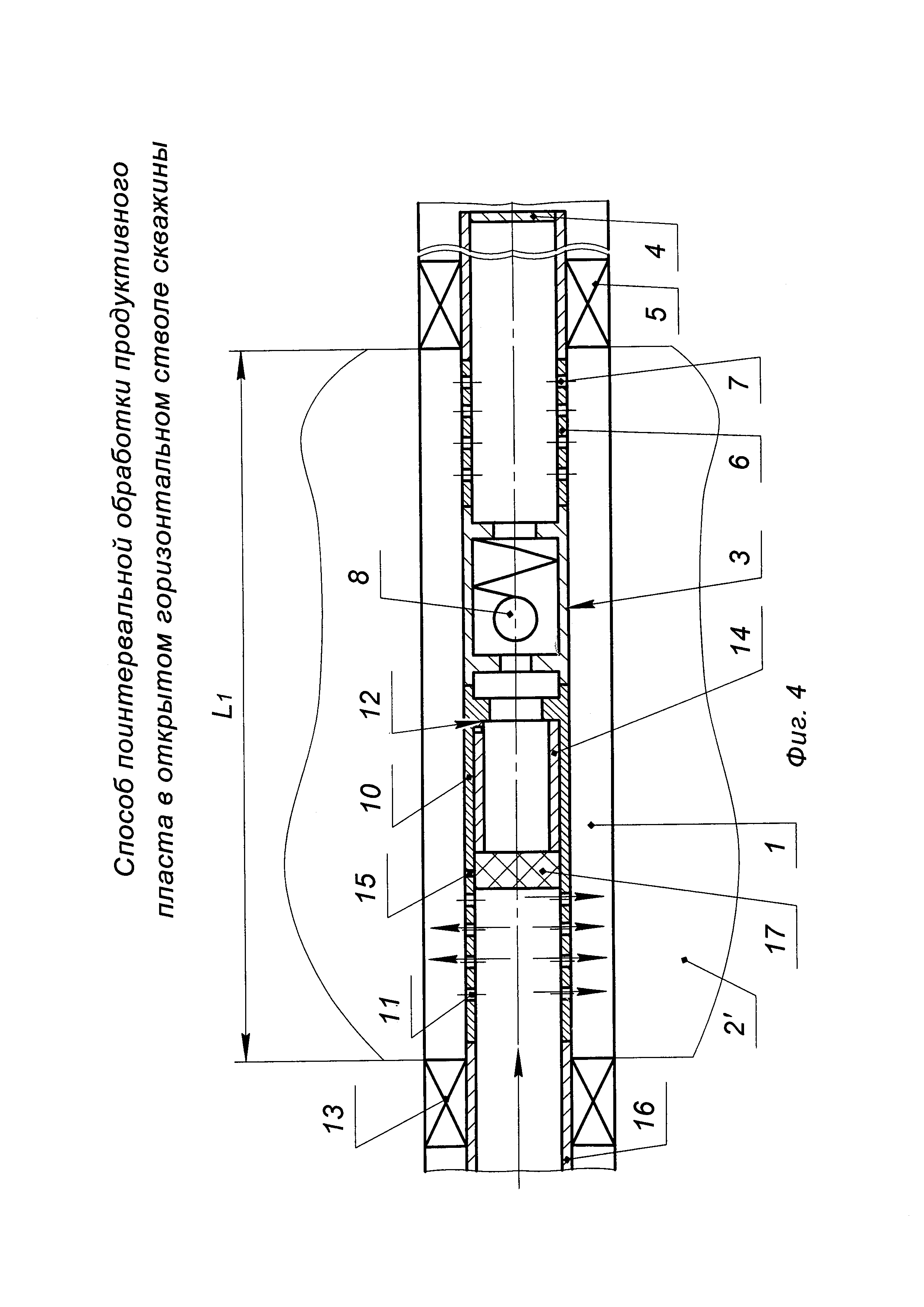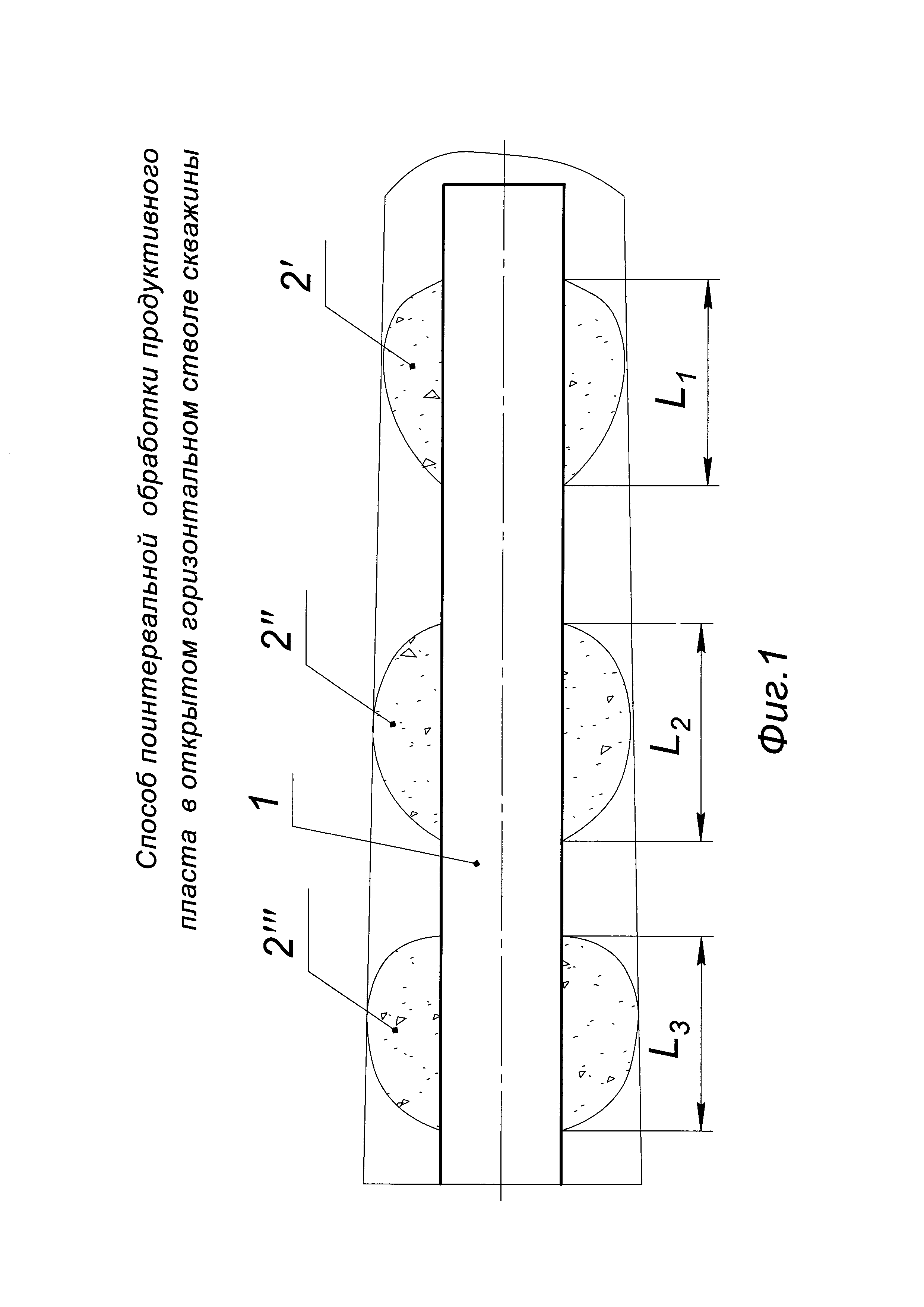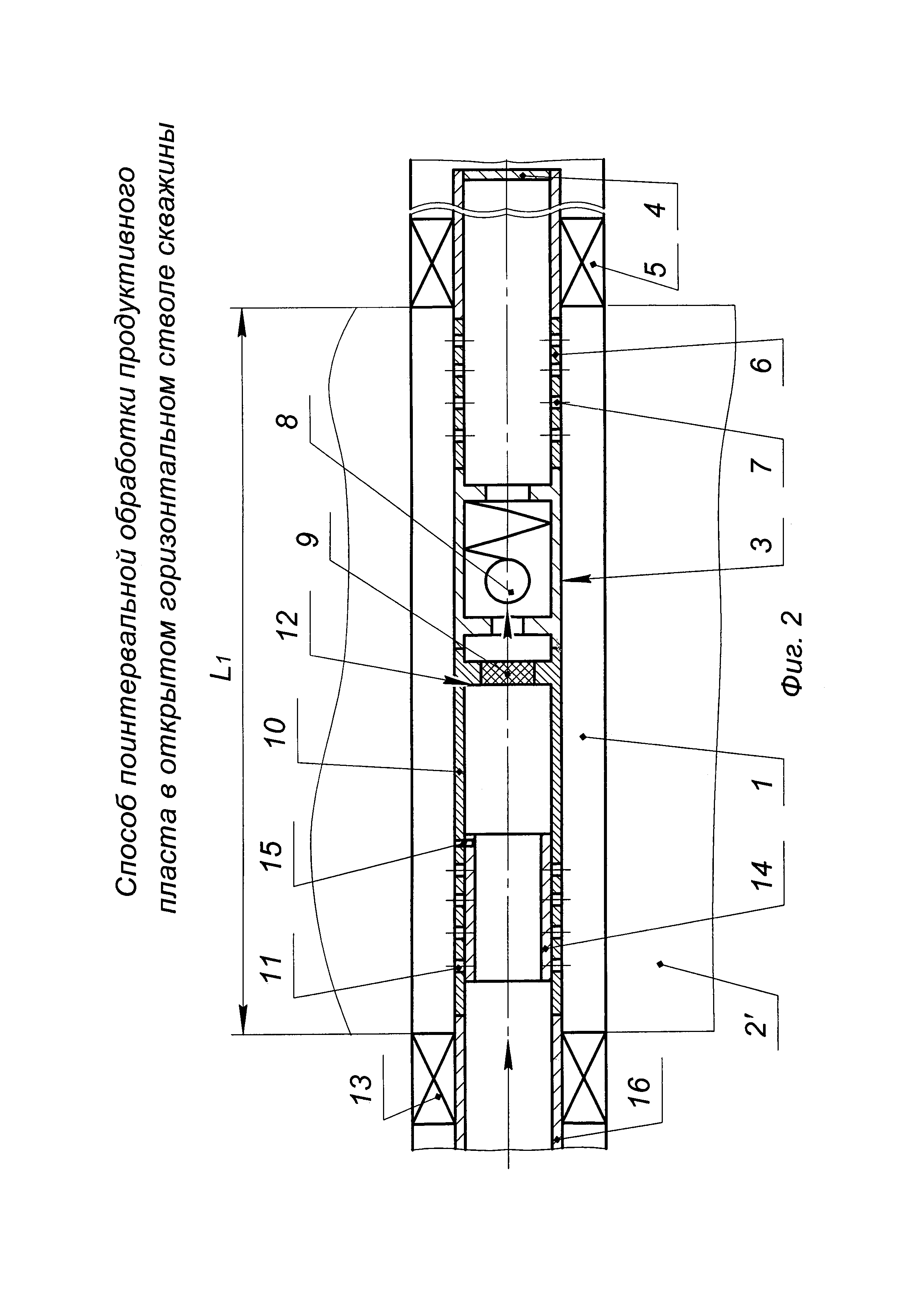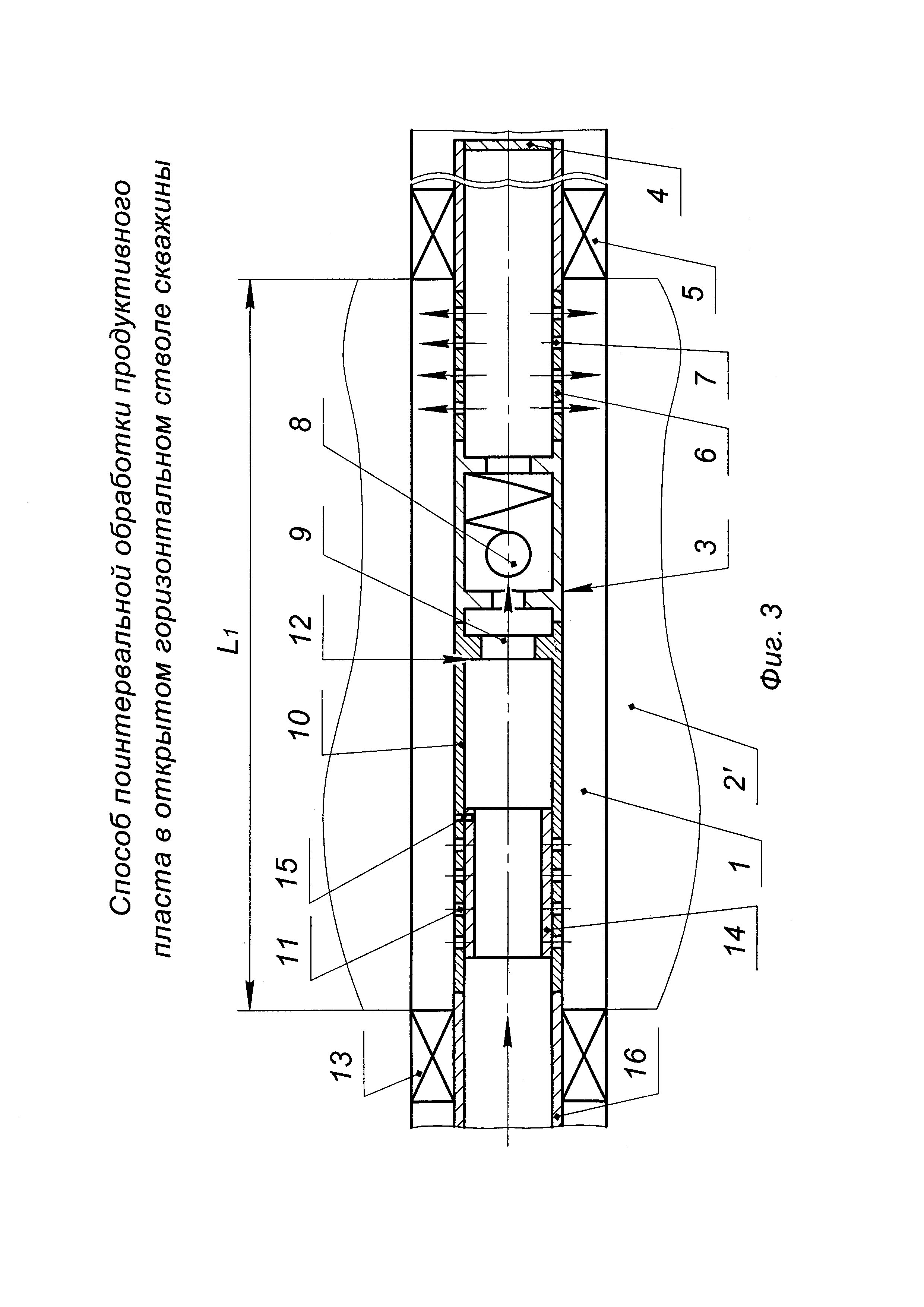 Изобретение относится к нефтедобывающей промышленности и предназначено для проведения поинтервальных обработок в карбонатных коллекторах с целью повышения продуктивности призабойной зоны открытого горизонтального ствола скважины. Известен способ поинтервальной обработки призабойной зоны горизонтальной скважины (патент RU №2278966, МПК Е21В 43/27, опубл. 27.06.2006 г., бюл. №18), включающий поинтервальную закачку в призабойную зону раствора кислоты. При этом очередность обработки устанавливают от дальнего интервала к интервалу, ближайшему к вертикальному стволу скважины. Закачку ведут через колонну насосно-компрессорных труб (НКТ), при обработке очередного интервала перемещают конец колонны НКТ к обрабатываемому интервалу. После закачки раствора кислоты в каждый обрабатываемый интервал закачивают водный раствор эмульгатора. Закачку растворов кислоты и эмульгатора проводят с расходом 24-35 м3/сут и при давлении на устье на колонне НКТ 0,8-1,5 МПа. После чего проводят технологическую выдержку не более 3 ч и выполняют свабирование до депрессии на забое скважины не ниже 3 МПа. Недостатками данного способа являются: - во-первых, малая эффективность кислотной обработки с последующей закачкой эмульгатора в неоднородный по проницаемости коллектор, вскрытый горизонтальным стволом скважины, так как не учитывается проницаемость коллектора пласта и не выделяются интервалы с пониженной проницаемостью проведением геофизических исследований; - во-вторых, низкое качество обработки горизонтального ствола скважины вследствие отсутствия герметичного отсечения обрабатываемых интервалов, поэтому обработка скважины происходит только в приствольной зоне пласта, вскрытого горизонтальной скважиной без проникновения вглубь пласта; - в-третьих, большие затраты на химические реагенты (кислоту и эмульгаторы) и нерациональное их использование. Наиболее близким по технической сущности является способ поинтервальной обработки продуктивного пласта через открытый горизонтальный ствол скважины (патент RU №2247832, МПК Е21В 43/27, опубл. 10.03.2005 г., бюл. №7), включающий спуск в скважину колонны труб с пакерами и клапаном на конце колонны, закачку кислоты по колонне труб, перекрытие пакерами интервала обработки пласта и задавку в него под давлением кислоты. По всей длине прохождения открытого горизонтального ствола через продуктивный пласт путем проведения геофизических исследований определяют пористость, проницаемость и нефтенасыщенность приствольной зоны, по которым устанавливают интервалы с пониженной проницаемостью, оценивают степень кавернозности на их концах и диаметр ствола. В нижнюю часть колонны труб перед спуском ее в скважину вводят трубную компоновку с управляемыми через колонну труб гидравлическими пакерами на обоих концах компоновки и с радиальным сквозным калиброванным каналом в трубе компоновки, а в качестве клапана на конце трубной компоновки устанавливают кольцевое седло под запорный шар. Спускают колонну труб с трубной компоновкой в горизонтальный ствол скважины до забоя, при незапакерованных пакерах производят промывку горизонтального ствола скважины. Вслед за этим через колонну труб в скважину закачивают кислоту в объеме, равном объему первого интервала обработки. После чего в колонну труб сбрасывают запорный шар, запакеро