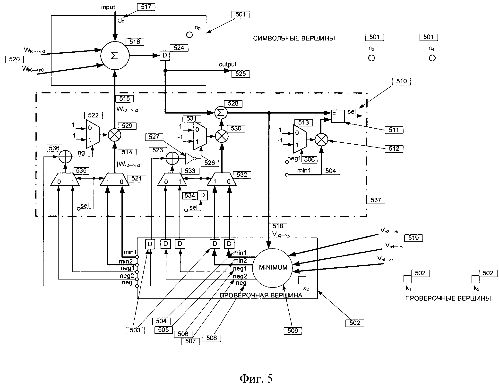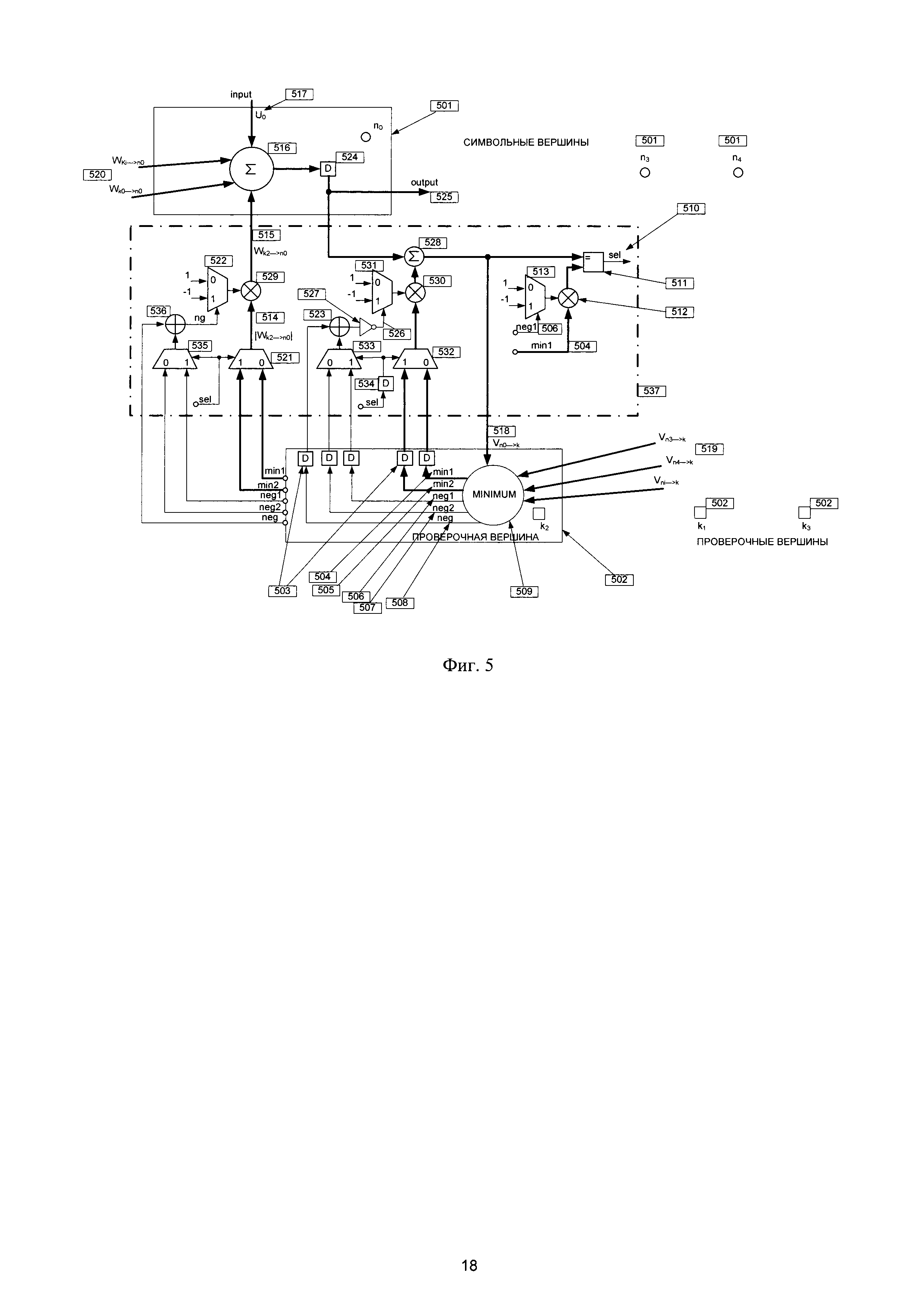(520) от каждой проверочной вершины (502) согласно графу Таннера посылают на входы общего сумматора (516) символьной вершины (501), так что на его выходе формируют значение согласно (4):