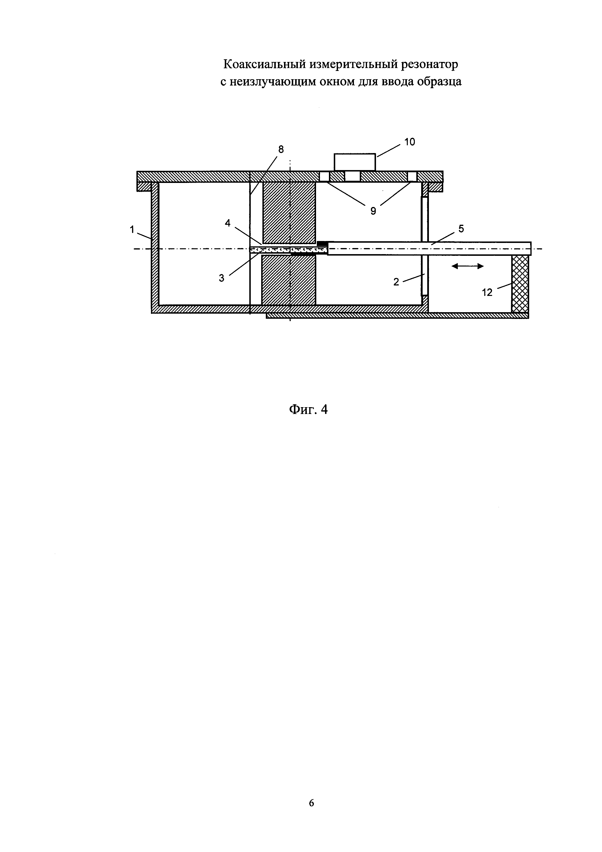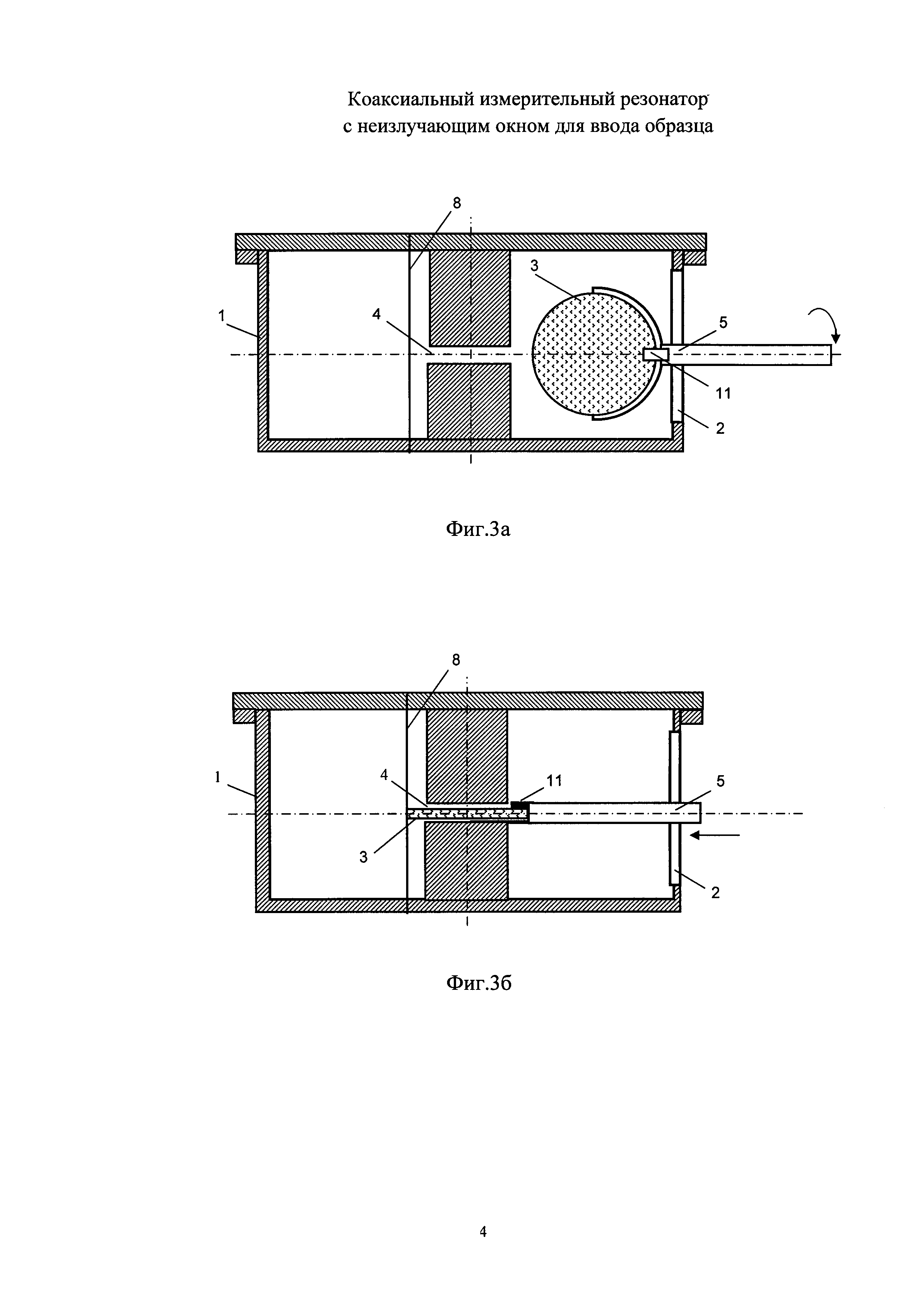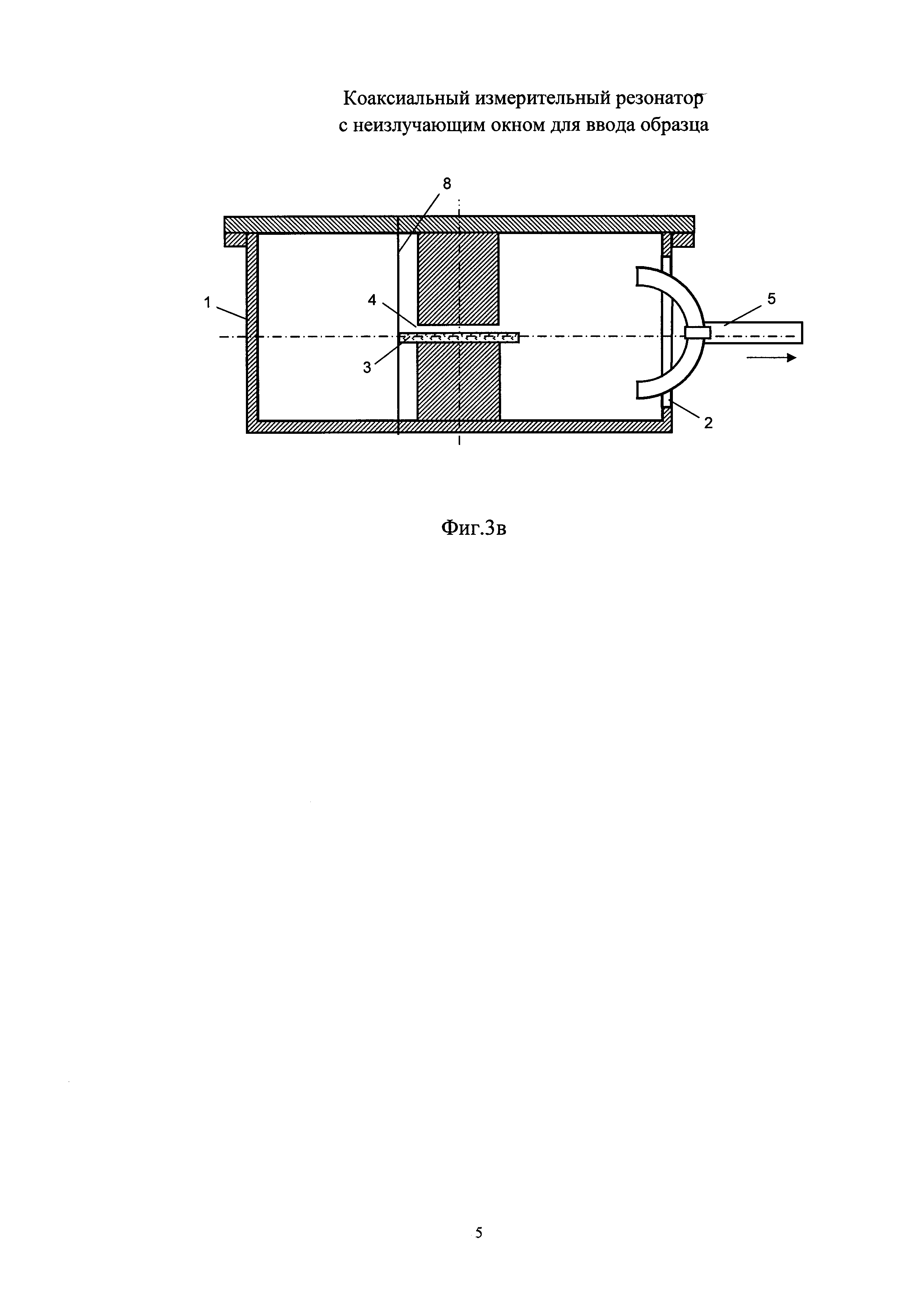 1. Коаксиальный измерительный резонатор с цилиндрическим корпусом, центральным соосным проводником в виде двух электродов с измерительным зазором между ними и окном в корпусе резонатора для ввода измеряемого образца в зазор между электродами, отличающийся тем, что окно для ввода измеряемого образца выполнено в виде неизлучающей щели, параллельной линиям поверхностного тока в корпусе резонатора, диаметр электродов di выбран меньше диаметра измеряемого дискового образца ds, внутренний диаметр корпуса резонатора D выбран из соотношения D≥di+2ds и для центрирования образца в измерительном зазоре в резонатор введены тонкие диэлектрические нити, расположенные параллельно центральному проводнику резонатора на полуокружности с диаметром dc≈ds и общим с электродами центром. 2. Резонатор по п. 1, отличающийся тем, что на внешней поверхности резонатора размещены источники света и видеокамера, которые через отверстия в корпусе резонатора обеспечивают подсветку и визуальное наблюдение процесса ввода образца в измерительный зазор резонатора и вывода его обратно. 3. Резонатор по п. 1, отличающийся тем, что перед окном для ввода образца установлена направляющая для держателя образца, обеспечивающая поворот образца внутри резонатора и точный ввод образца в измерительный зазор.