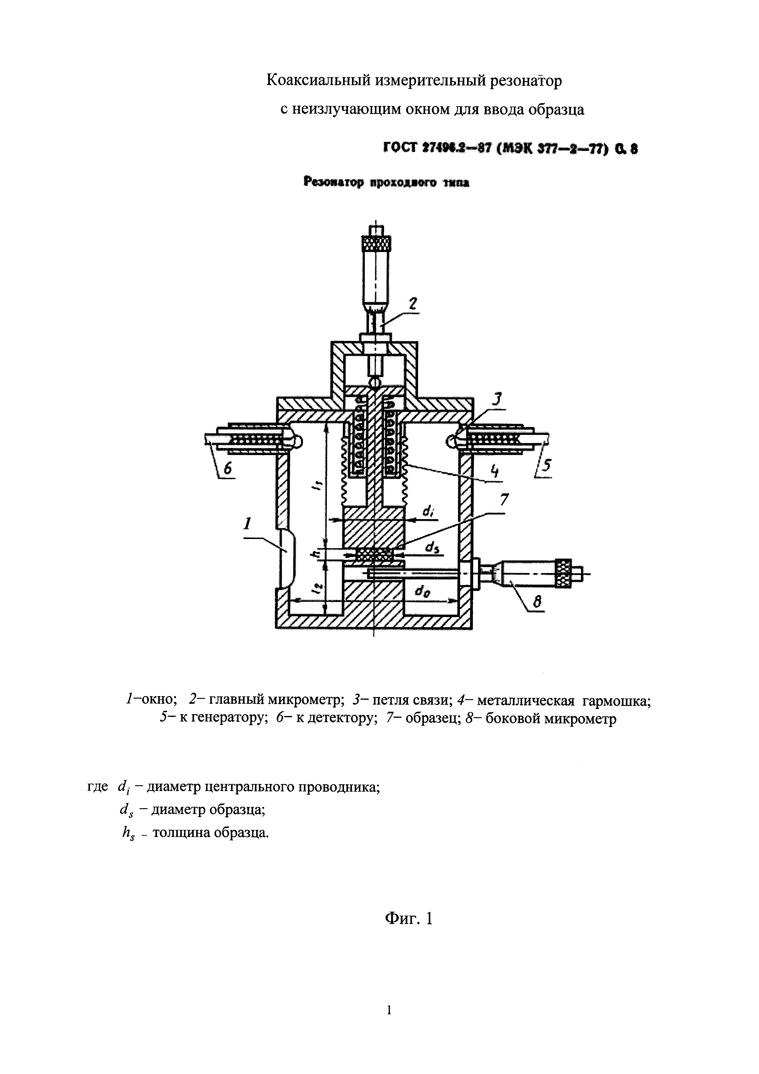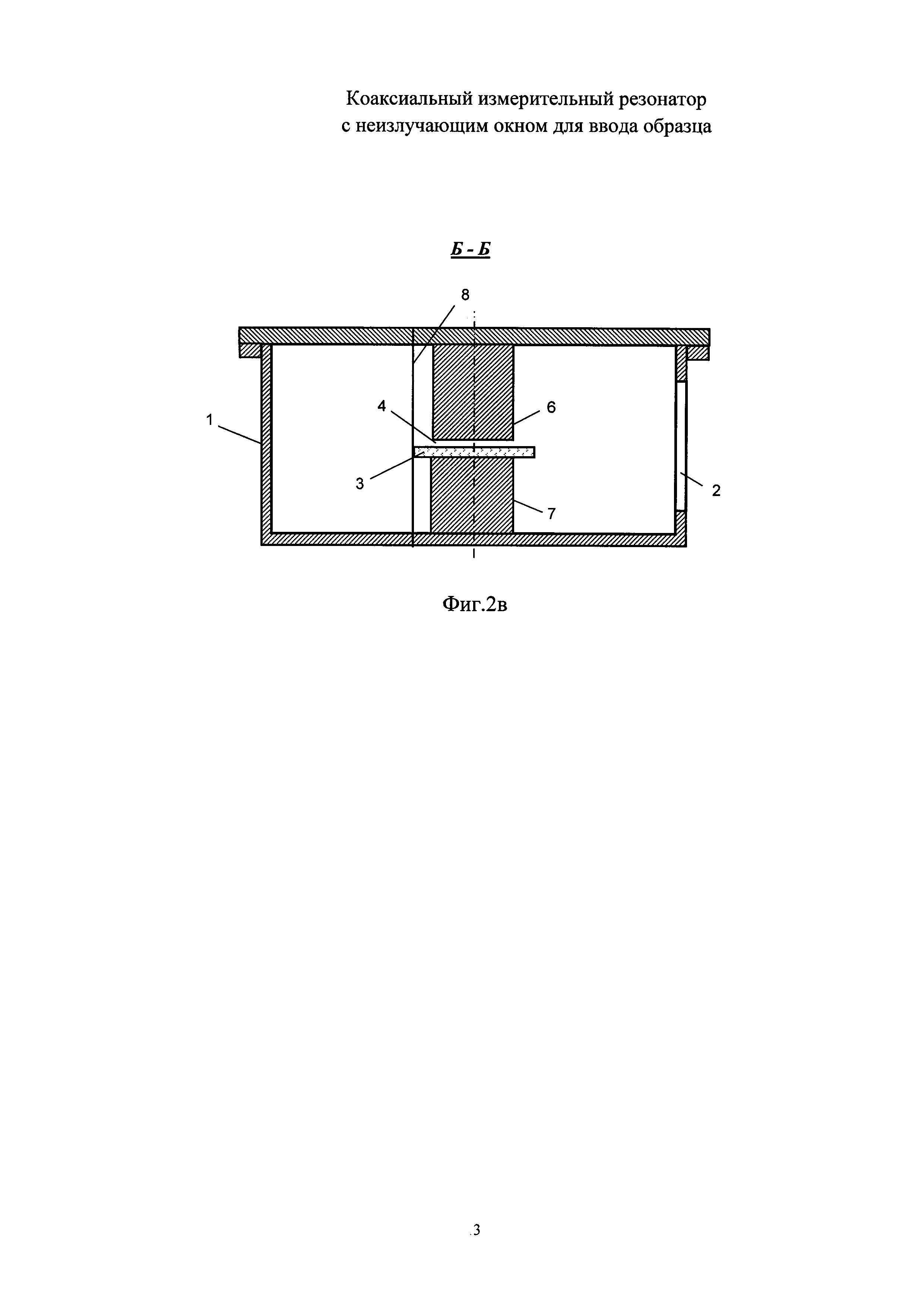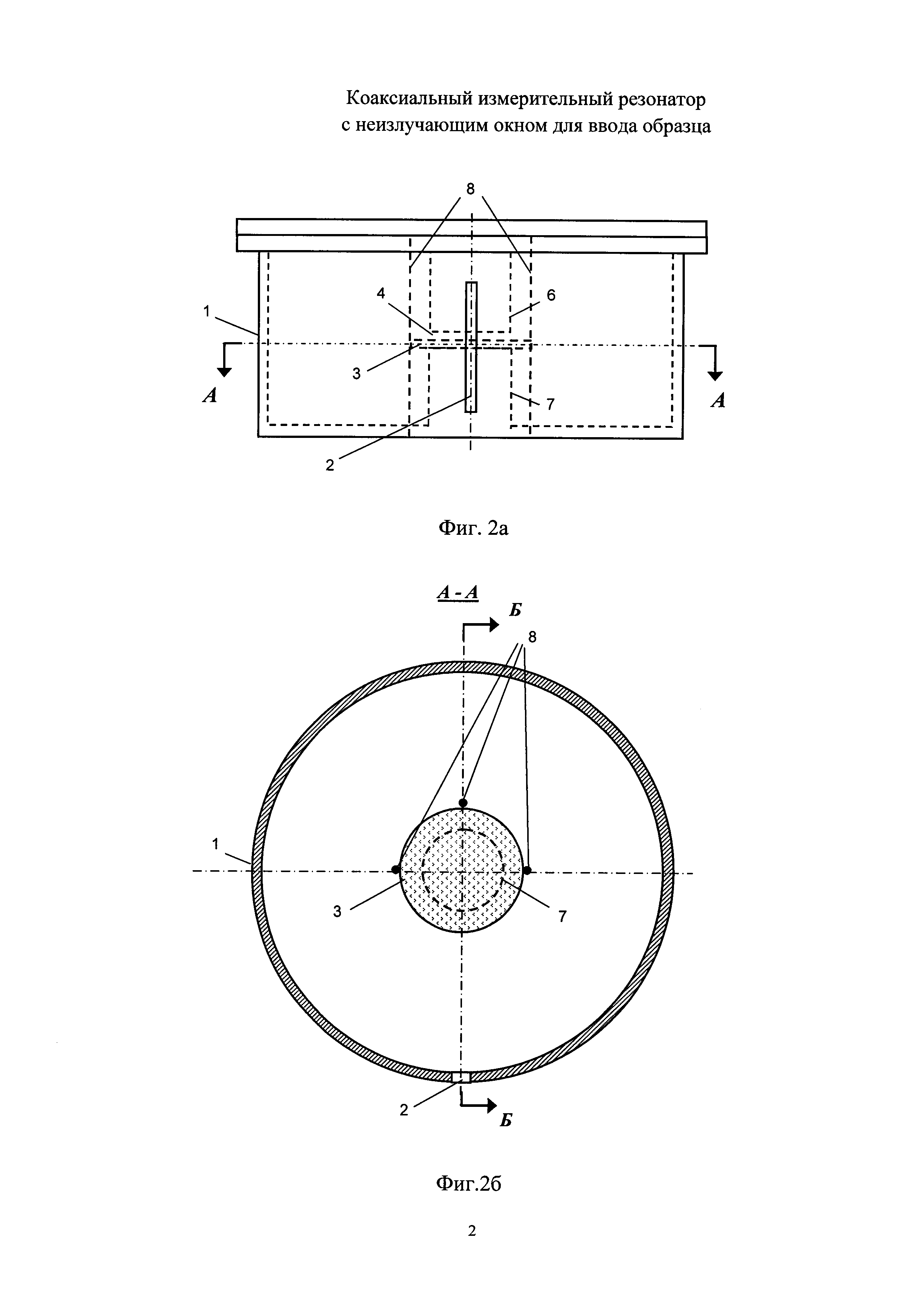 1. Коаксиальный измерительный резонатор с цилиндрическим корпусом, центральным соосным проводником в виде двух электродов с измерительным зазором между ними и окном в корпусе резонатора для ввода измеряемого образца в зазор между электродами, отличающийся тем, что окно для ввода измеряемого образца выполнено в виде неизлучающей щели, параллельной линиям поверхностного тока в корпусе резонатора, диаметр электродов di выбран меньше диаметра измеряемого дискового образца ds, внутренний диаметр корпуса резонатора D выбран из соотношения D≥di+2ds и для центрирования образца в измерительном зазоре в резонатор введены тонкие диэлектрические нити, расположенные параллельно центральному проводнику резонатора на полуокружности с диаметром dc≈ds и общим с электродами центром. 2. Резонатор по п. 1, отличающийся тем, что на внешней поверхности резонатора размещены источники света и видеокамера, которые через отверстия в корпусе резонатора обеспечивают подсветку и визуальное наблюдение процесса ввода образца в измерительный зазор резонатора и вывода его обратно. 3. Резонатор по п. 1, отличающийся тем, что перед окном для ввода образца установлена направляющая для держателя образца, обеспечивающая поворот образца внутри резонатора и точный ввод образца в измерительный зазор.
