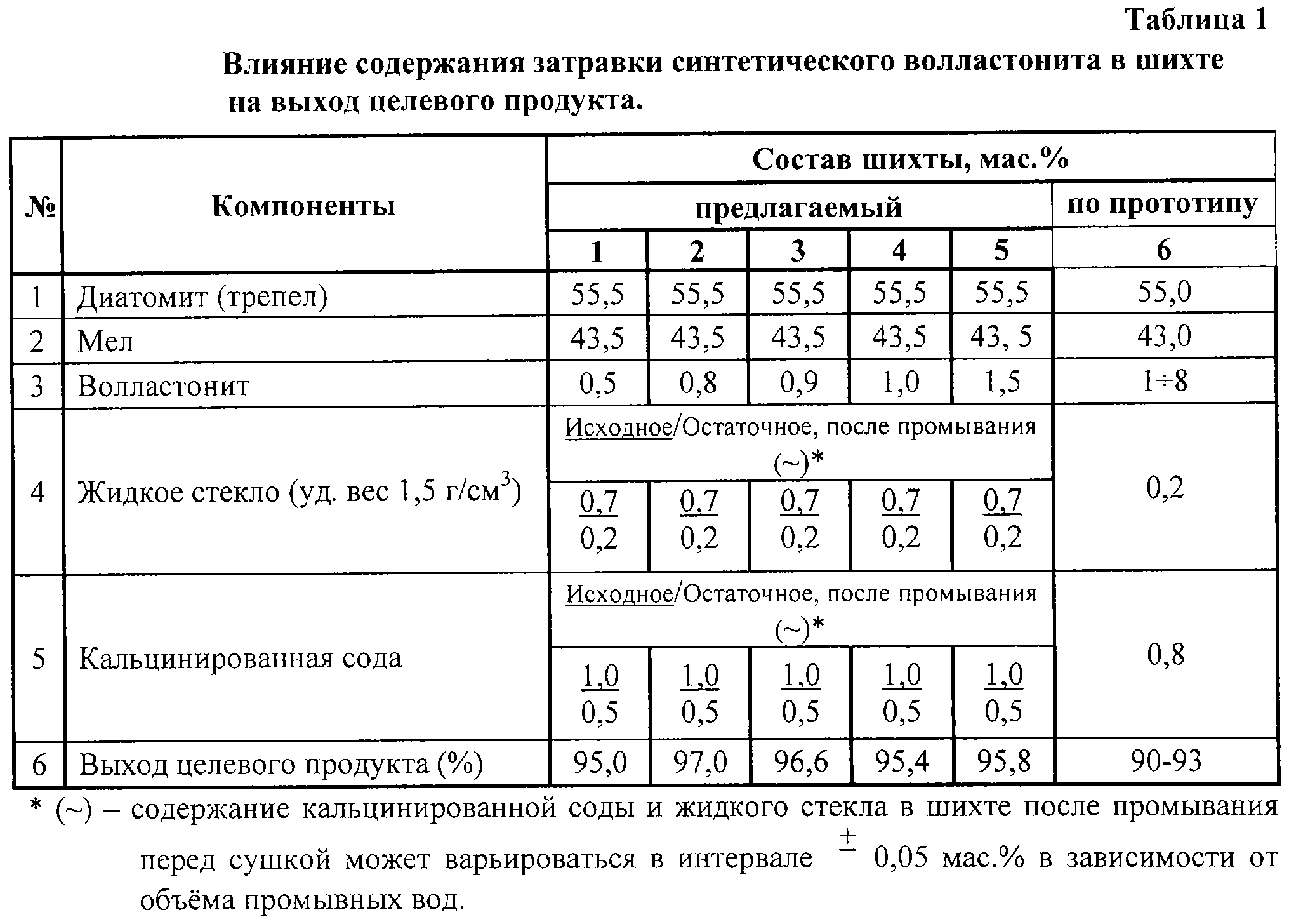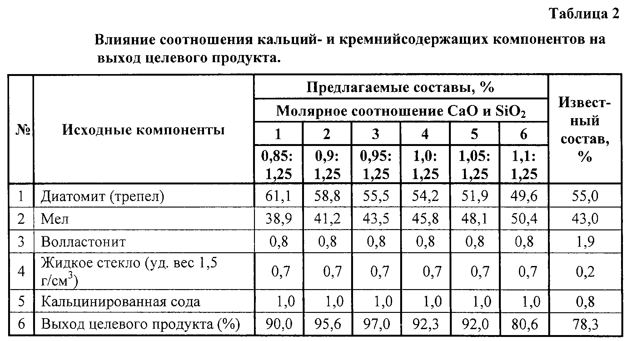 происходит синтез волластонита. Содержание волластонита в готовом материале составляет 90-93%. Наиболее существенные недостатки прототипа: невысокий выход целевого продукта,