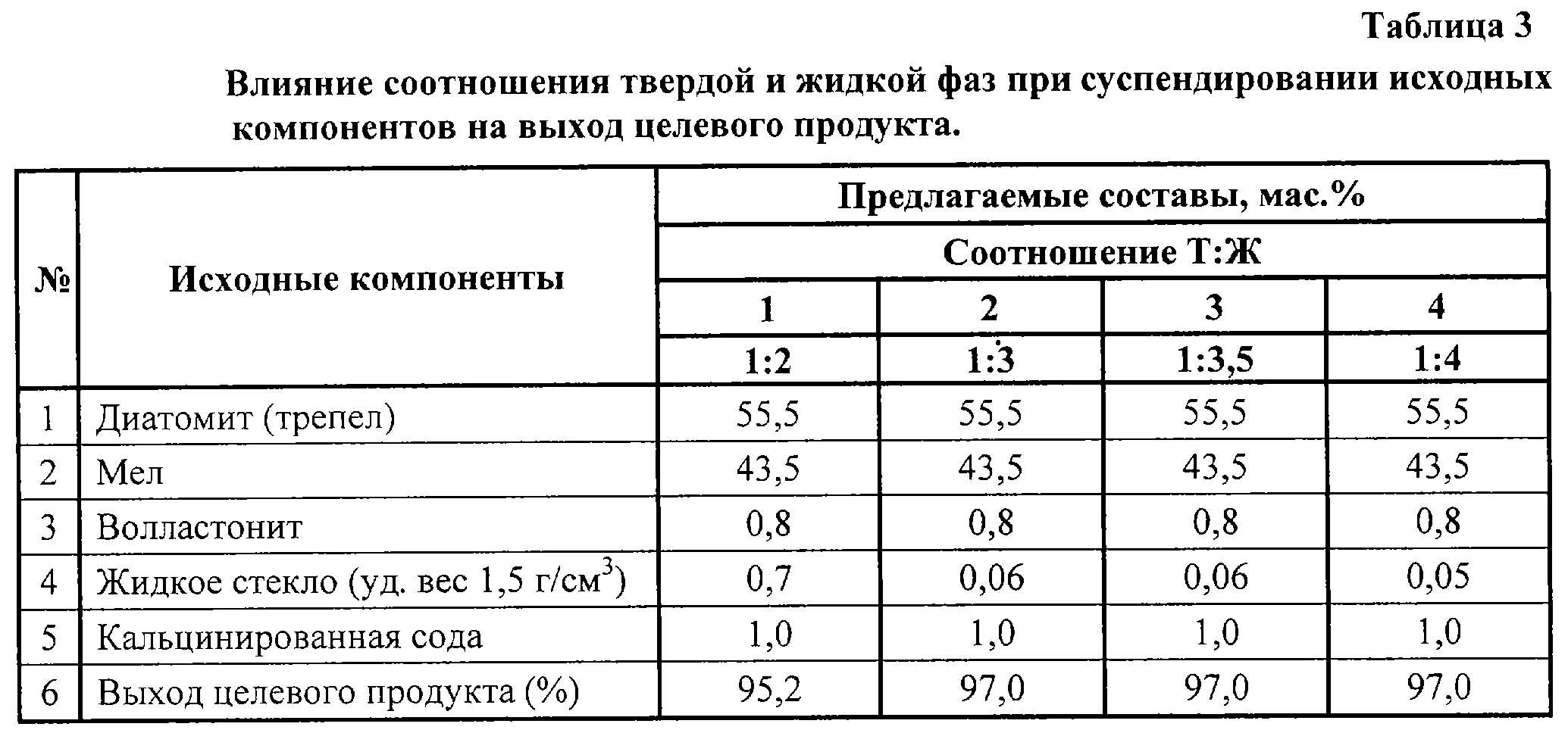 Осуществляют аналогично примеру 1 с той лишь разницей, что навески диатомита и мела суспендируют в 160 мл воды (соотношение Т:Ж=1:2). Суммарное содержание примесей в целевом продукте более 4,7 мас.%.