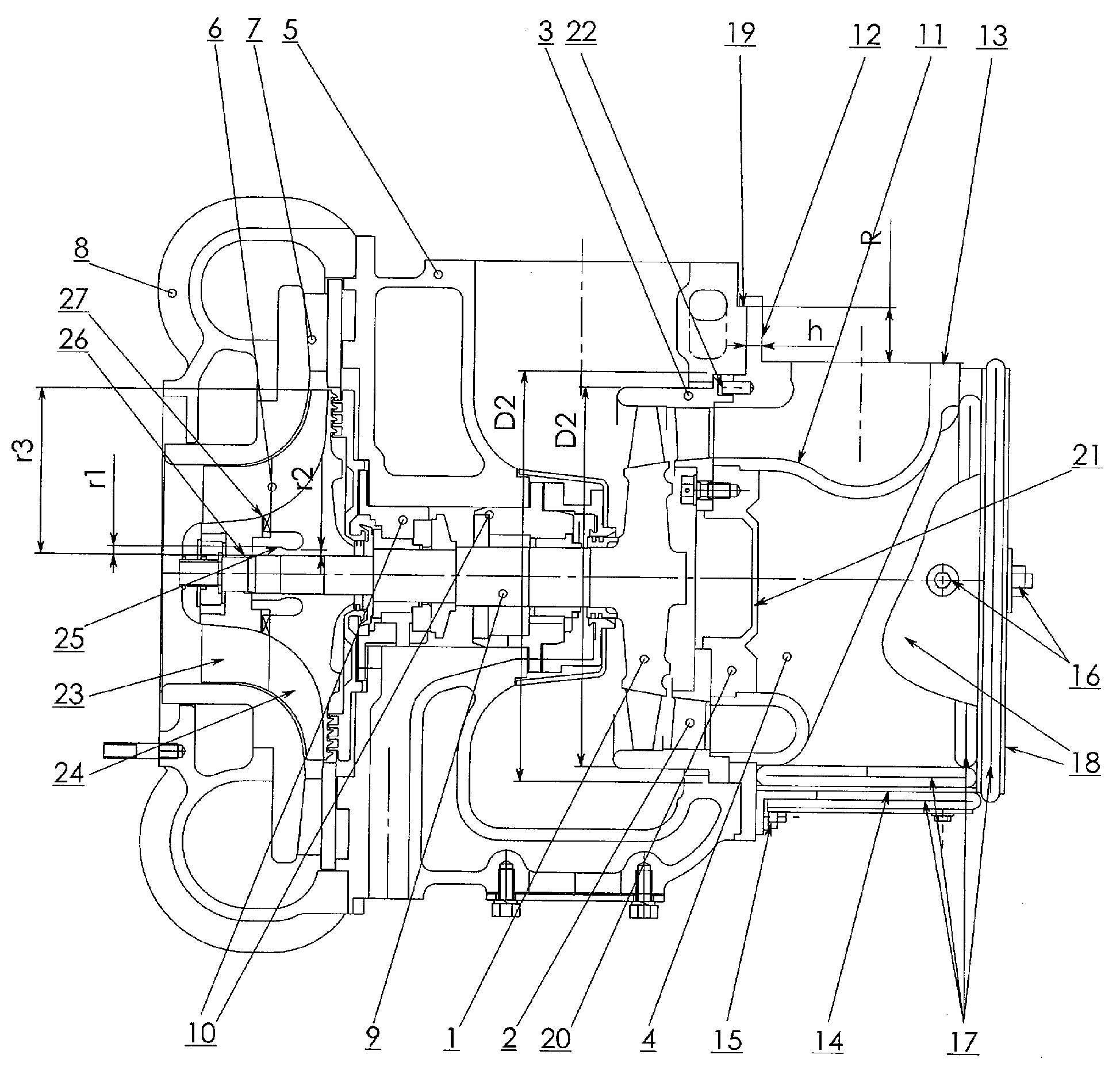 назначения являются устройства, содержащие турбину, состоящую из рабочего колеса с лопатками 1, лопаточного соплового аппарата 2 с кожухом 3, газоприемного 4 и выхлопного 5 корпусов, и компрессора,