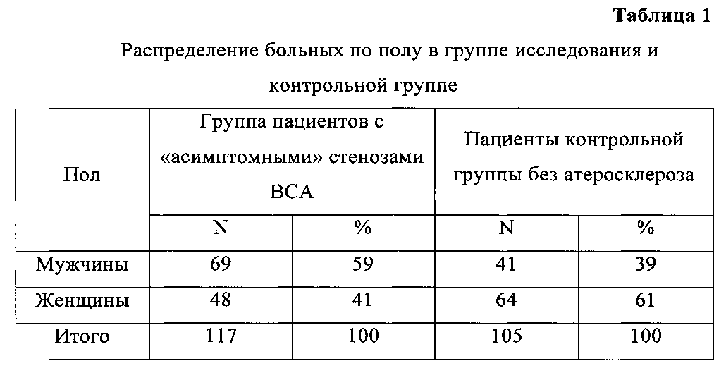 Изобретение относится к области медицины, в частности к неврологии, и может быть использовано для диагностики течения «асимптомного» каротидного атеросклероза. Важнейшей и клинически значимой локализацией атеросклеротических бляшек является область бифуркации общих сонных (каротидных) артерий. Распространенность каротидного атеросклероза составляет 25,4% у мужчин и 26,4% у женщин (в возрасте от 18 до 99 лет) (Prati Ρ, Vanuzzo D, Casaroli M, Di Chiara A, De Biasi F, Feruglio GA, Touboul PJ. Prevalence and determinants of carotid atherosclerosis in a general population. Stroke. 1992 Dec; 23(12): 1705-11). Каротидный атеросклероз - одна из основных причин ишемического инсульта. Развитие ишемических нарушений мозгового кровообращения (НМК) у больных со стенозирующим поражением артерий, кровоснабжающих головной мозг, может реализовываться по всем известным механизмам. Так, в общей структуре всех верифицированных подтипов ишемического инсульта атеротромботический подтип инсульта (по механизму артерио-артериальной эмболии из нестабильной АСБ) встречается в 34% случаев, а гемодинамический инсульт (в результате снижения перфузионного давления на фоне стеноокклюзирующего процесса) - в 15% случаев НМК (Суслина З.А. Сосудистая патология головного мозга: итоги и перспективы. Анналы клинической и экспериментальной неврологии, 2007, 1; 1: 10-16). В то же время процесс атеросклеротического поражения артерий является доминирующим сосудистым процессом при всех гетерогенных подтипах НМК. Исходя из факта наличия или отсутствия в анамнезе данных за ишемический инсульт в заинтересованной зоне кровоснабжения стенозы внутренней сонной артерии (ВСА) подразделяют на «симптомные» и «асимптомные». К «асимптомным» стенозам ВСА относят сужение просвета сонной артерии ≥50% при отсутствии в анамнезе в течение предшествующих 6 месяцев эпизодов ишемии сетчатки (amaurosis ftigax) и/или головного мозга. В общей популяции распространенность «асимптомных» стенозов ВСА составляет: от 0% до 7,5% для стенозов умеренной степени (то есть 50-70%) и 0-3,1% - для выраженных стенозов (≥70%) (den Hartog AG, Achterberg S, Moll FL, Kappelle LJ, Visseren FLJ, van der Graaf Y, et al. Asymptomatic carotid artery stenosis and the risk of ischemic stroke according to subtype in patients with clinically manifest arterial disease. Stroke. 2013; 44: 1002-1007). Имеющийся на сегодняшний день объем научной информации о факторах инициации, развития и прогрессирования атеросклеротического процесса свидетельствует о чрезвычайной сложности и неоднозначности выявляемых клинических и молекулярно-генетических взаимодействий. Известен способ диагностики и прогнозирования течения атеросклеротического процесса, заключающийся в получении образца ткани из стенки артерии в результате проведения биопсии или в ходе хирургической операции, лиофилизации образца, регистрации ЭПР-спектра методом высокочастотного электронного парамагнитного резонанса (ЭПР), измерения времен релаксации парамагнитных комплексов Mn2+ на сертифицированном спектрометре электронного парамагнитного резонанса W-диапазона. При выявлении времени поперечной релаксации ионов Mn2+ меньше 100 не определяют слабую степень кальцификации атеросклеротической бляшки (RU 2468368 C1, 27.11.2012). Однако данный метод не обеспечивает оценку течения «асимптомного» каротидного атеросклероза и используется только для диагностики наличия заболеваний, вызванных атеросклерозом. Кроме того, указанная методика является инвазивной и может быть использована д