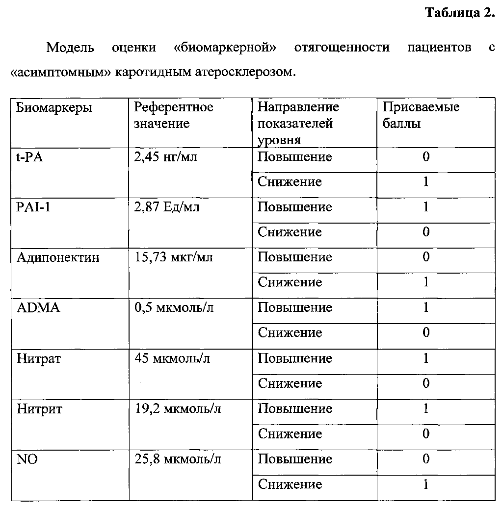 Способ диагностики течения «асимптомного» каротидного атеросклероза, включающий иммуноферментное определение в плазме крови биомаркеров, отличающийся тем, что в плазме крови иммуноферментным методом определяют уровни тканевого активатора плазминогена (t-PA), ингибитора активатора плазминогена (PAI-1), адипонектина, асимметричного диметиларгинина (ADMA) и биохимическим методом в сыворотке крови уровни нитрата, нитрита и оксида азота (NO), причем каждому биомаркеру присваивают 0 или 1 балл в зависимости от его снижения или повышения относительно нормы, а именно при значении уровней t-PA, адипонектина и оксида азота выше нормы этим биомаркерам присваивают 0 баллов, а при их снижении относительно нормы - 1 балл, при значении уровней PAI-1, ADMA, нитрата и нитрита выше нормы данным биомаркерам присваивают 1 балл, а при их снижении относительно нормы - 0 баллов, затем рассчитывают сумму баллов и при ее значении менее 4 баллов диагностируют благоприятное течение «асимптомного» каротидного атеросклероза, а при значении 4 и более - неблагоприятное.