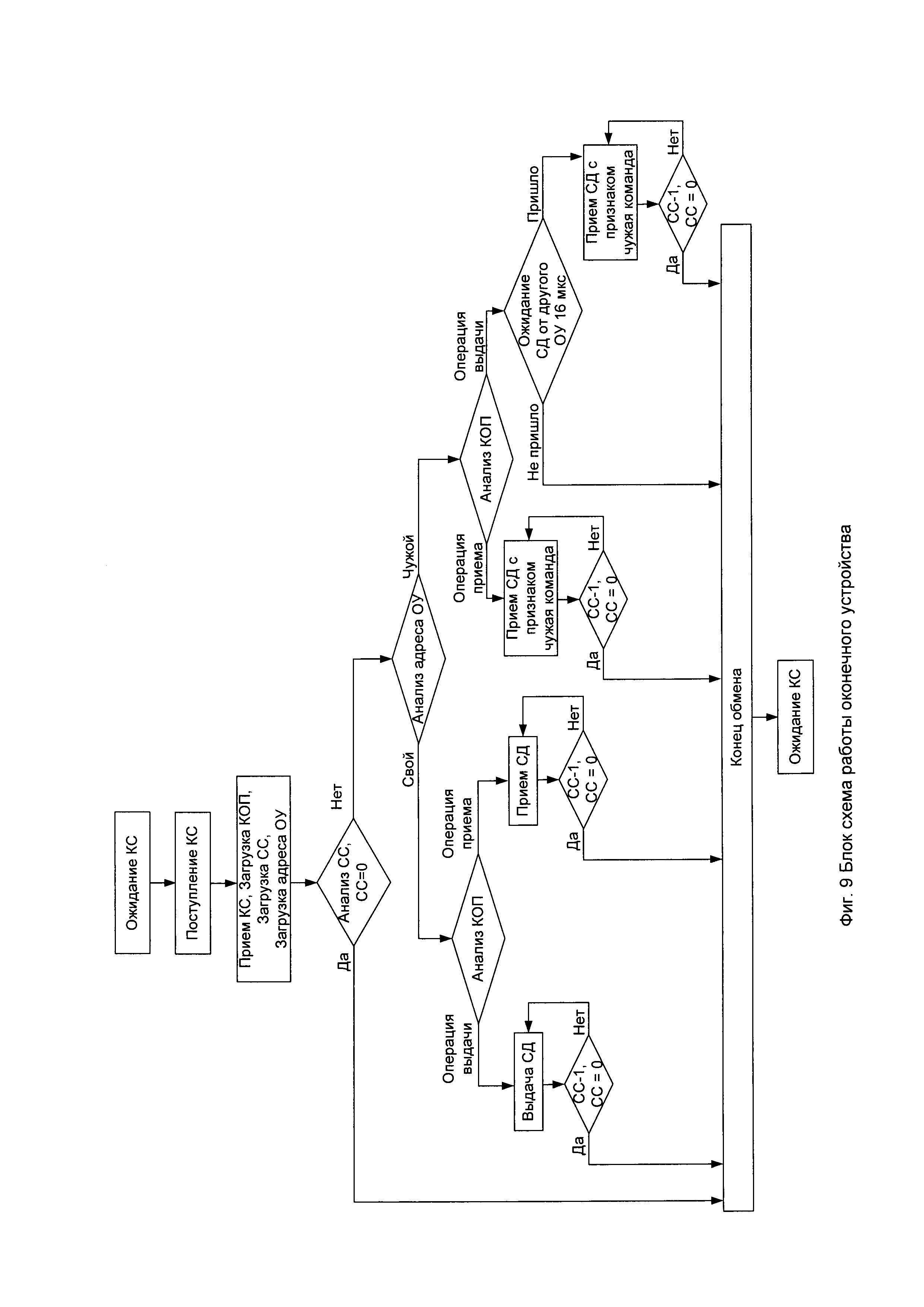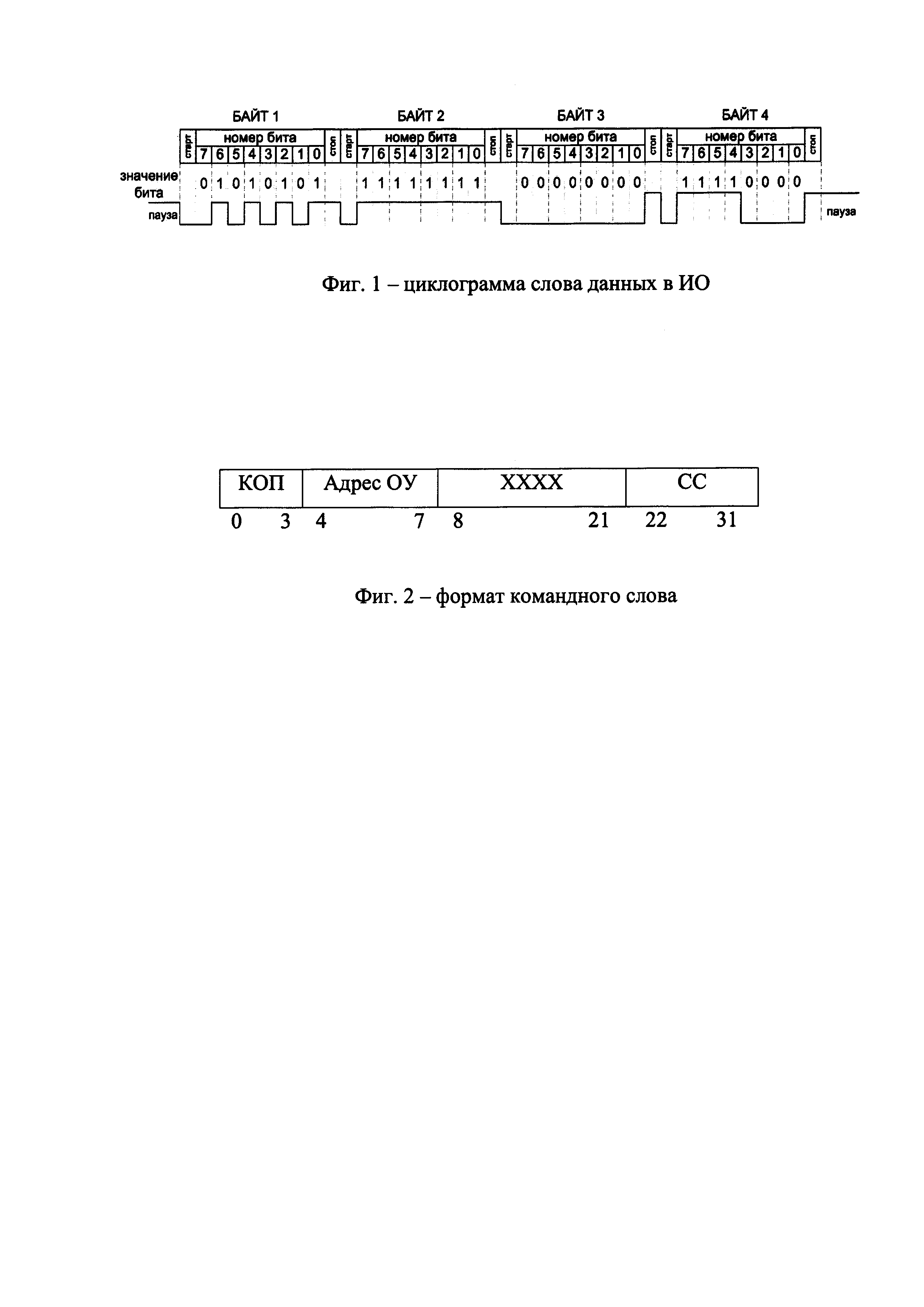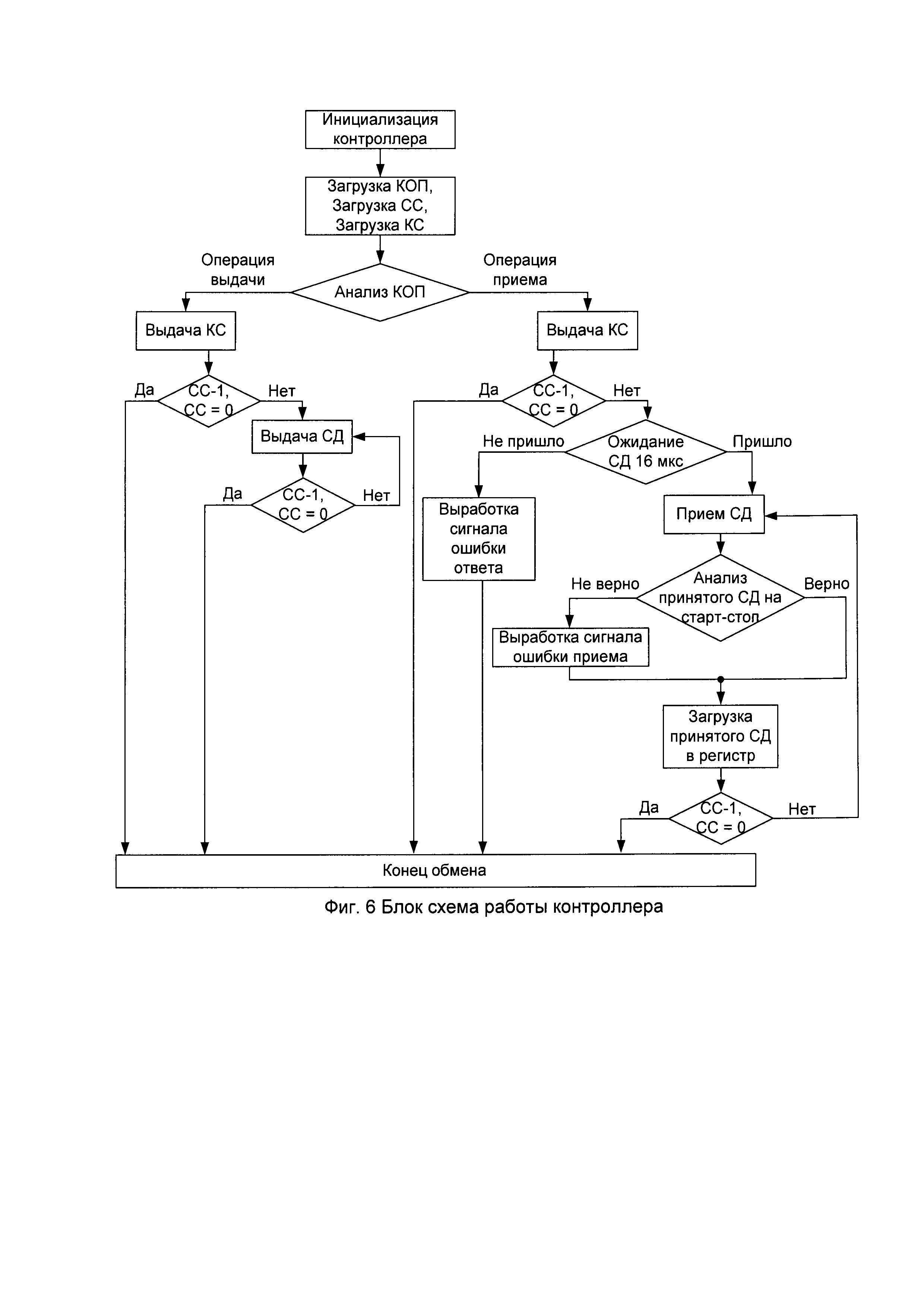 Изобретение относится к цифровой технике в области обмена информацией и может быть использовано в космической, авиационной, кораблестроительной и др. отраслях в качестве интерфейса обмена информацией между контроллером и оконечным устройством (ОУ). Асинхронный последовательный интерфейс обмена (ИО) предназначен для обмена информацией между контроллером и одним оконечным устройством (радиальным) или несколькими оконечными устройствами (магистральными с гальванической развязкой). Обмен информацией ведется 32-х разрядными словами, разделенными на байты и дополненными стартовым и стоповым битами. Инициализатором обмена всегда выступает контроллер, который выдает командное слово (КС) для ОУ. В КС передается код операции (КОП), адрес ОУ и количество слов для обмена. Получив КС, ОУ сравнивает адрес в КС с собственным адресом, после чего выполняет его (адрес совпадает) или игнорирует (чужой адрес). Если в КОП заложена операция приема, то ОУ принимает указанное в КС количество слов данных (СД), если операция выдачи, то ОУ выдает указанное количество СД. Наиболее близкими аналогами способа являются радиальный интерфейс RS232 и магистральный интерфейс RS485 (А. Лапин, Интерфейсы. Выбор и реализация - М.: Техносфера, 2005, стр. 46-53). Данные интерфейсы универсальны, имеют набор стандартных скоростей обмена, при использовании гальванической развязки (RS485) возможно передавать информацию на расстояние до 1200 м. Недостатками данных интерфейсов являются малая скорость обмена на стандартном ряде частот, а также использование стандартного ряда частот не кратного 1 кГц, что существенно усложняет процесс синхронизации с тактовой частотой процессора, кратной 1 МГц. Прототипом контроллера и оконечного устройства является контроллер для выдачи и приема информации по последовательному асинхронному интерфейсу, представленные в пособии к курсам «Микропроцессорная техника» и «Автоматизированные системы для научных исследований» Ершова Н.Ю., Ивашенков О.Н., Курсков С.Ю. «Микропроцессоры» (http://dfe.petrsu.ru/koi/posob/microcpu/index.html) на рис. 3.8 и 3.9. Недостатками аналогов является отсутствие возможности передачи информации с минимальным количеством сигналов между устройствами. Задача изобретения - создание надежного асинхронного интерфейса и необходимых для его работы контроллера и ОУ, которые обеспечат обмен 32-х разрядными словами с высокой скоростью передачи информации с минимальным количеством сигналов между устройствами. Для решения задачи был разработан способ и устройства (контроллер и ОУ), предназначенные для обмена информацией без гальванической развязки и расположенные на расстоянии до 1,5 метров. Возможно введение гальванической развязки, что увеличивает расстояние до 10 метров. Асинхронный последовательный интерфейс обмена устанавливает следующие правила взаимодействия контроллера и ОУ: обмен всегда ведется 32-х разрядными словами, разделенными на байты, каждый байт сопровождается одним стартовым и одним стоповым битами и выдается последовательным кодом младшими разрядами вперед, начиная со старшего байта. Информация передается на частоте 4 МГц. Скорость передачи одного информационного, стартового или стопового бита 0,25 мкс. Скорость обмена 4 Мбод. Стартовый бит всегда передается низким уровнем, стоповый - высоким уровнем. Отсутствие данных (пауза) п