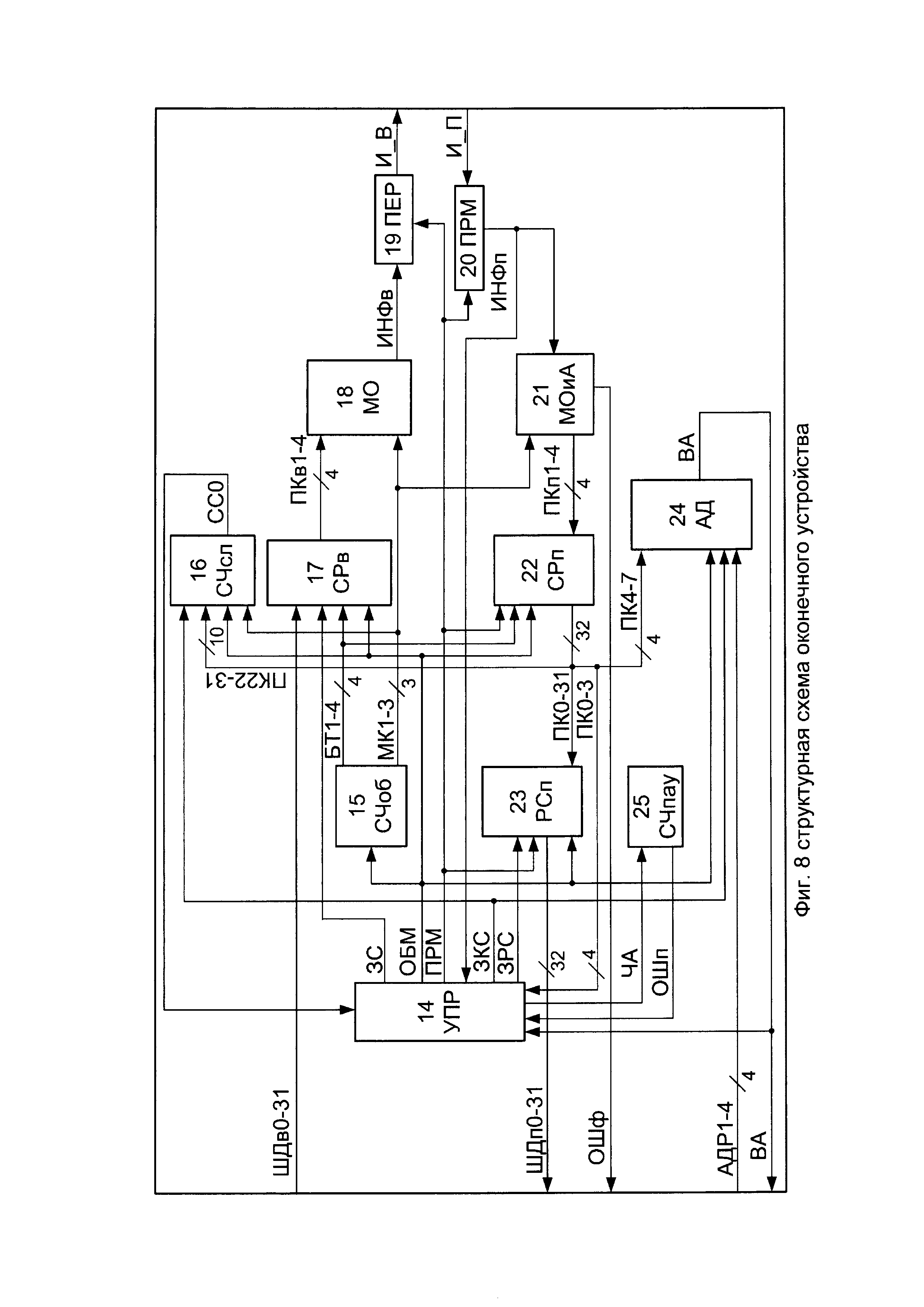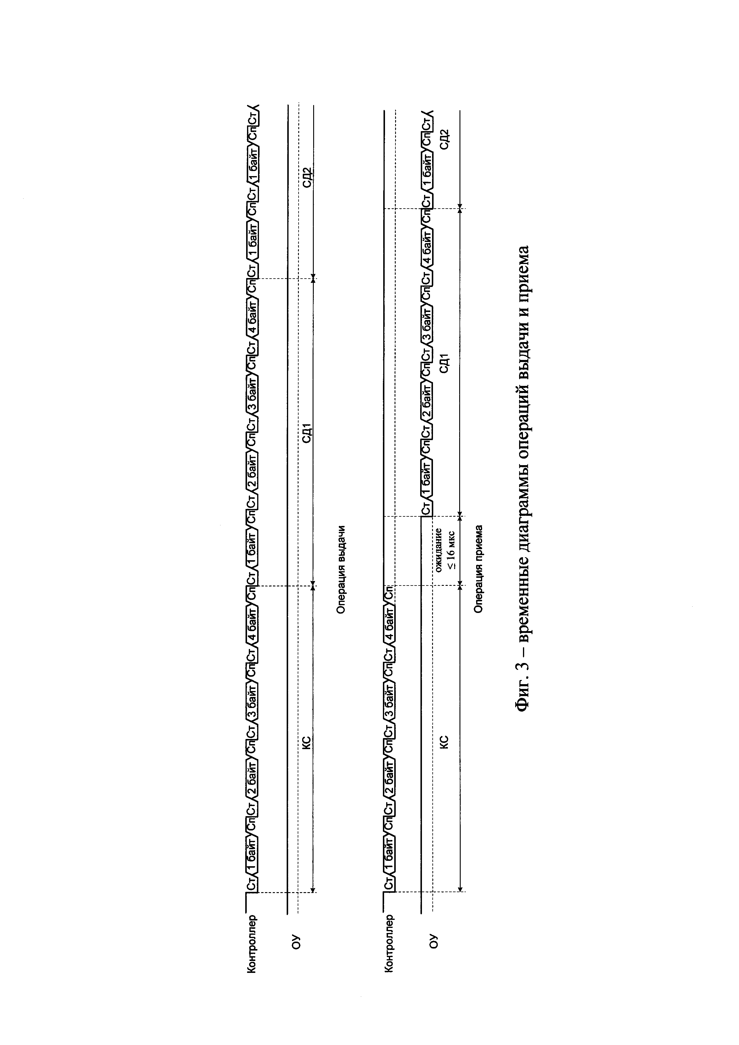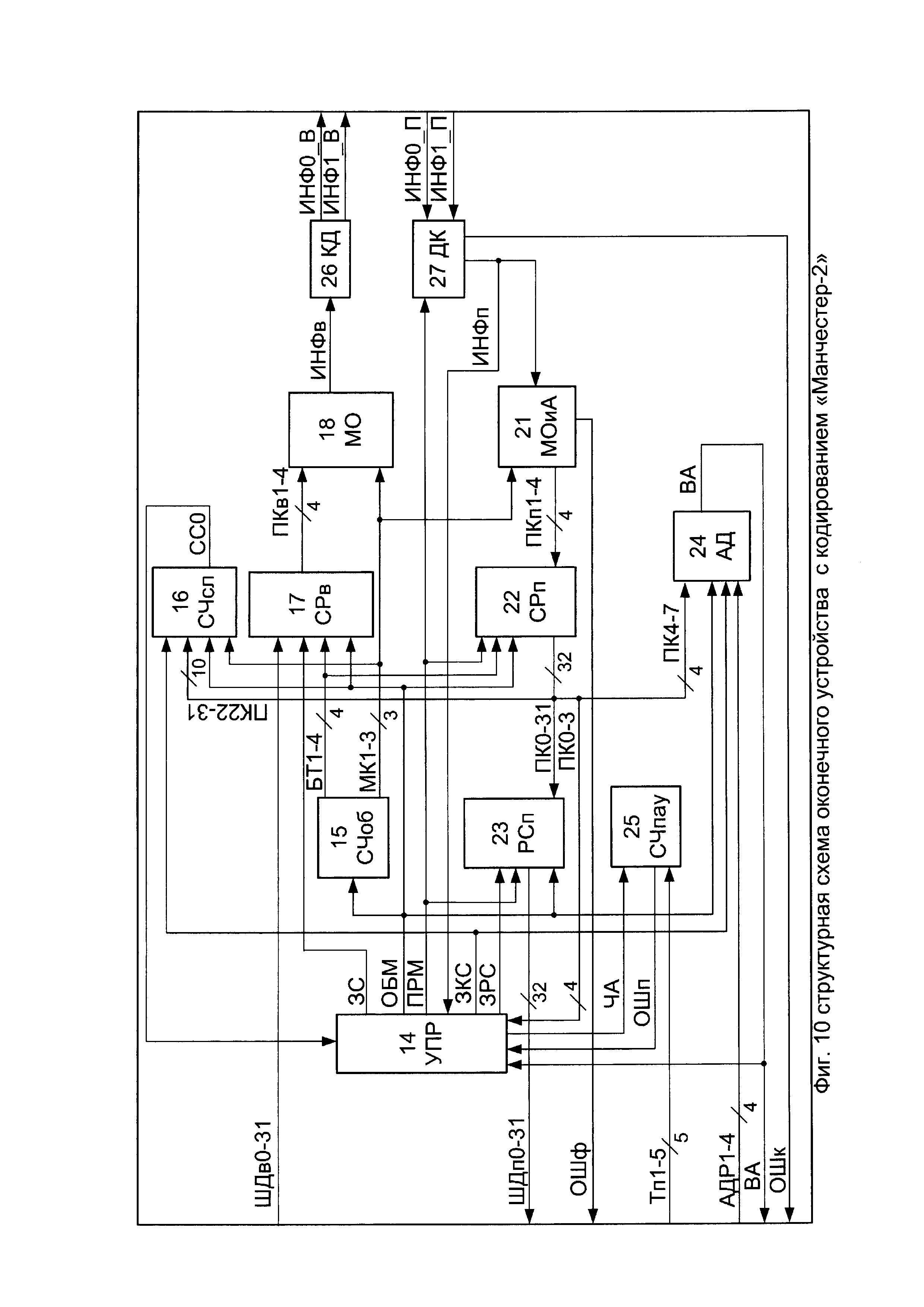 Изобретение относится к цифровой технике в области обмена информацией и может быть использовано в космической, авиационной, кораблестроительной и др. отраслях в качестве интерфейса обмена информацией между контроллером и оконечным устройством (ОУ). Асинхронный последовательный интерфейс обмена (ИО) предназначен для обмена информацией между контроллером и одним оконечным устройством (радиальным) или несколькими оконечными устройствами (магистральными с гальванической развязкой). Обмен информацией ведется 32-х разрядными словами, разделенными на байты и дополненными стартовым и стоповым битами. Инициализатором обмена всегда выступает контроллер, который выдает командное слово (КС) для ОУ. В КС передается код операции (КОП), адрес ОУ и количество слов для обмена. Получив КС, ОУ сравнивает адрес в КС с собственным адресом, после чего выполняет его (адрес совпадает) или игнорирует (чужой адрес). Если в КОП заложена операция приема, то ОУ принимает указанное в КС количество слов данных (СД), если операция выдачи, то ОУ выдает указанное количество СД. Наиболее близкими аналогами способа являются радиальный интерфейс RS232 и магистральный интерфейс RS485 (А. Лапин, Интерфейсы. Выбор и реализация - М.: Техносфера, 2005, стр. 46-53). Данные интерфейсы универсальны, имеют набор стандартных скоростей обмена, при использовании гальванической развязки (RS485) возможно передавать информацию на расстояние до 1200 м. Недостатками данных интерфейсов являются малая скорость обмена на стандартном ряде частот, а также использование стандартного ряда частот не кратного 1 кГц, что существенно усложняет процесс синхронизации с тактовой частотой процессора, кратной 1 МГц. Прототипом контроллера и оконечного устройства является контроллер для выдачи и приема информации по последовательному асинхронному интерфейсу, представленные в пособии к курсам «Микропроцессорная техника» и «Автоматизированные системы для научных исследований» Ершова Н.Ю., Ивашенков О.Н., Курсков С.Ю. «Микропроцессоры» (http://dfe.petrsu.ru/koi/posob/microcpu/index.html) на рис. 3.8 и 3.9. Недостатками аналогов является отсутствие возможности передачи информации с минимальным количеством сигналов между устройствами. Задача изобретения - создание надежного асинхронного интерфейса и необходимых для его работы контроллера и ОУ, которые обеспечат обмен 32-х разрядными словами с высокой скоростью передачи информации с минимальным количеством сигналов между устройствами. Для решения задачи был разработан способ и устройства (контроллер и ОУ), предназначенные для обмена информацией без гальванической развязки и расположенные на расстоянии до 1,5 метров. Возможно введение гальванической развязки, что увеличивает расстояние до 10 метров. Асинхронный последовательный интерфейс обмена устанавливает следующие правила взаимодействия контроллера и ОУ: обмен всегда ведется 32-х разрядными словами, разделенными на байты, каждый байт сопровождается одним стартовым и одним стоповым битами и выдается последовательным кодом младшими разрядами вперед, начиная со старшего байта. Информация передается на частоте 4 МГц. Скорость передачи одного информационного, стартового или стопового бита 0,25 мкс. Скорость обмена 4 Мбод. Стартовый бит всегда передается низким уровнем, стоповый - высоким уровнем. Отсутствие данных (пауза) п