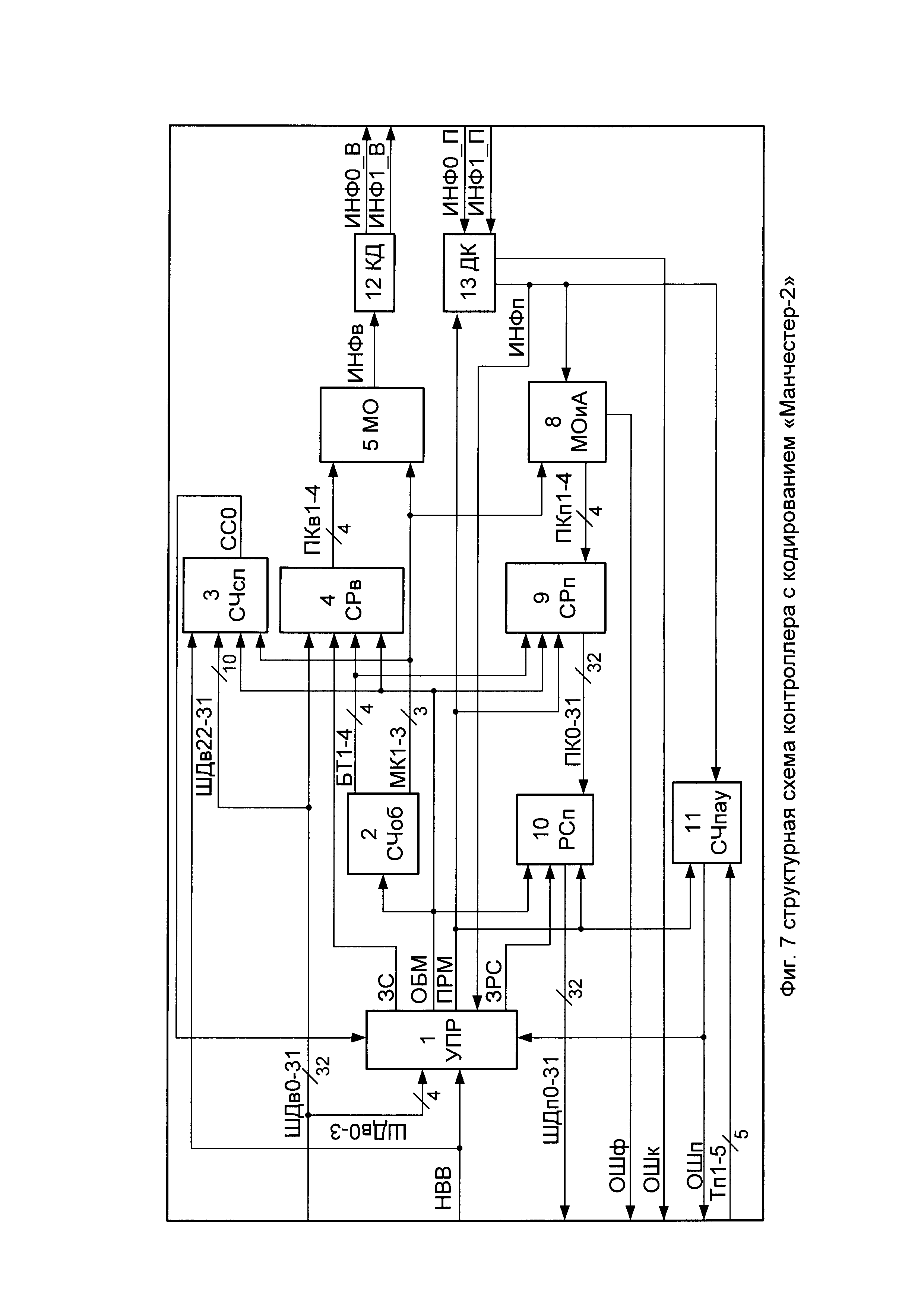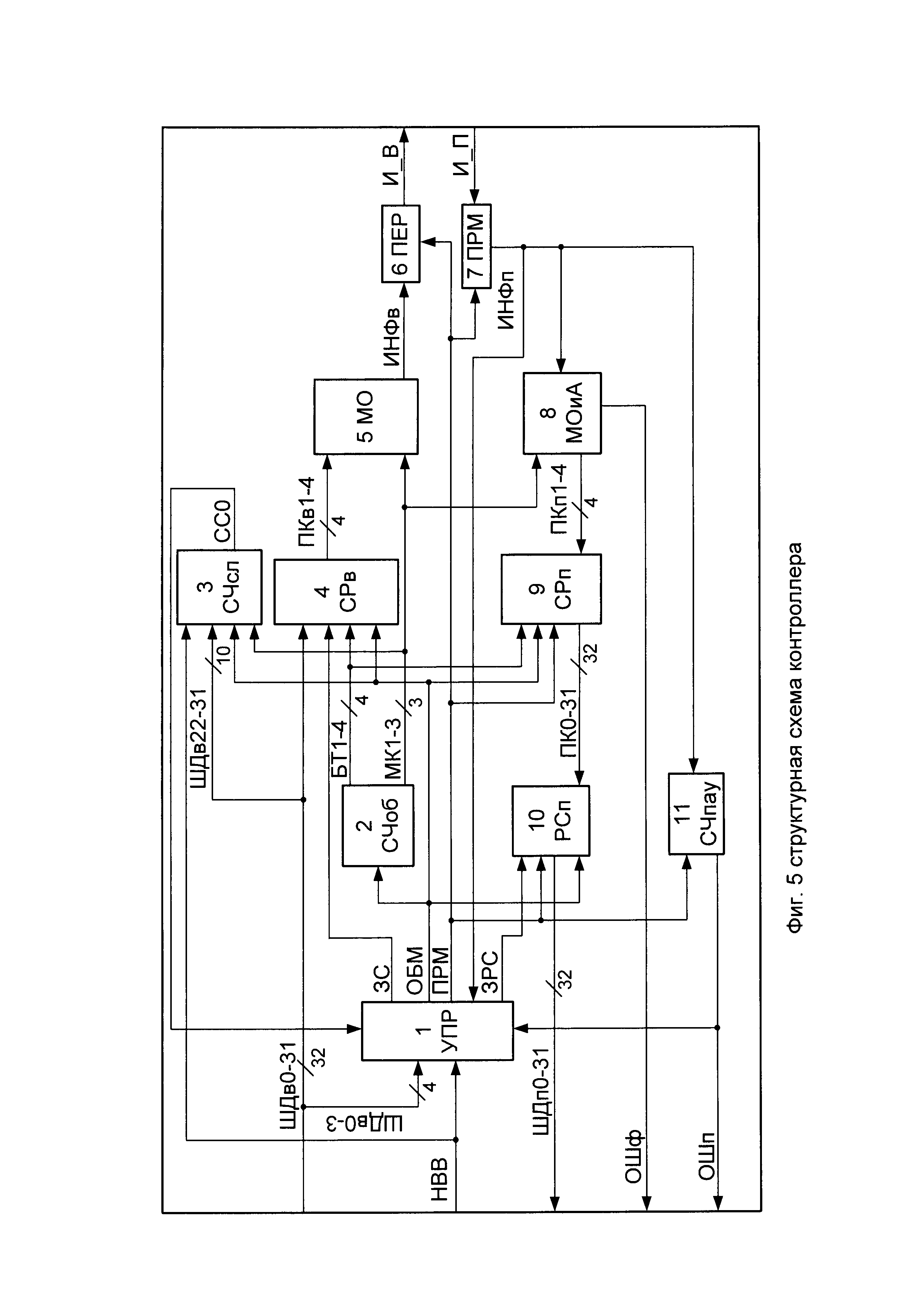 1. Асинхронный последовательный интерфейс обмена информацией, в соответствии с которым контроллер является инициатором обмена информацией и осуществляет обмен 32-разрядными словами, разделенными на байты; контроллер выдает для оконечного устройства командное слово, в котором каждый байт сопровождается стартовым и стоповым битами и выдается последовательным кодом младшими разрядами вперед, начиная со старшего байта; командное слово содержит резервные разряды о количестве слов для обмена, максимальное число которых 1023, направлении обмена и адресе оконечного устройства, которому оно адресовано; в операциях выдачи, после выдачи командного слова, контроллер начинает выдавать слова данных; в операциях приема, после выдачи командного слова, контроллер встает в ожидание слов данных от оконечного устройства; командное слово и слова данных передаются без пауз; стартовый бит передается низким уровнем, стоповый бит и отсутствие информации - высоким уровнем; длительность одного бита 250 нс; оконечное устройство начинает обмен информацией с контроллером при совпадении собственного адреса с указанным в командном слове; при отсутствии слова данных от оконечного устройства 16 мкс контроллер заканчивает текущий обмен. 2. Контроллер, содержащий блок управления, сдвиговый регистр выдачи, сдвиговый регистр приема, регистр принятого слова, отличающийся тем, что сдвиговый регистр выдачи принимает 32 разряда сигнала на выдачу информации, при этом младшие 4 разряда дополнительно поступают на блок управления, а старшие 10 разрядов поступают на счетчик слов, который принимает входной сигнал начала ввода-вывода, также поступающий на блок управления, который вырабатывает сигналы загрузка слова, поступающий на сдвиговый регистр выдачи, сигнал загрузка регистра слова, поступающий на регистр принятого слова, сигнал обмен, поступающий на счетчик обмена, счетчик слов, сдвиговый регистр выдачи, сдвиговый регистр приема и регистр принятого слова, на который также поступает сигнал прием, дополнительно поступающий на счетчик паузы ожидания слова данных, сдвиговый регистр приема, блок приема информации и блок выходной информации с включением 3-го состояния; счетчик обмена вырабатывает 4-разрядный сигнал байт, который поступает на сдвиговый регистр выдачи и на сдвиговый регистр приема и 3-разрядный сигнал маркеров, который поступает на блок мультиплексирования обмена, блок мультиплексирования и анализа принимаемой информации и счетчик слов, вырабатывающий соответствующий сигнал, который равен логическому нулю и поступает на блок управления; сдвиговый регистр выдачи вырабатывает 4-разрядный сигнал последовательного кода выдачи, который поступает на блок мультиплексирования обмена, вырабатывающий сигнал информация на выдачу, поступающий на блок выходной информации с включением 3-го состояния, который вырабатывает сигнал информация выдачи, поступающий на выход устройства; сигнал информация приема поступает в устройство на блок приема информации, который вырабатывает сигнал информация на прием, поступающий на блок управления, счетчик паузы ожидания слова данных и блок мультиплексирования и анализа принимаемой информации, который вырабатывает сигнал ошибка формата, поступающий выходит из устройства и 4-разрядный сигнал последовательног