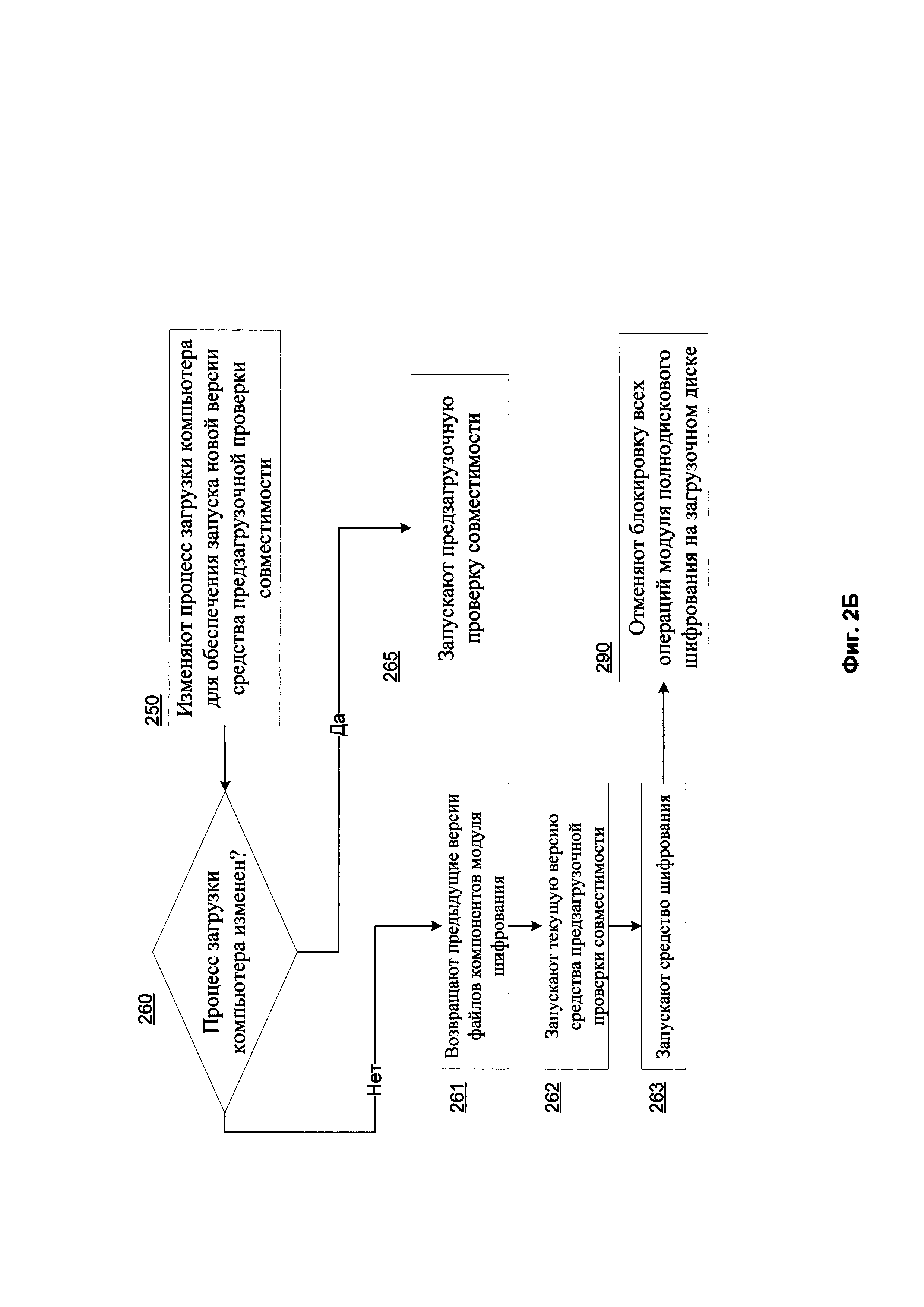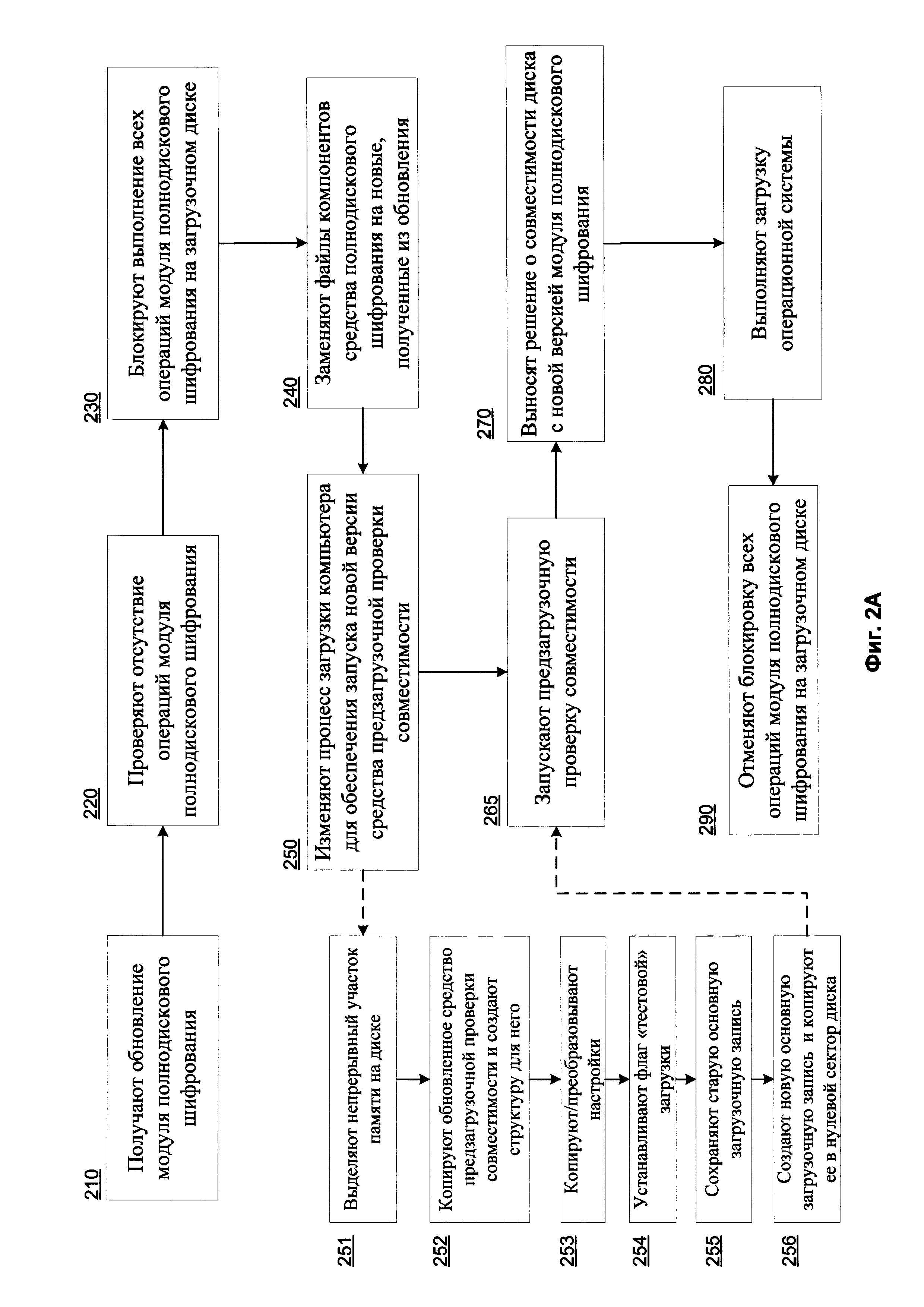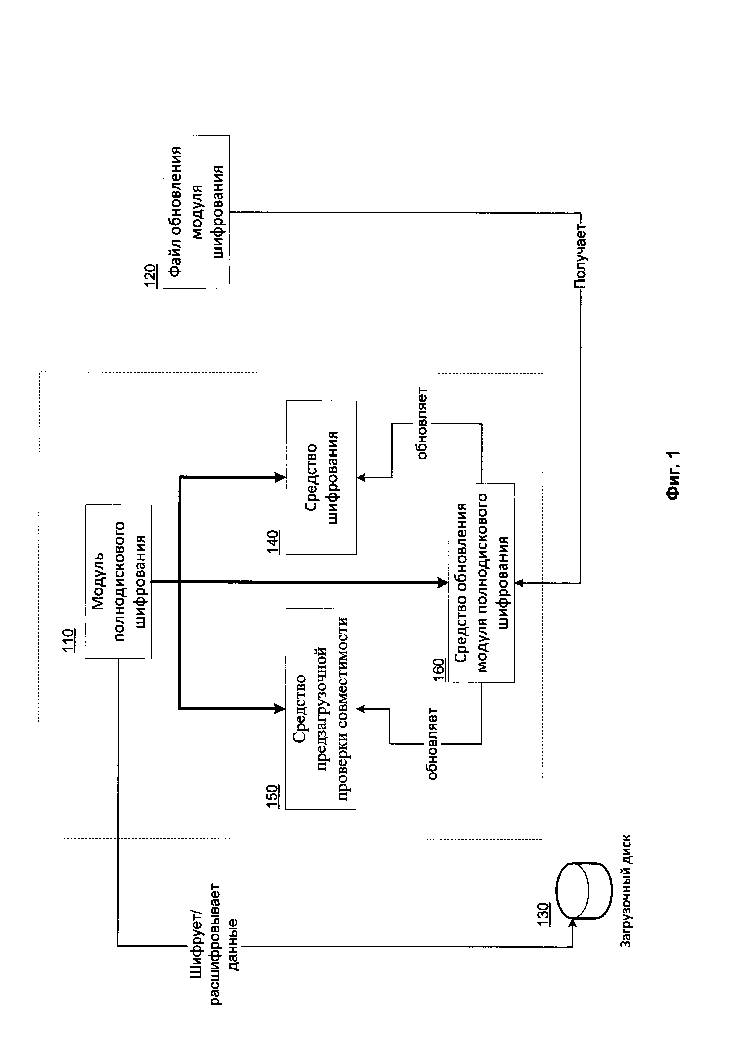1. Способ установки обновления модуля полнодискового шифрования (full disk encryption), в котором: - получают с помощью средства обновления по меньшей мере одно обновление, содержащее новую версию модуля полнодискового шифрования; - перед началом установки обновления блокируют с помощью средства обновления выполнение операций, выполняемых модулем полнодискового шифрования, который предназначен для выполнения операций шифрования и расшифровки данных на дисках; - заменяют с помощью средства обновления модуль полнодискового шифрования на новую версию модуля, полученную из обновления; - изменяют процесс загрузки компьютера с помощью средства обновления для обеспечения запуска новой версии средства предзагрузочной проверки совместимости загрузочного диска с новой версией модуля полнодискового шифрования после инициализации базовой системы ввода-вывода (BIOS) и до запуска операционной системы; - с помощью средства обновления преобразовывают данные аутентификации пользователей, которые используются для последующей расшифровки данных на диске и загрузки операционной системы; - выполняют предзагрузочную проверку совместимости загрузочного диска с новой версией модуля полнодискового шифрования с помощью новой версии средства предзагрузочной проверки совместимости; - выполняют загрузку операционной системы, используя преобразованные данные аутентификации пользователей; - с помощью средства обновления завершают установку обновления модуля полнодискового шифрования, отменяя блокировку всех операций, выполняемых модулем полнодискового шифрования. 2. Способ по п. 1, в котором обновление модуля полнодискового шифрования может быть получено в виде одного или нескольких файлов: - на переносном накопителе; - с сервера локальной сети; - из сети Интернет. 3. Способ по п. 1, в котором операции модуля полнодискового шифрования применяются к загрузочному диску. 4. Способ по п. 3, в котором загрузочный диск считается совместимым с новой версией модуля полнодискового шифрования при выполнении всех условий: - положительный результат выполнения тестов аппаратной совместимости диска с аппаратным обеспечением компьютера; - положительный результат преобразования данных авторизации пользователей, совместимых с текущей версией средства предзагрузочной проверки совместимости, в данные авторизации, совместимые с новой версией средства предзагрузочной проверки совместимости; - соответствие диска политикам шифрования; - соответствие диска политикам безопасности. 5. Способ по п. 1, в котором во время изменения процесса загрузки компьютера не удаляют текущую версию средства предзагрузочной проверки совместимости.